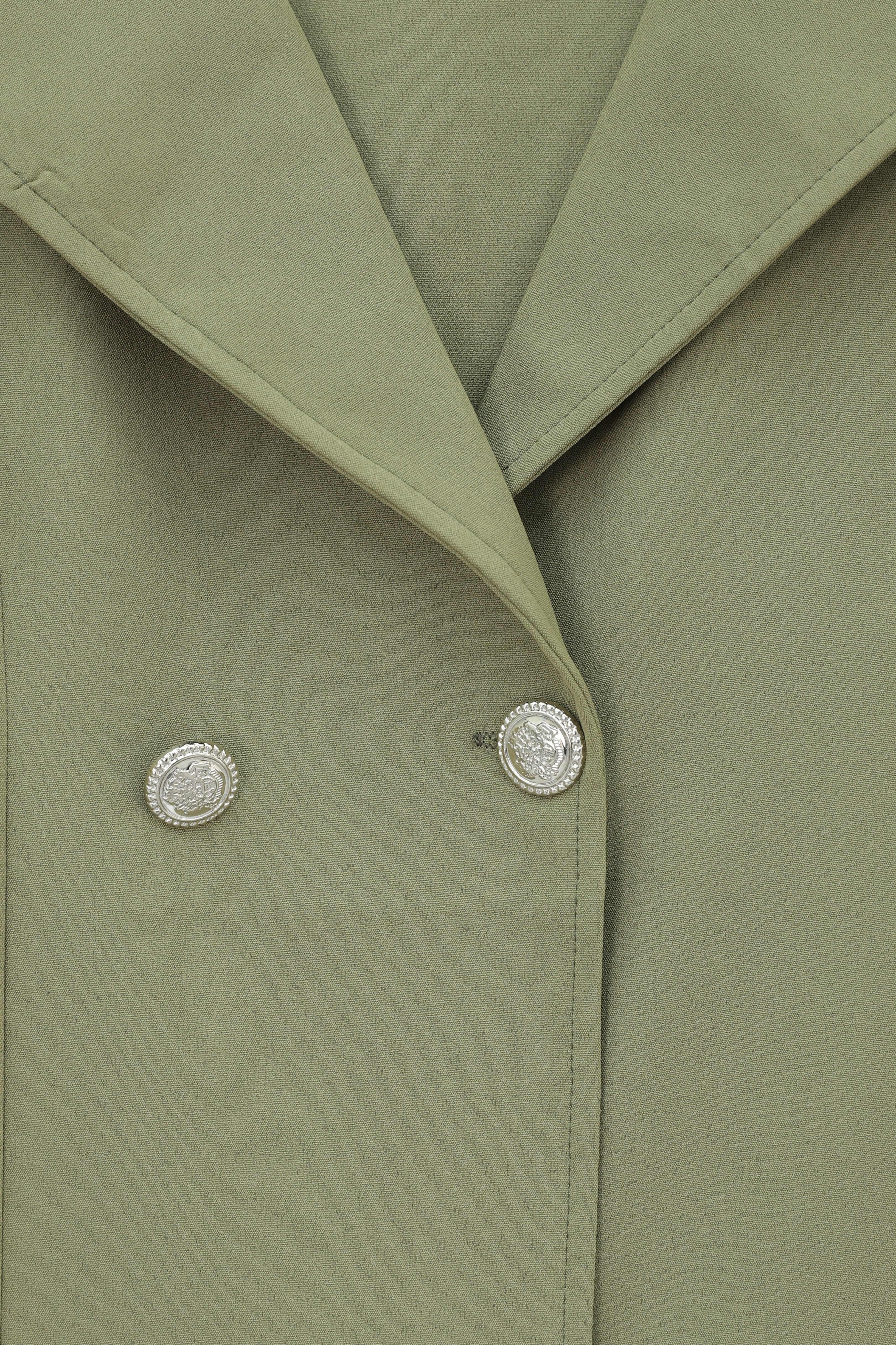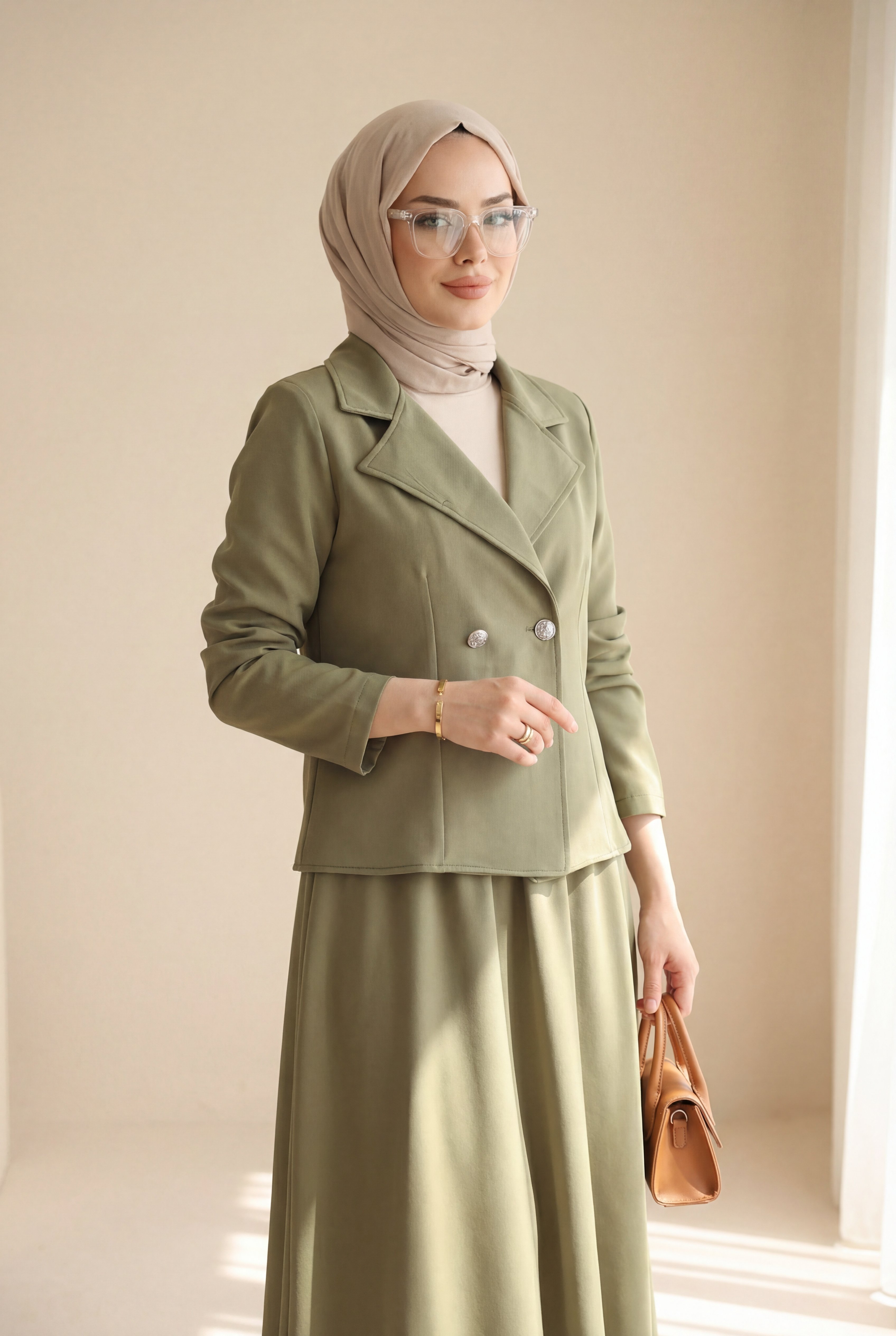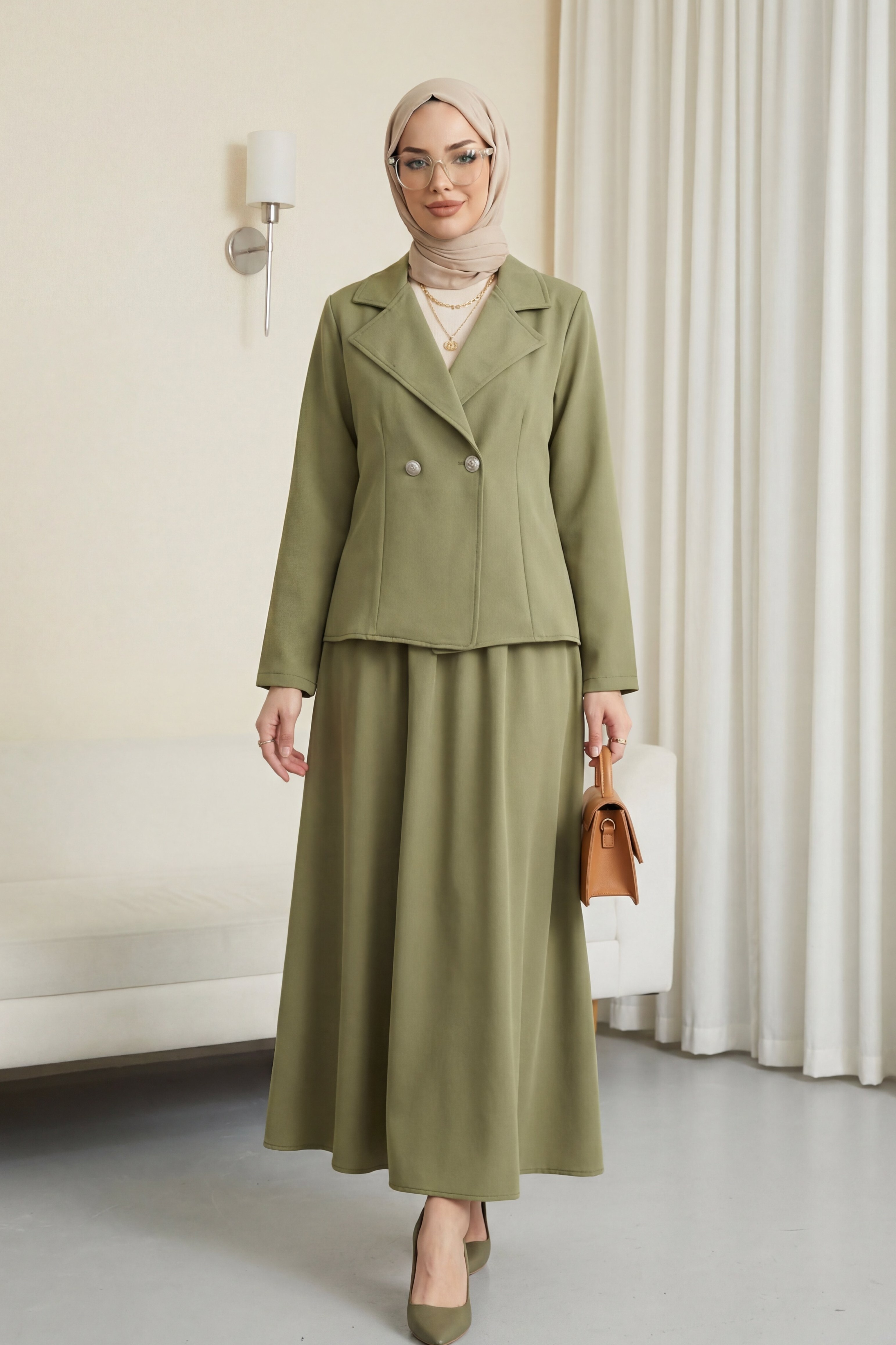 Double-front buttoned, double-breasted collar jacket and skirt set (double crepe). -Cagla Green