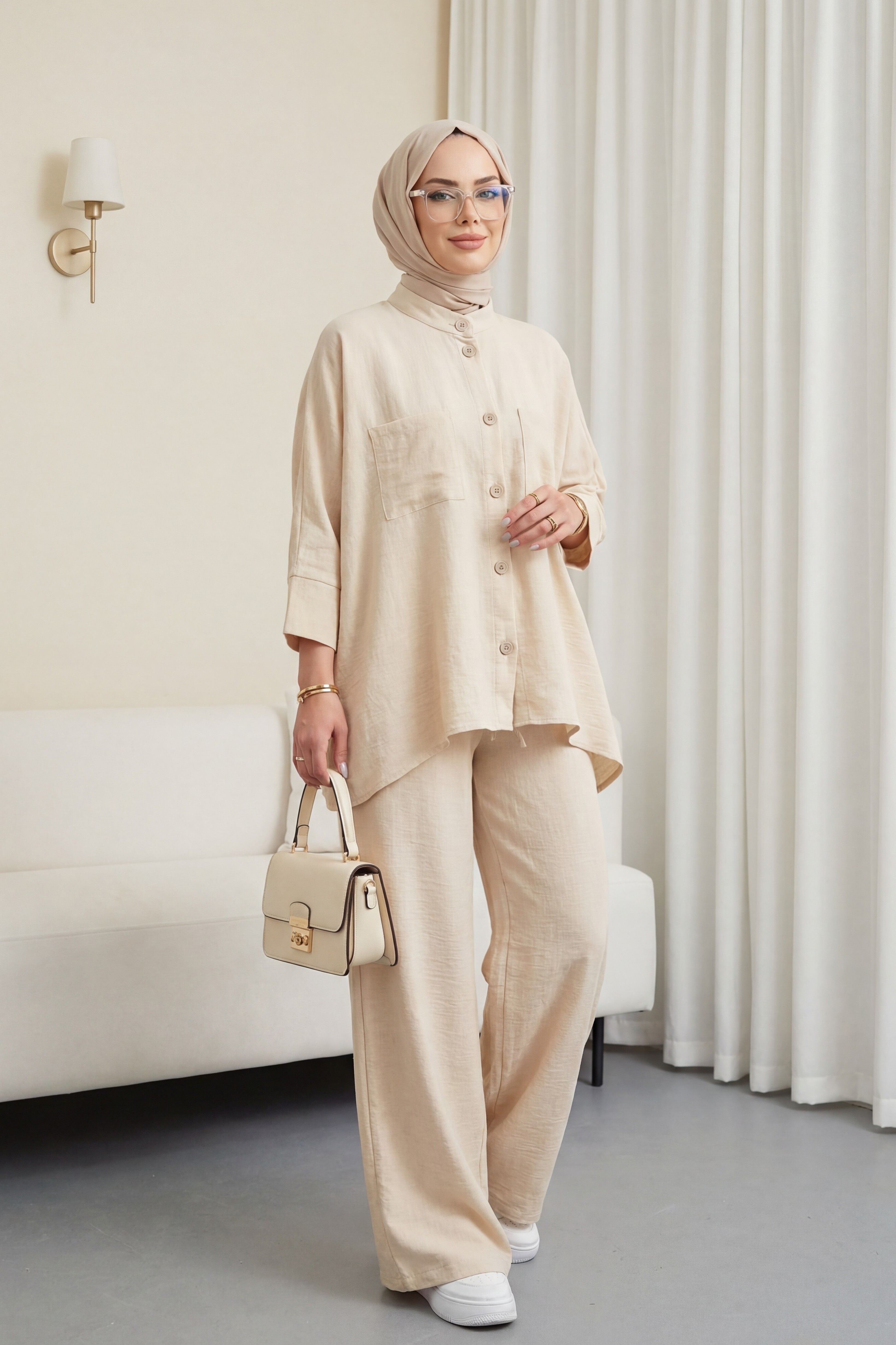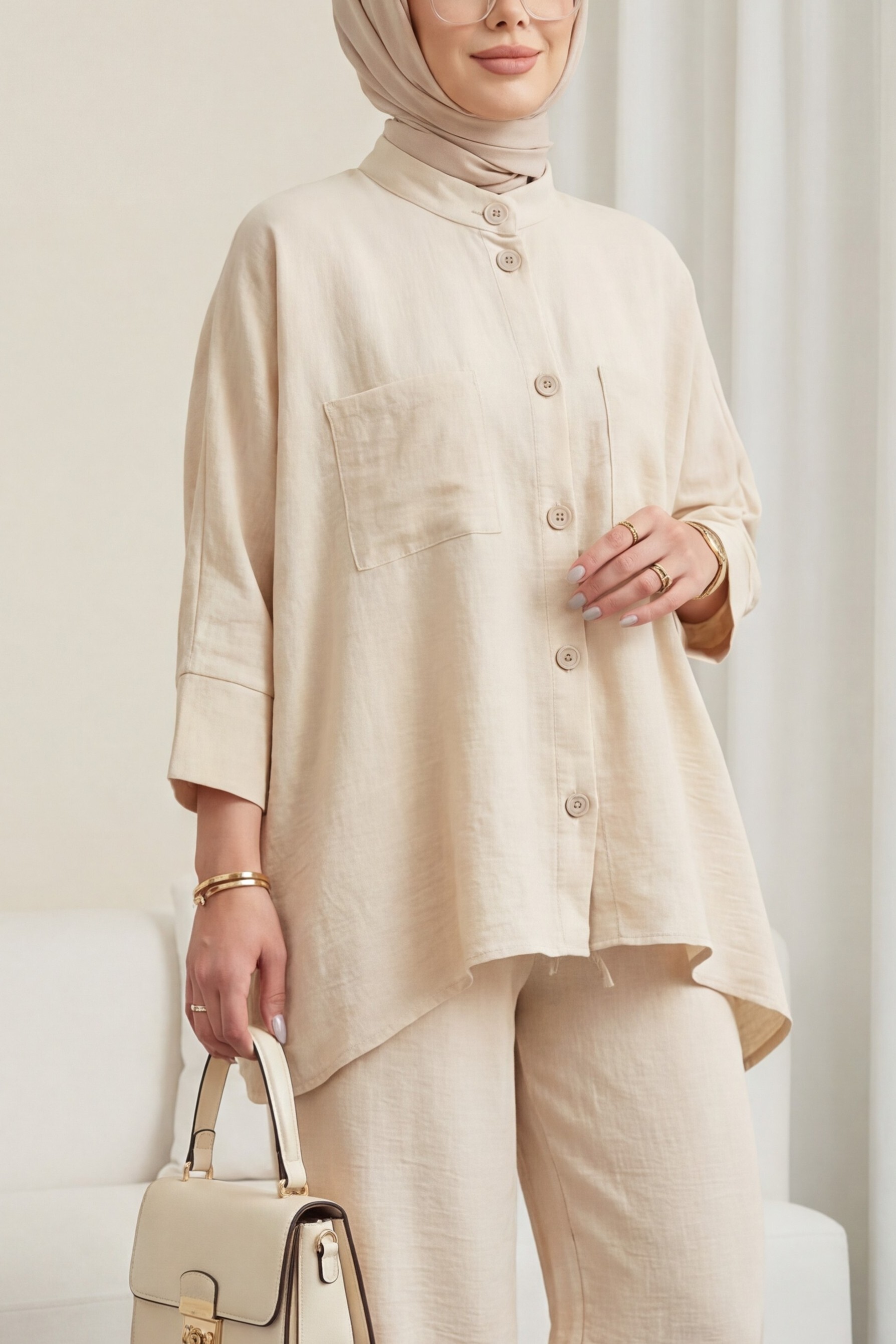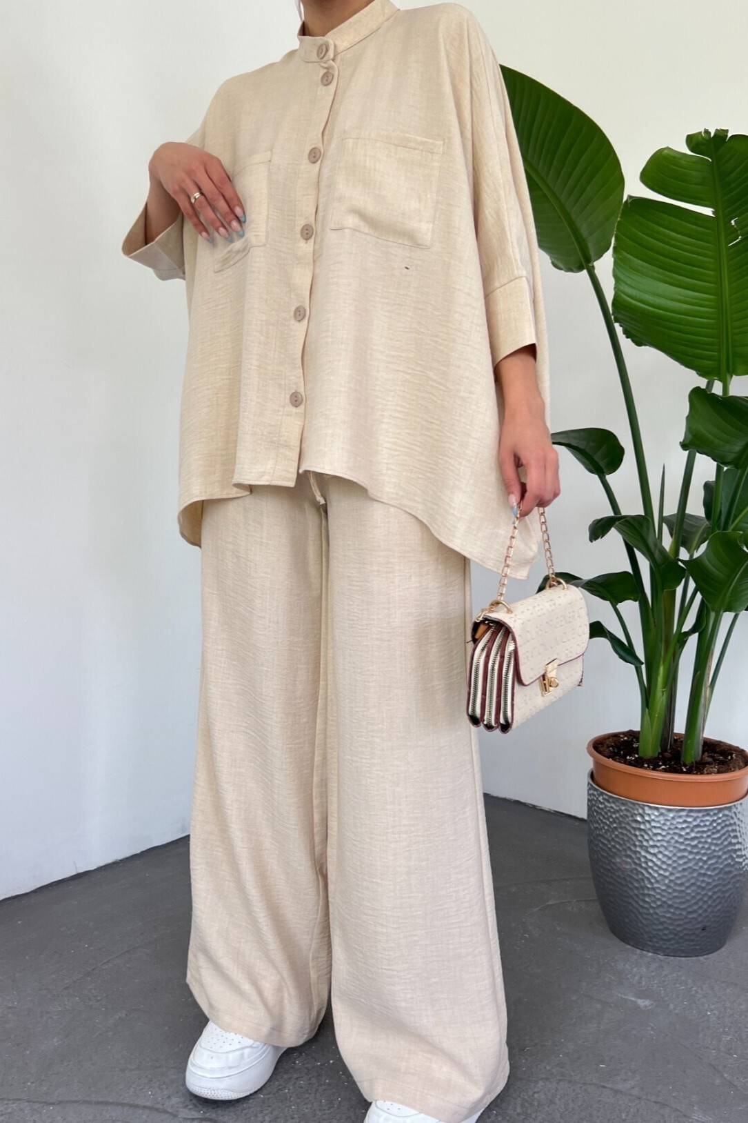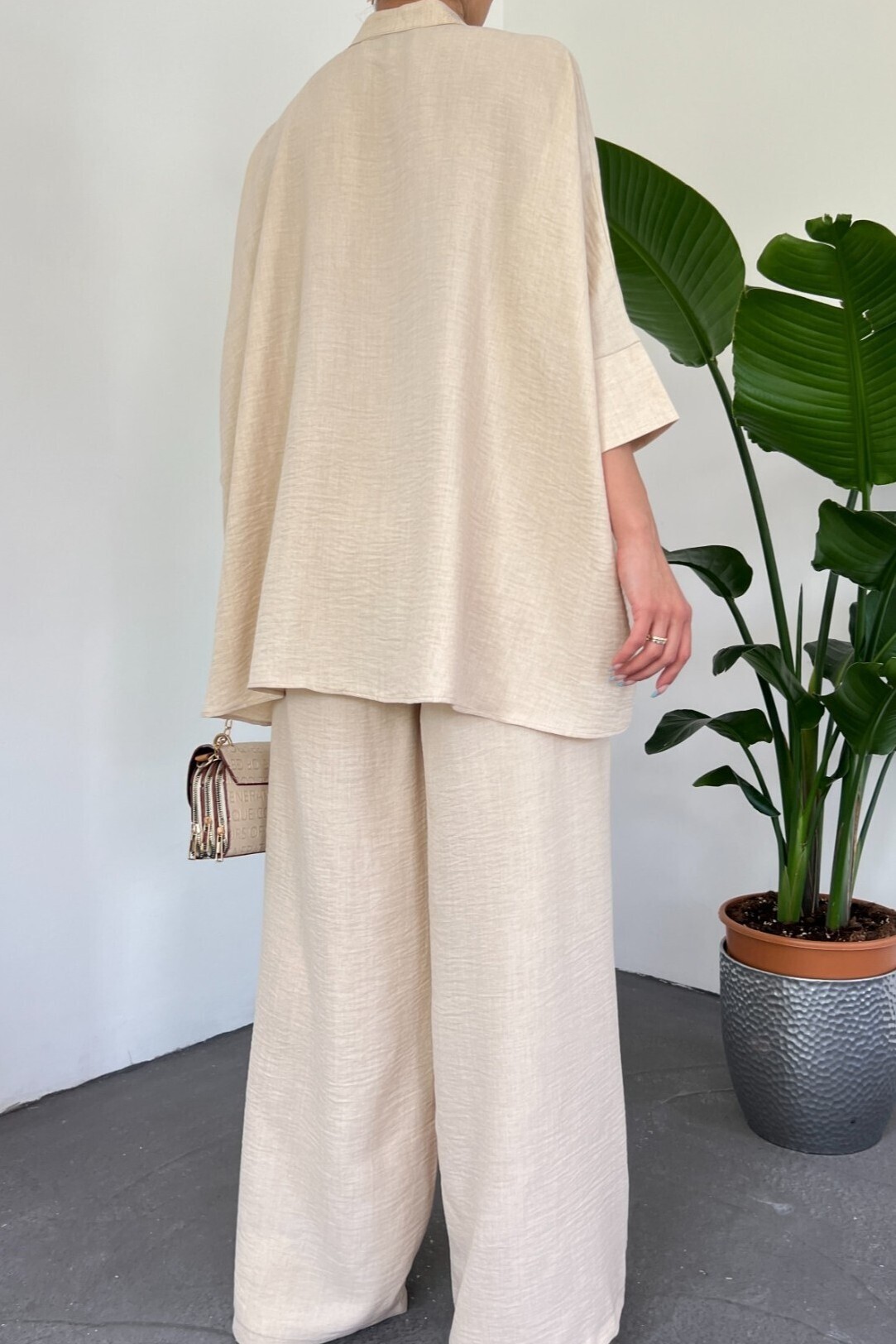 Shirt with button front, 2 pockets, half sleeve, short front, long back; Our suit model with elastic waistband, 2 pockets and wide leg is among the most popular models of the new season.