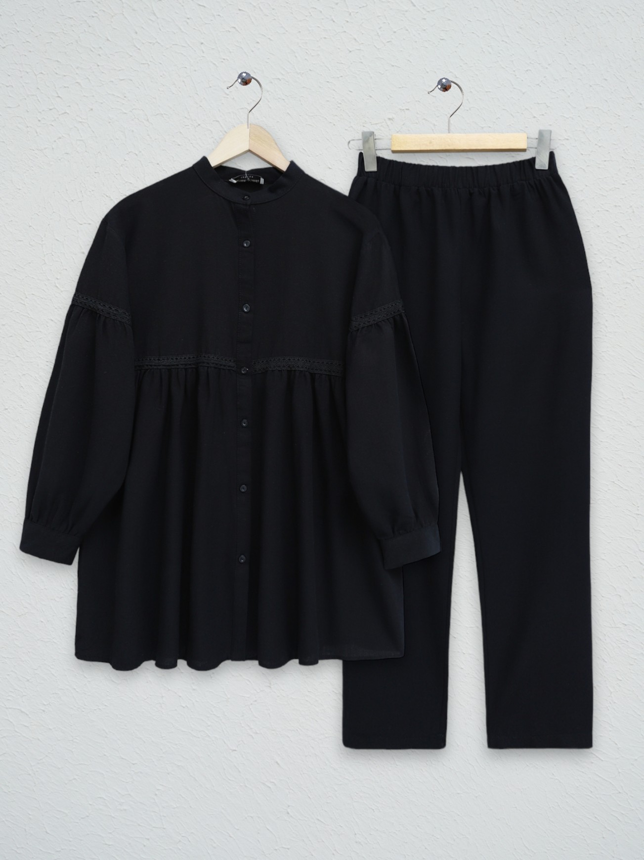 Crew neck, lace detail on the front; Our tube leg linen suit model with an elastic waist on trousers is among the most popular models of the new season.