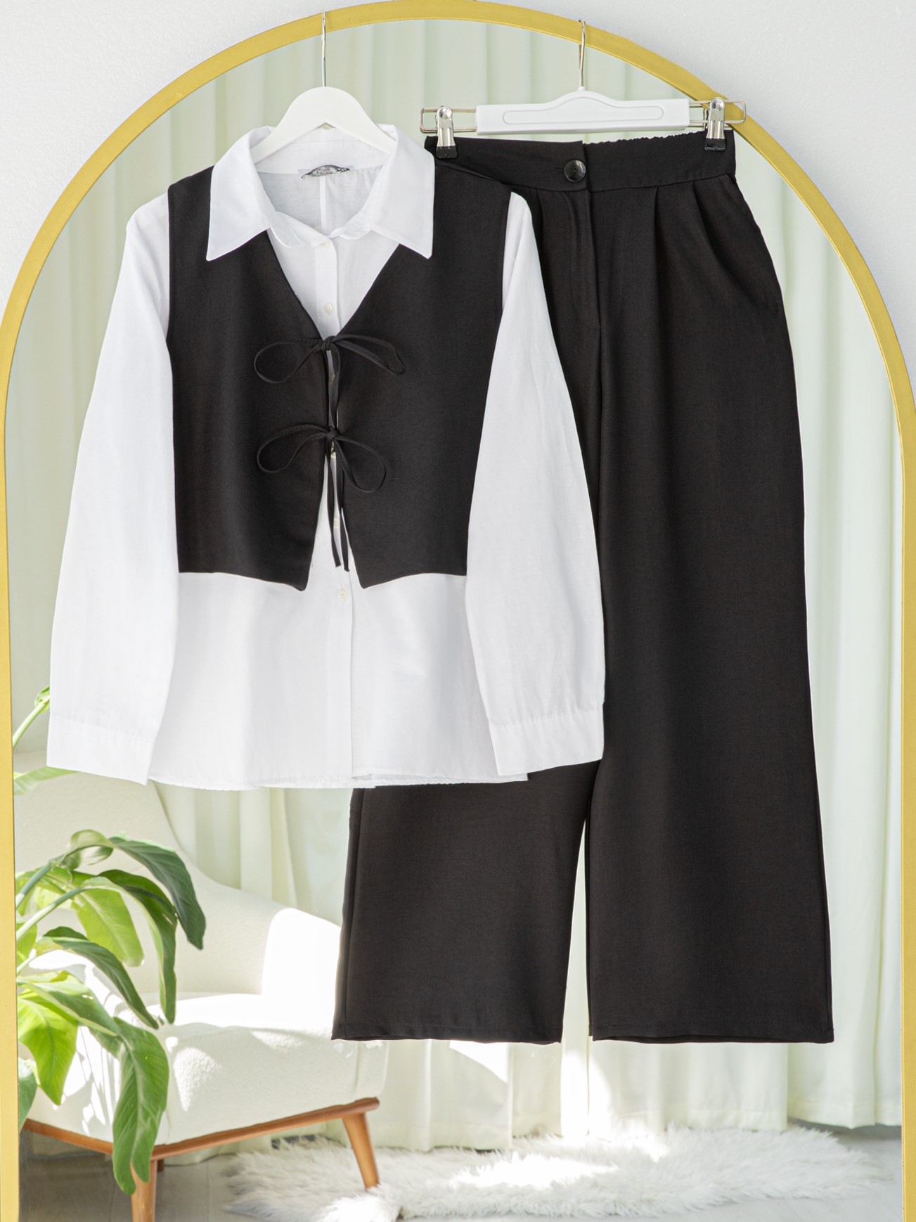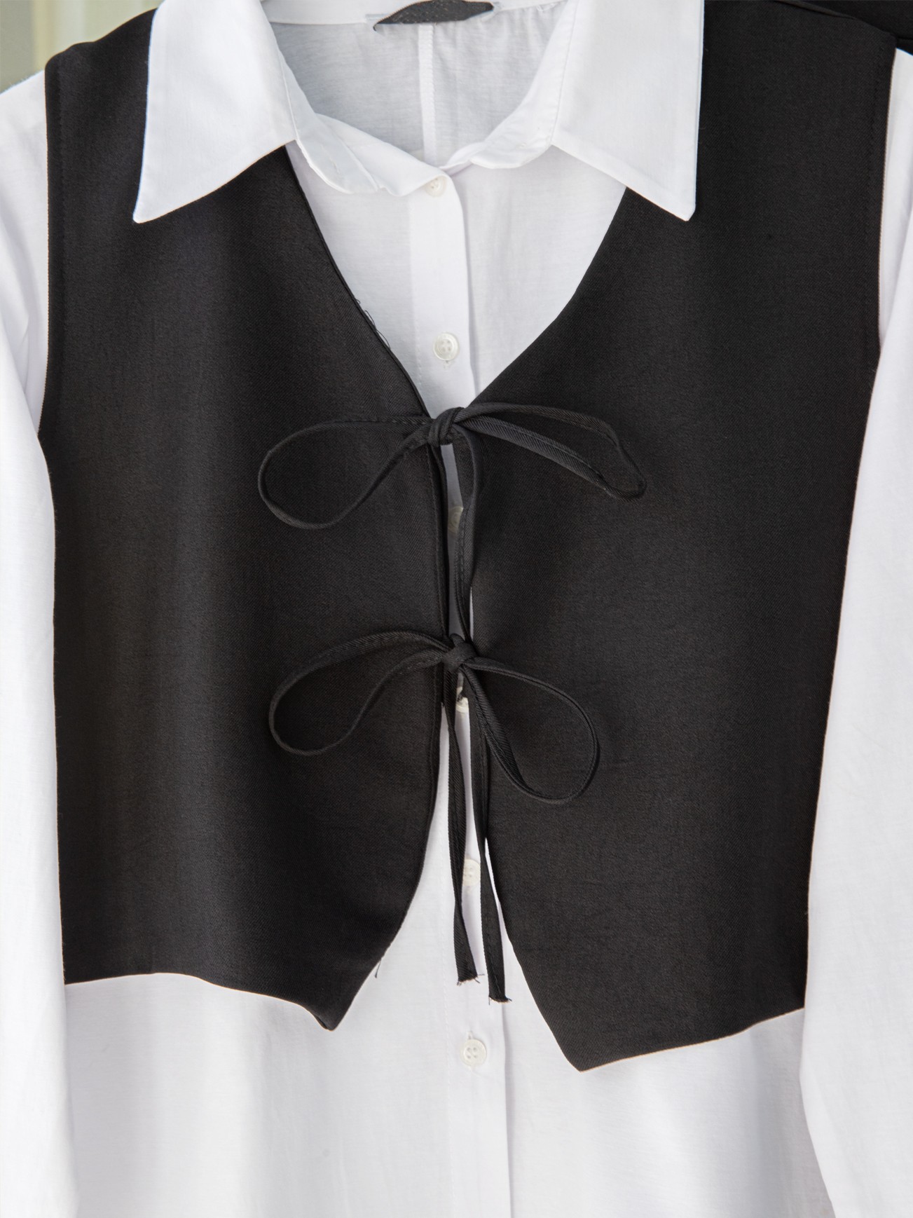 Lace-up Front Trousers Vest Two Piece Linen Suit -Black