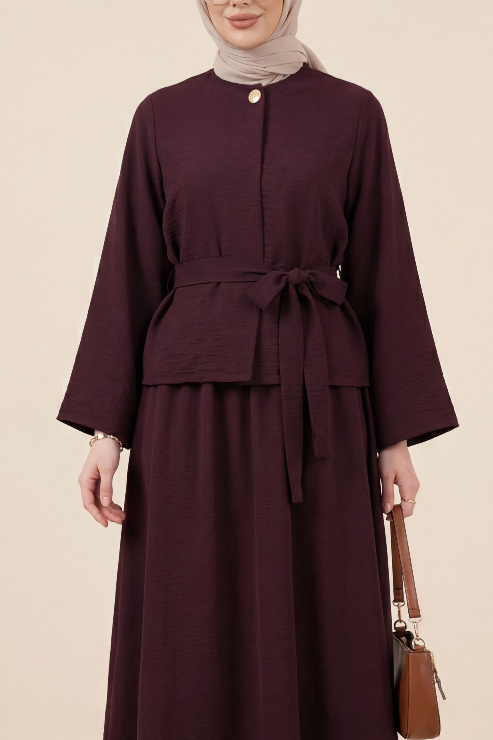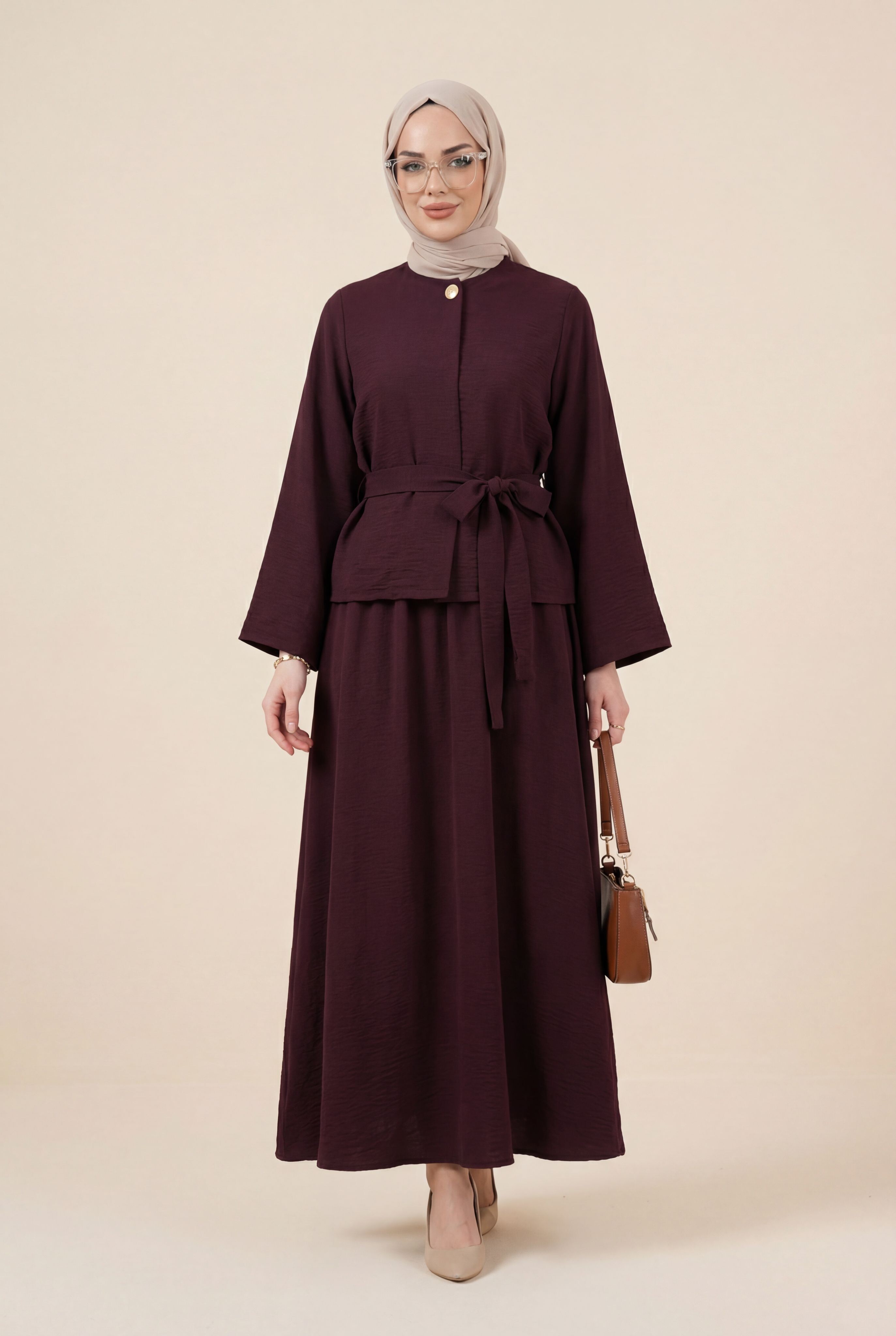 One-Button Belted Skirt Cupra Suit -Damson