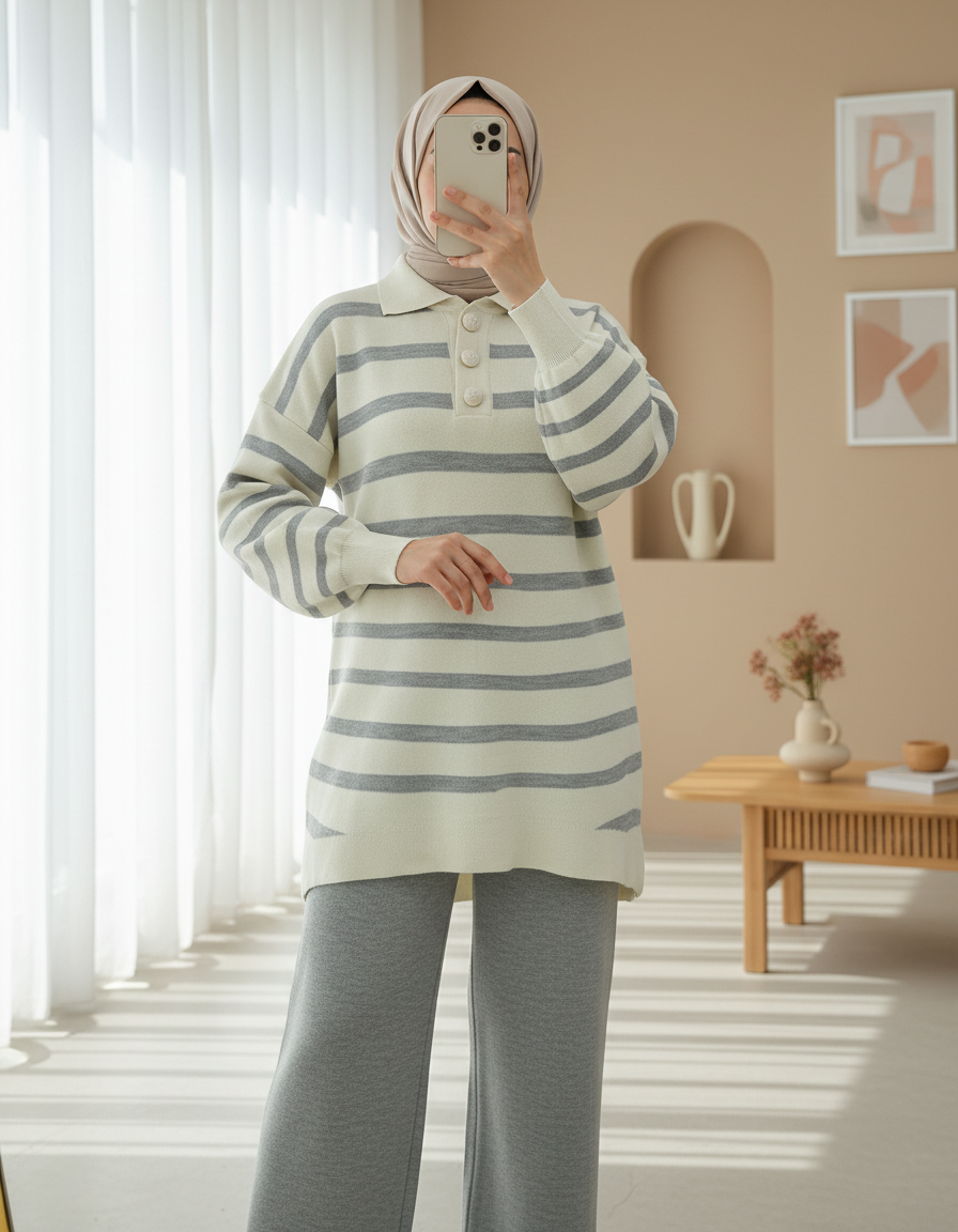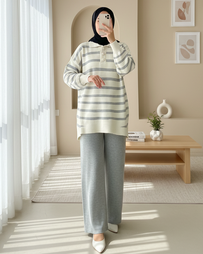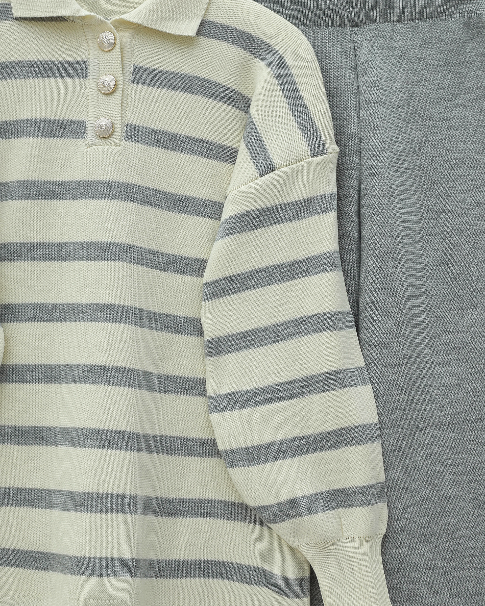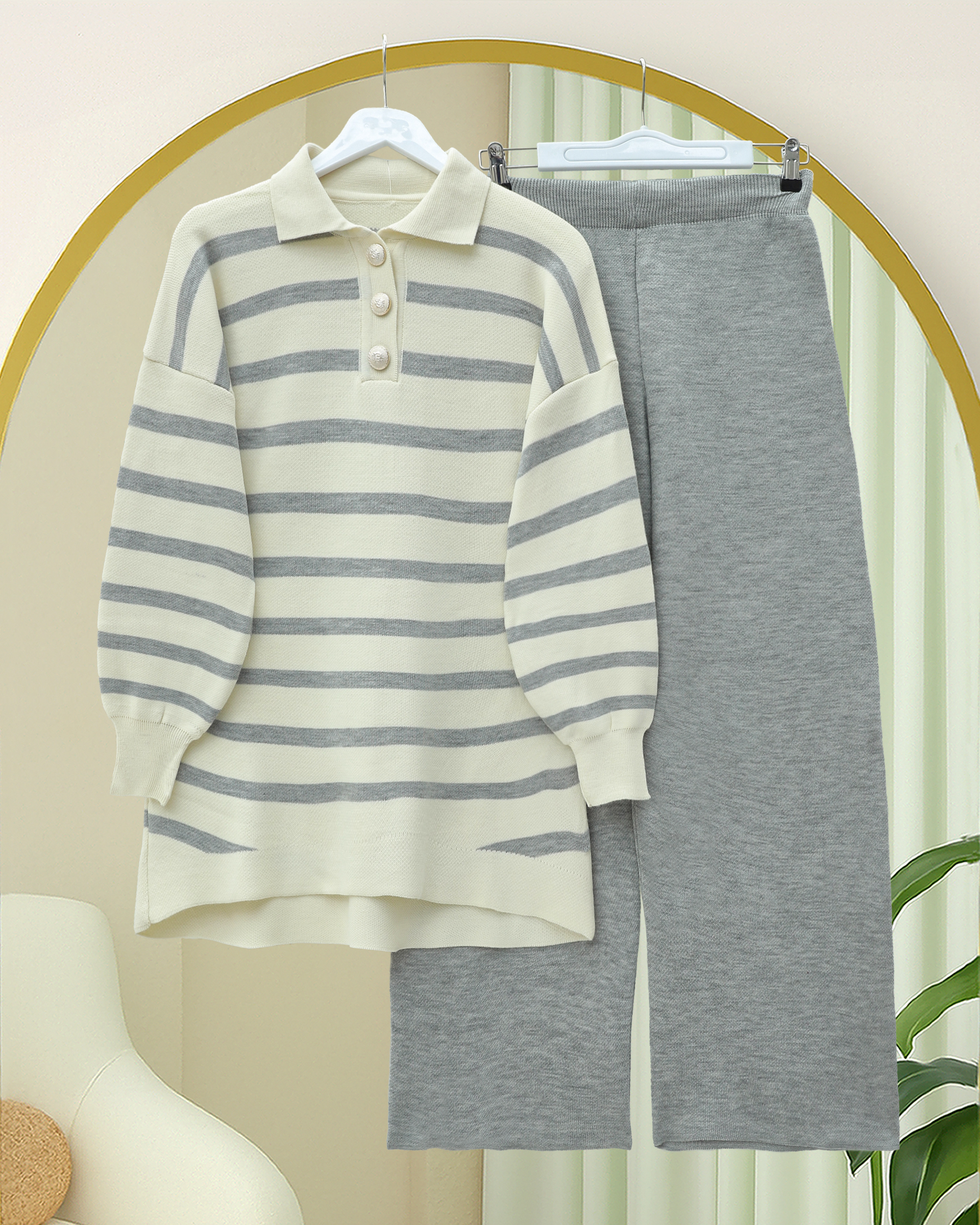 Polo Collar Buttoned Striped Knitwear Suit -Grey - 295-2025-R11