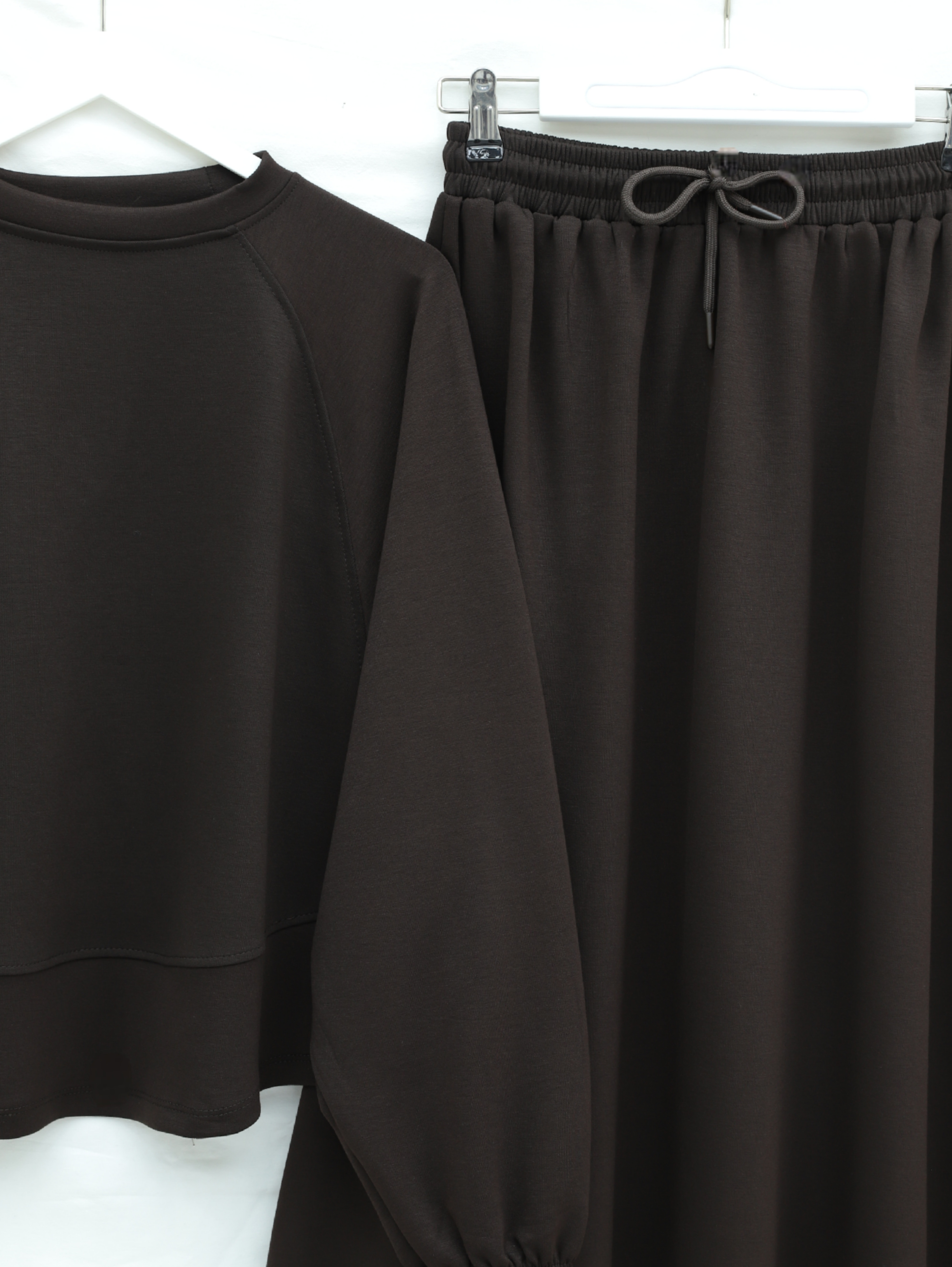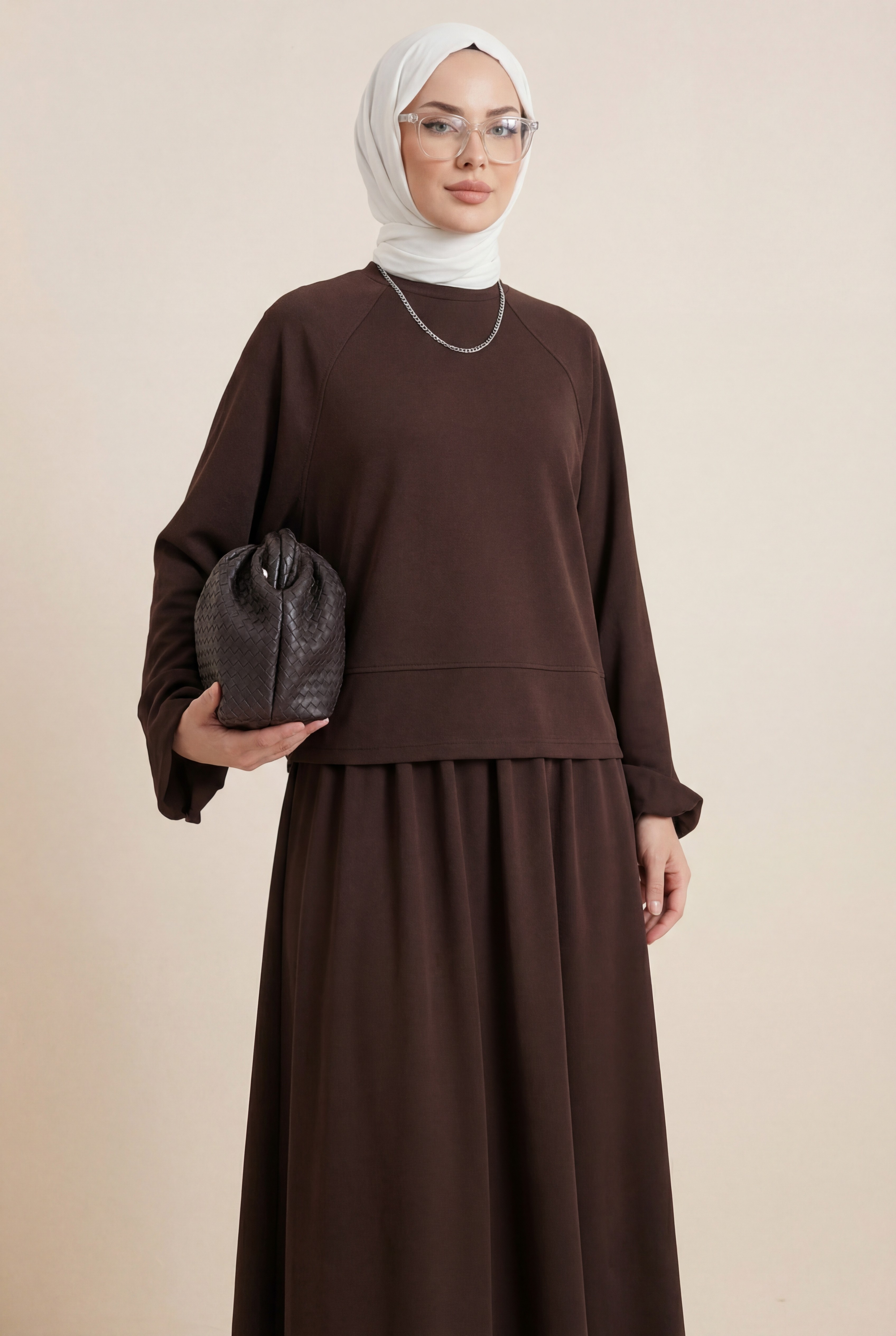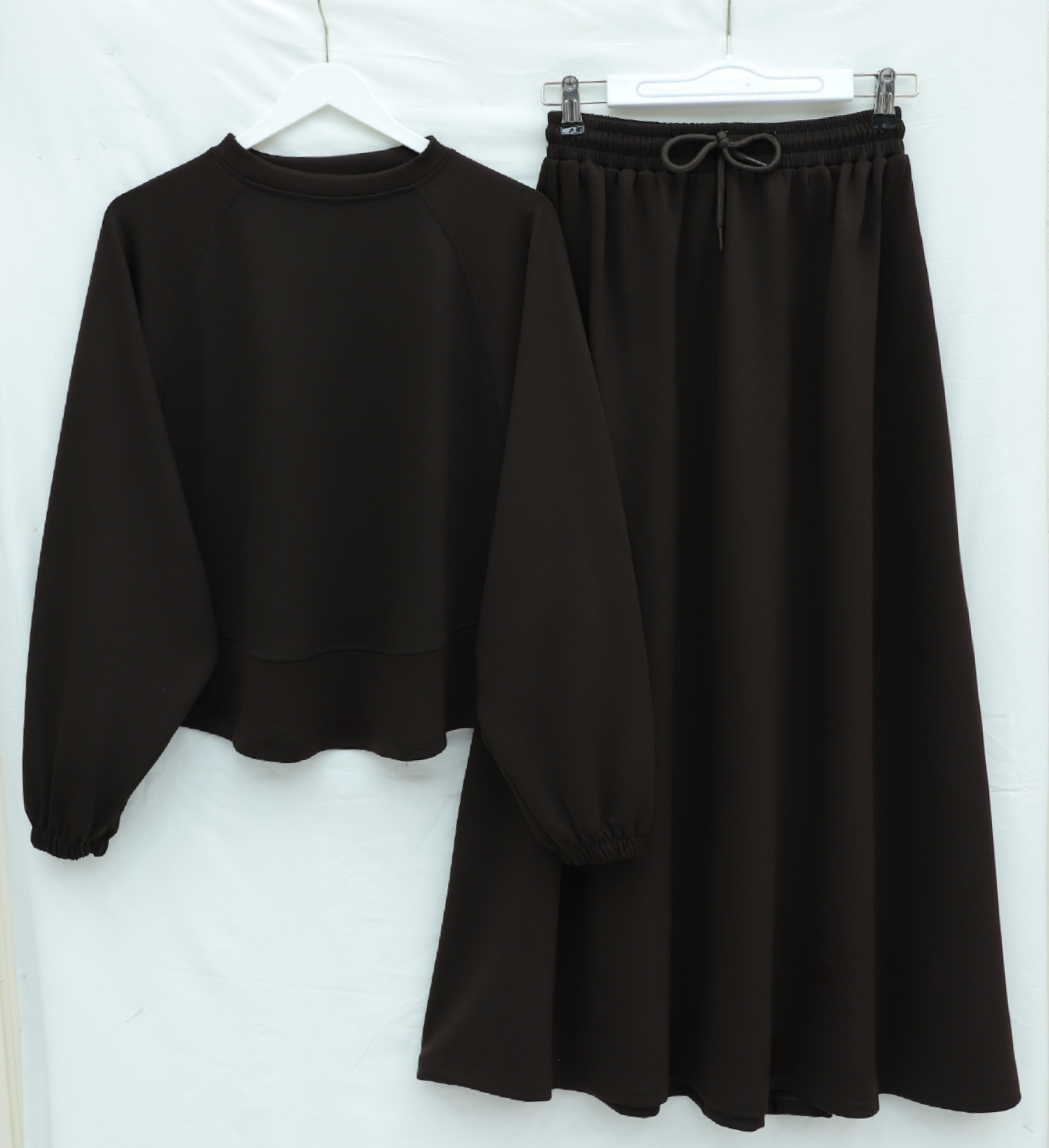Round Neck, Batwing Sleeve, Elastic Waist Skirt Set -Dark Coffee