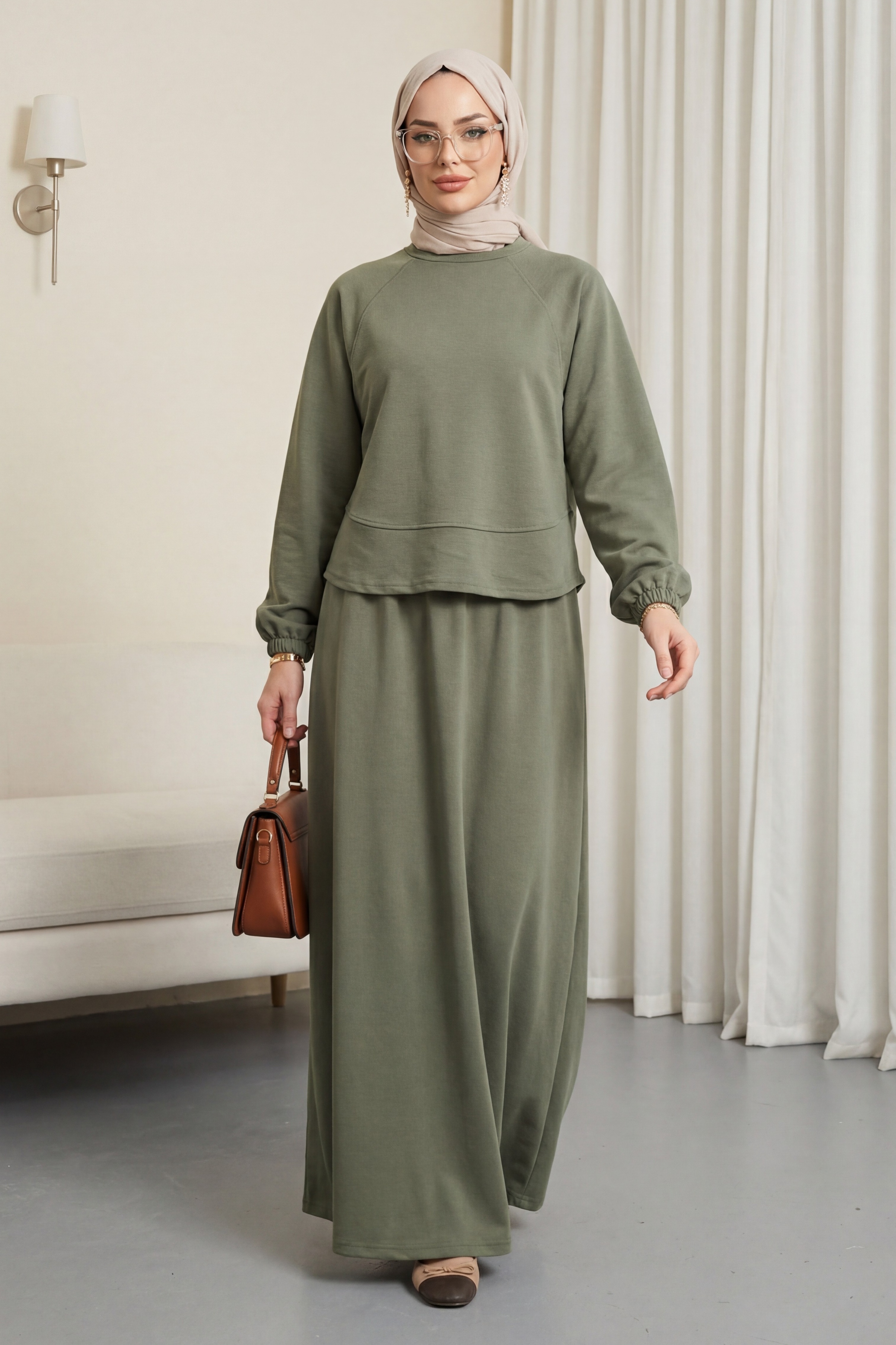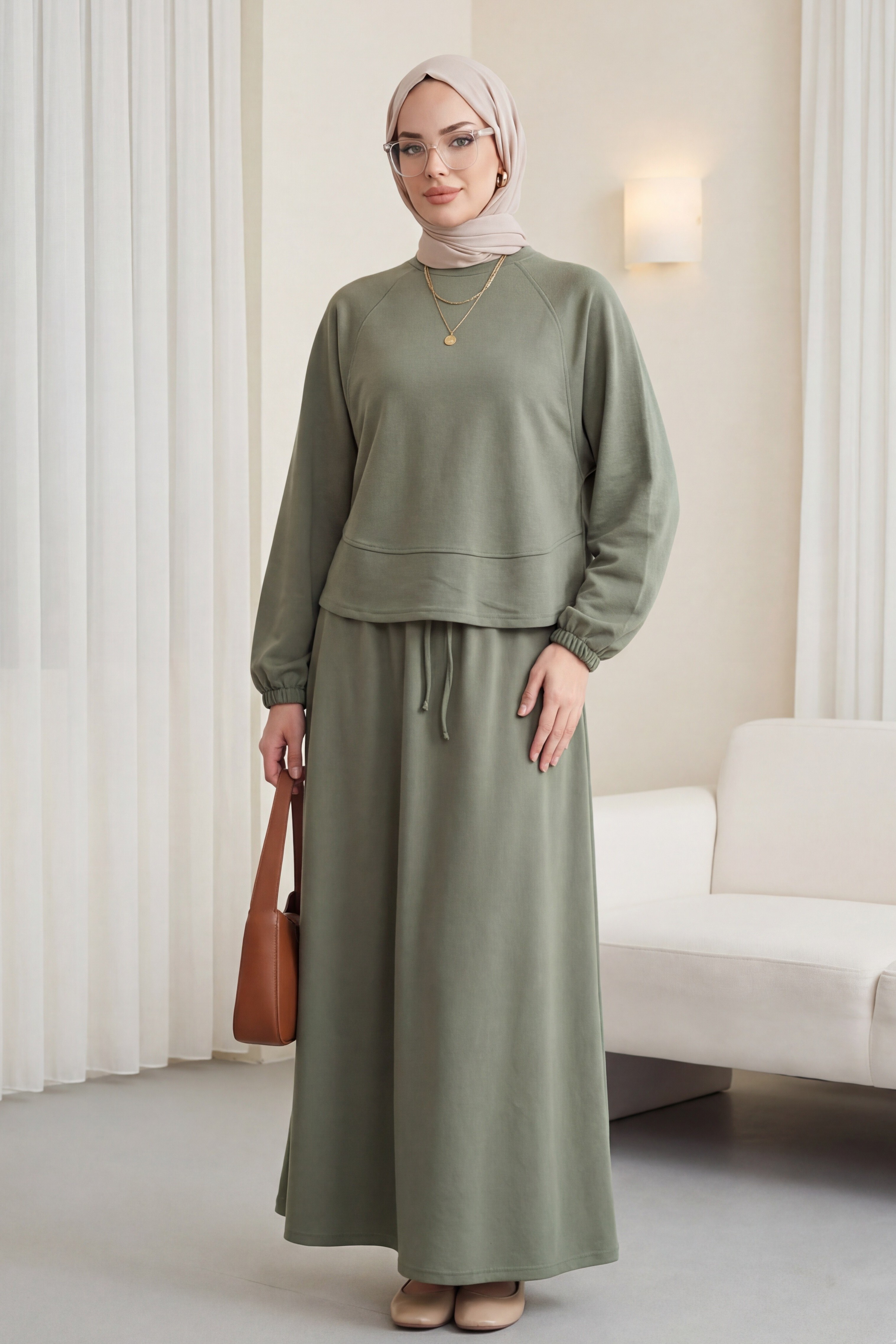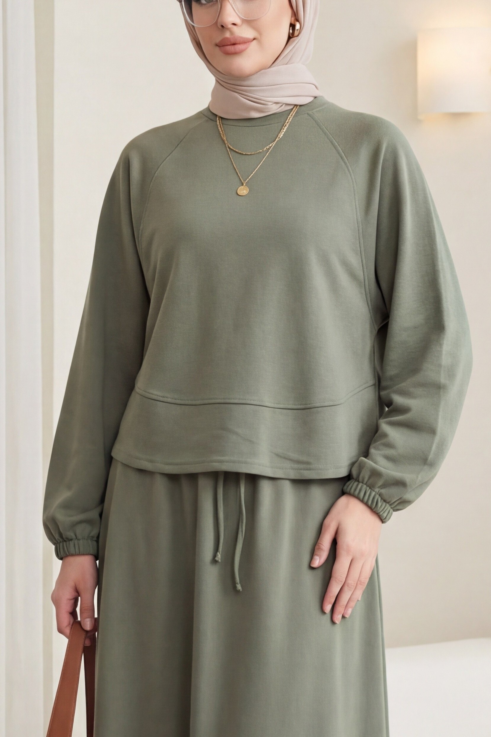 Round Neck, Batwing Sleeve, Elastic Waist Skirt Set -Maroon