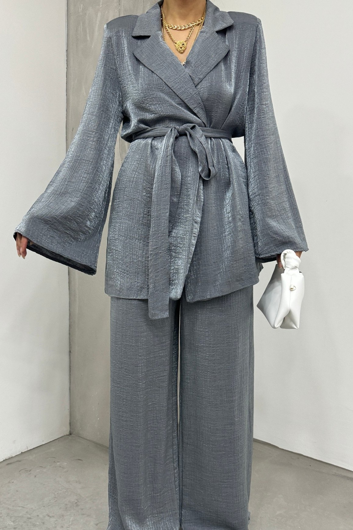 The Button-Down Top, Pants, and Blazer Jersey Set is the perfect combination of elegance and sophistication. The button detail on the top and the pants-blazer combination offer a chic look, while the jersey fabric ensures comfort. Ideal for both casual wear and special events, this set is perfect for those seeking a modern and stylish outfit. The Button-Down Top, Pants, and Blazer Jersey Set will become an essential piece in your wardrobe.
