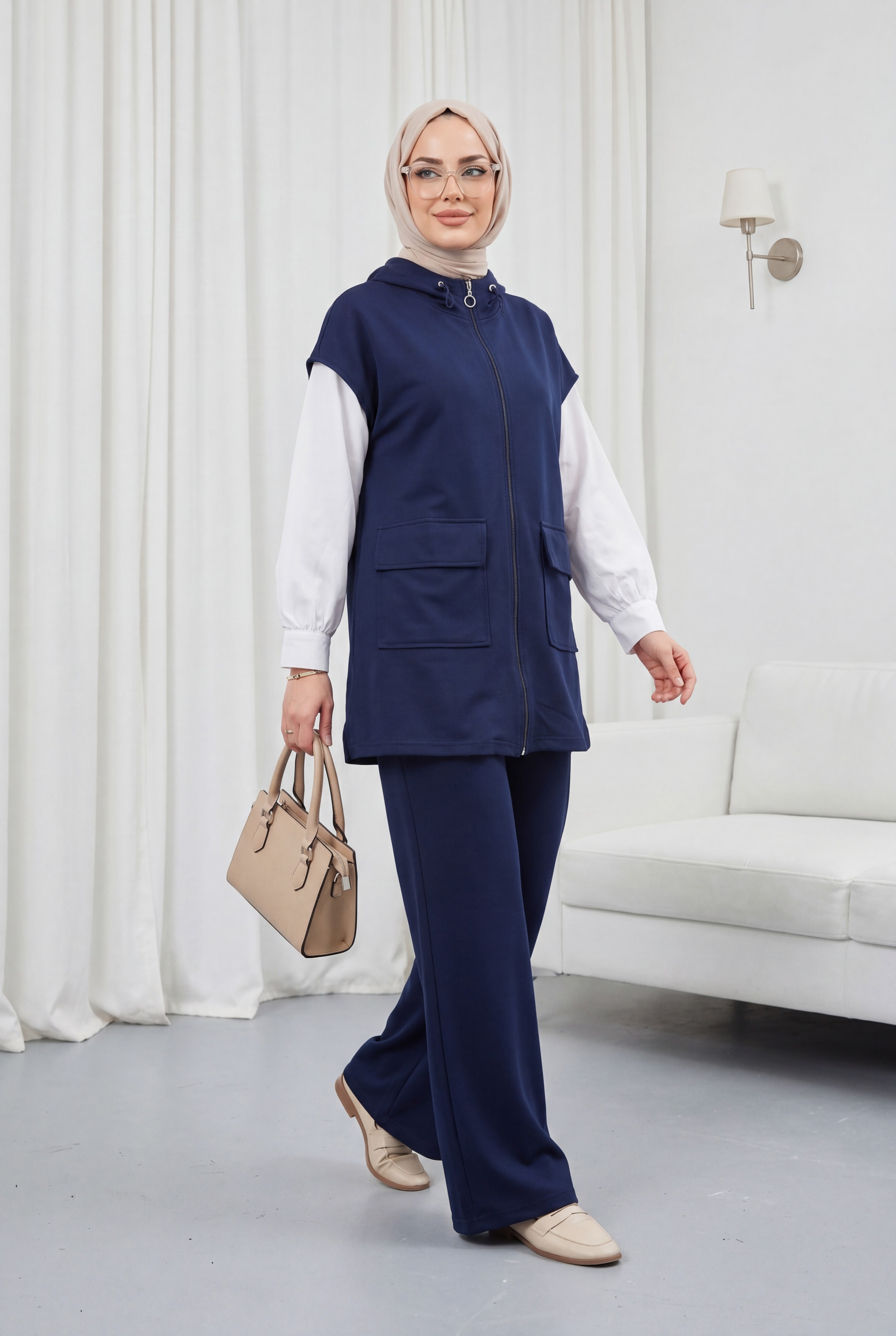 Two-thread cotton suit with elasticated collar and double pockets. -Navy blue