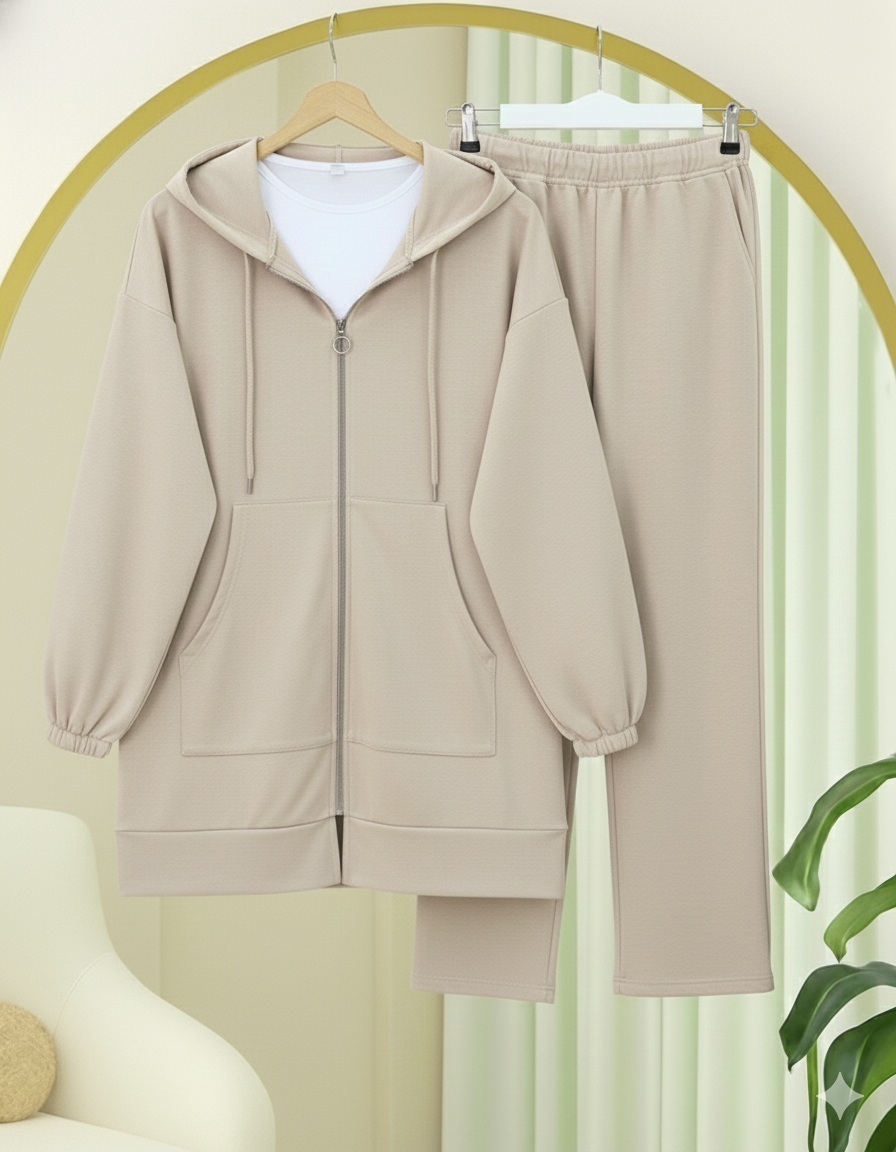 Zippered Hooded Combed Cotton Set -Light Mink