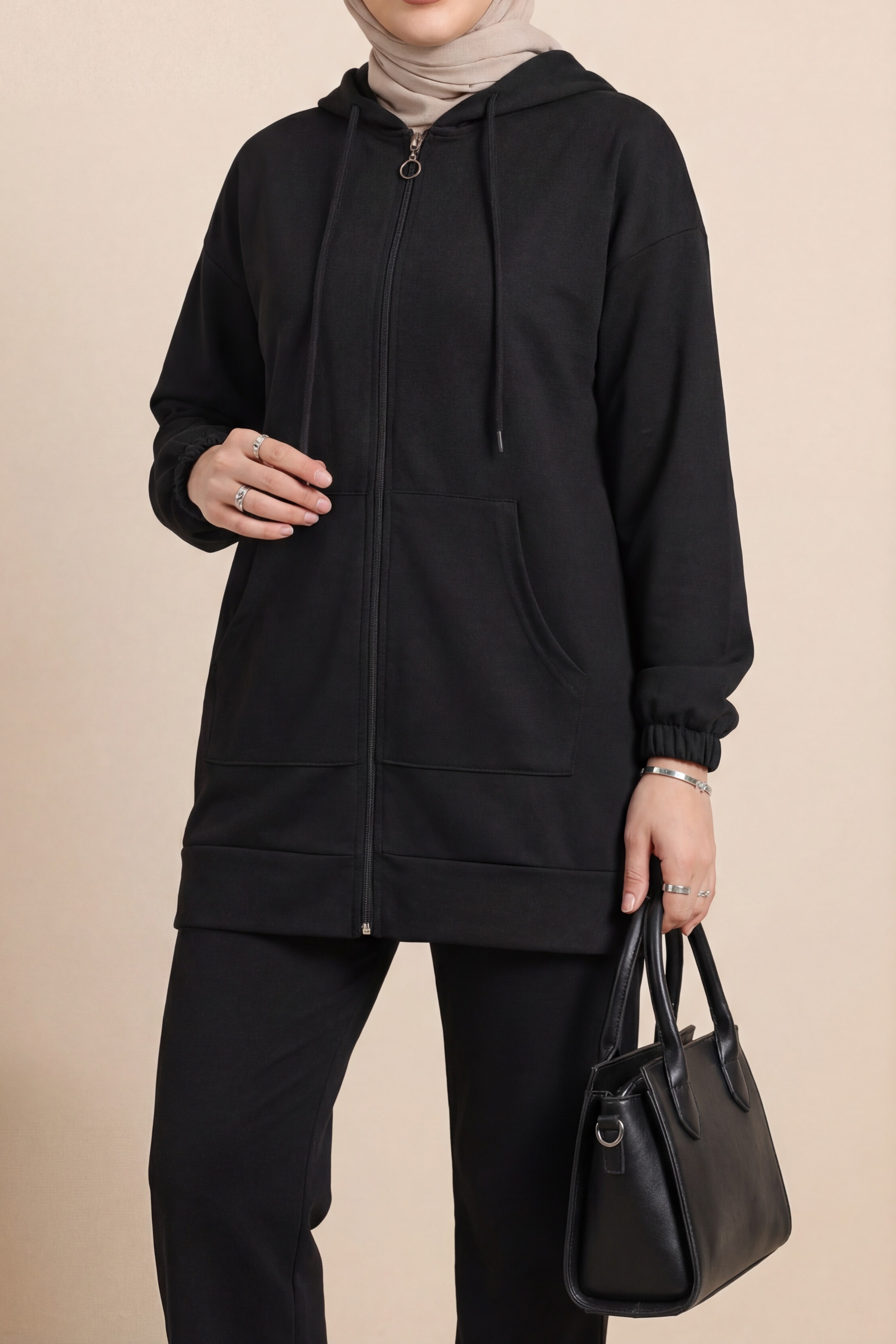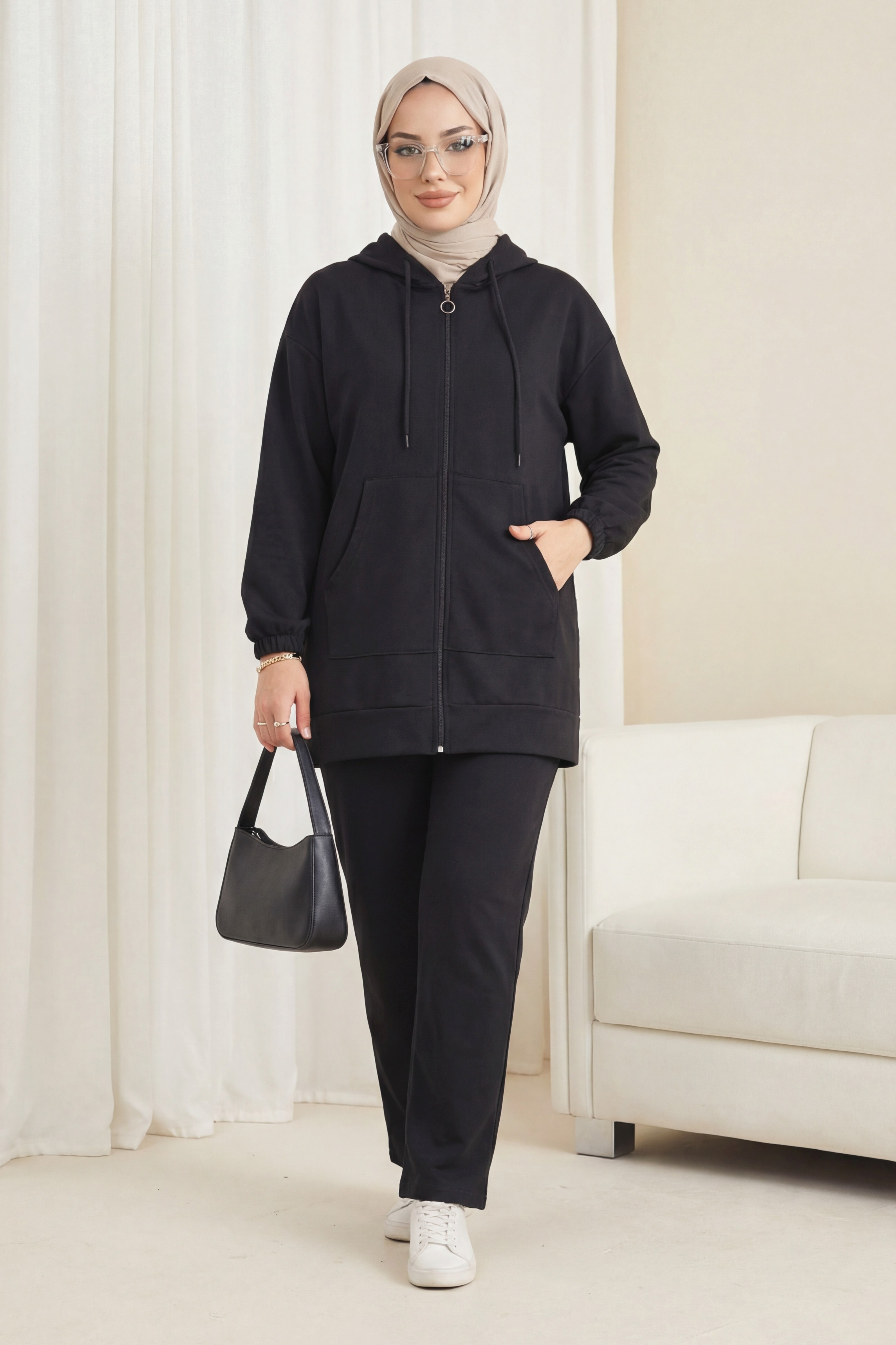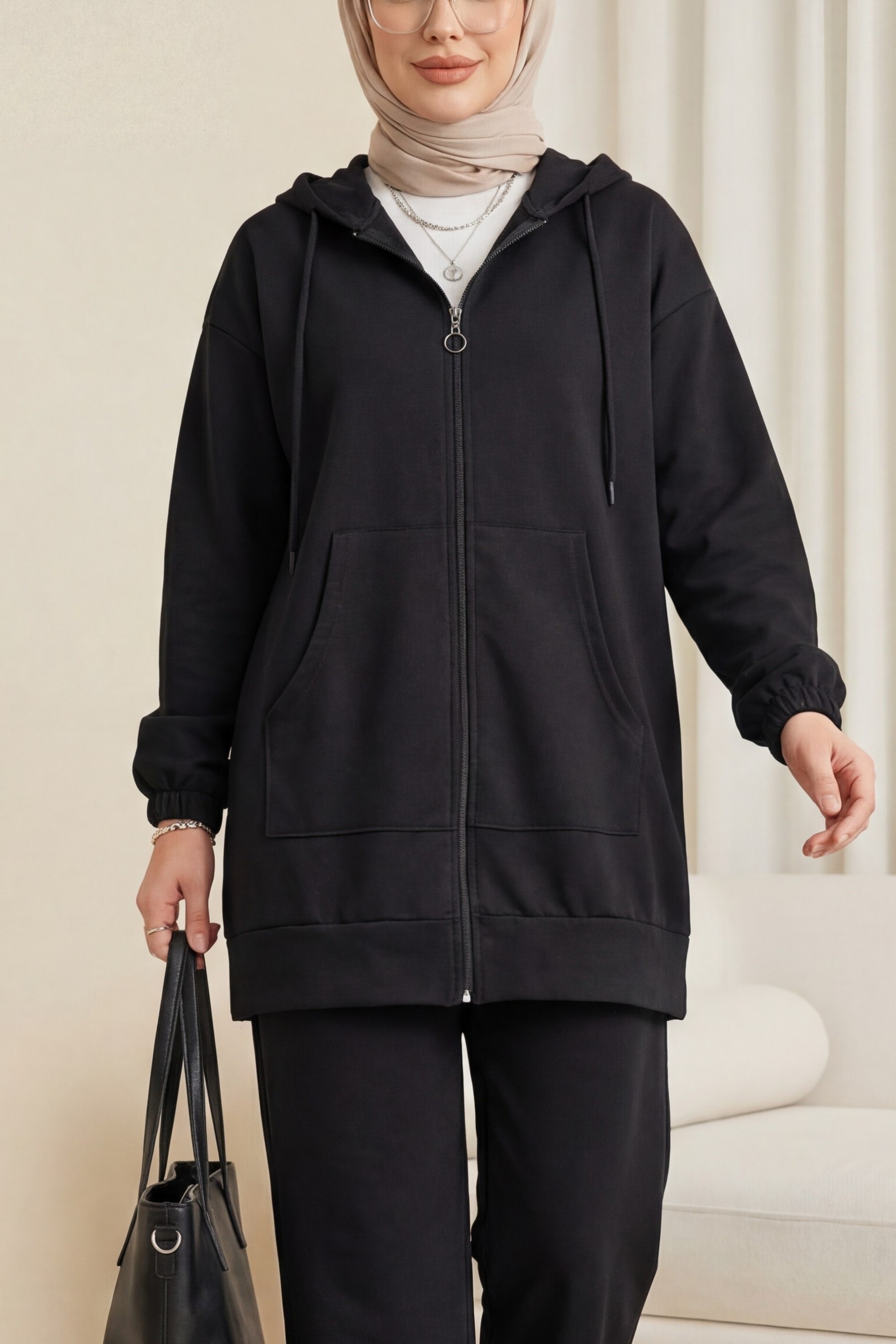 Depending on the user and region, this product can also be called a casual suit, hijab suit, seasonal suit, winter suit, summer suit, hijab suit models, hooded suit, suit with pockets.