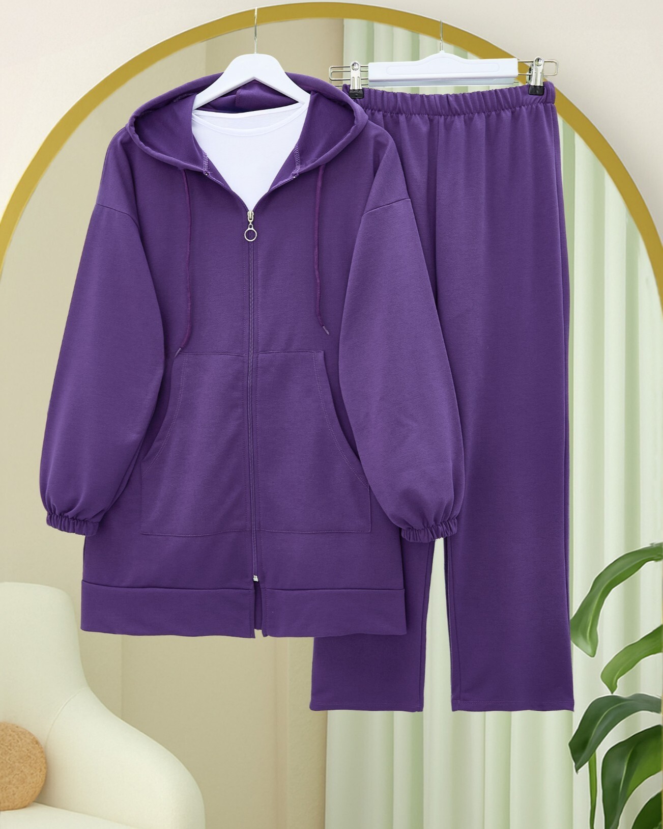 Zippered Hooded Combed Cotton Set - Purple