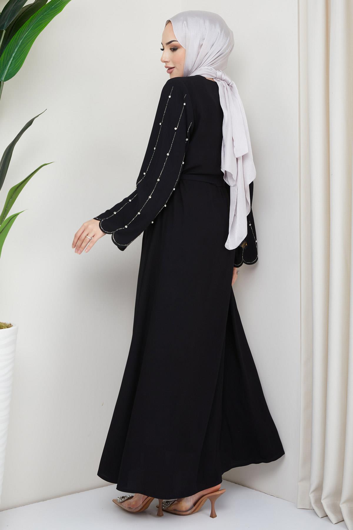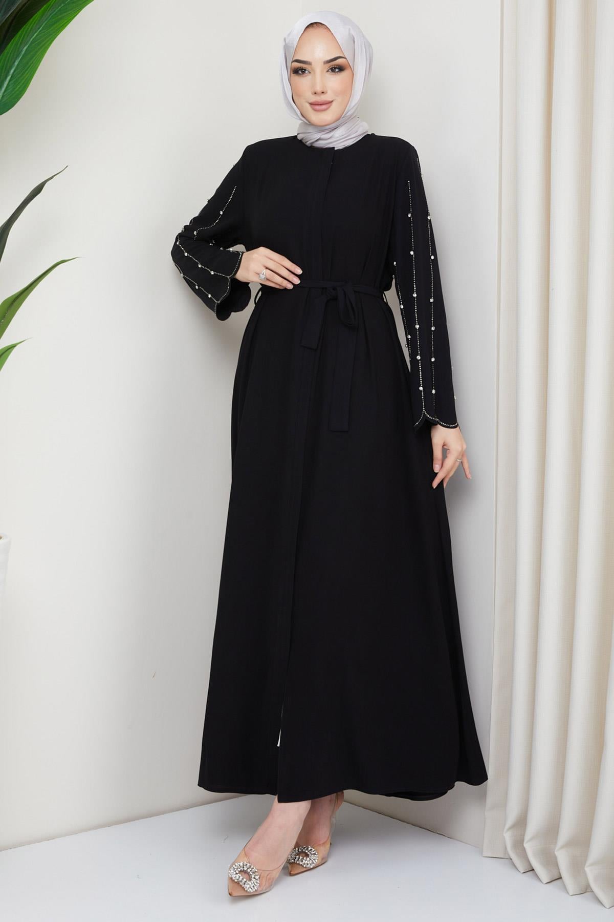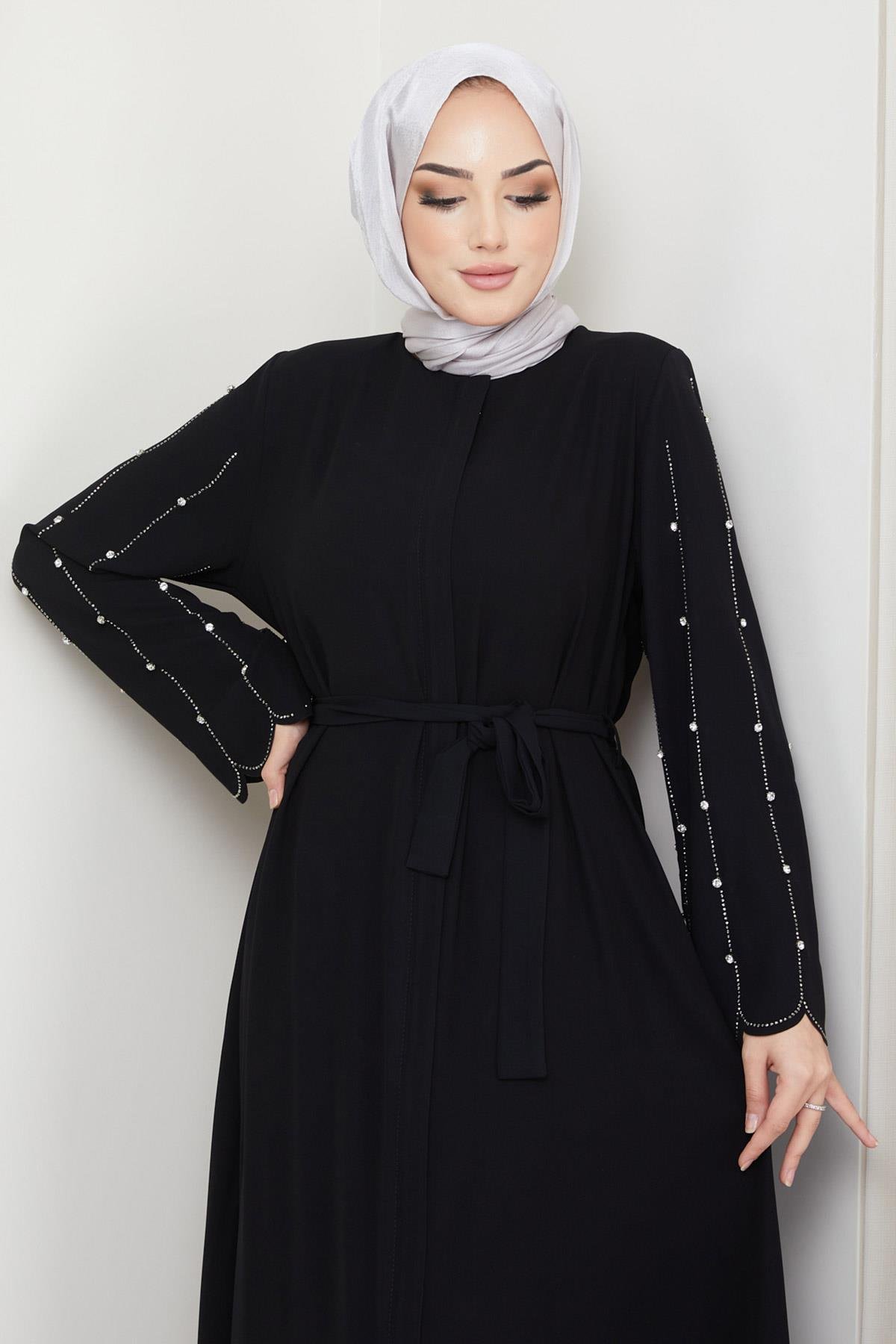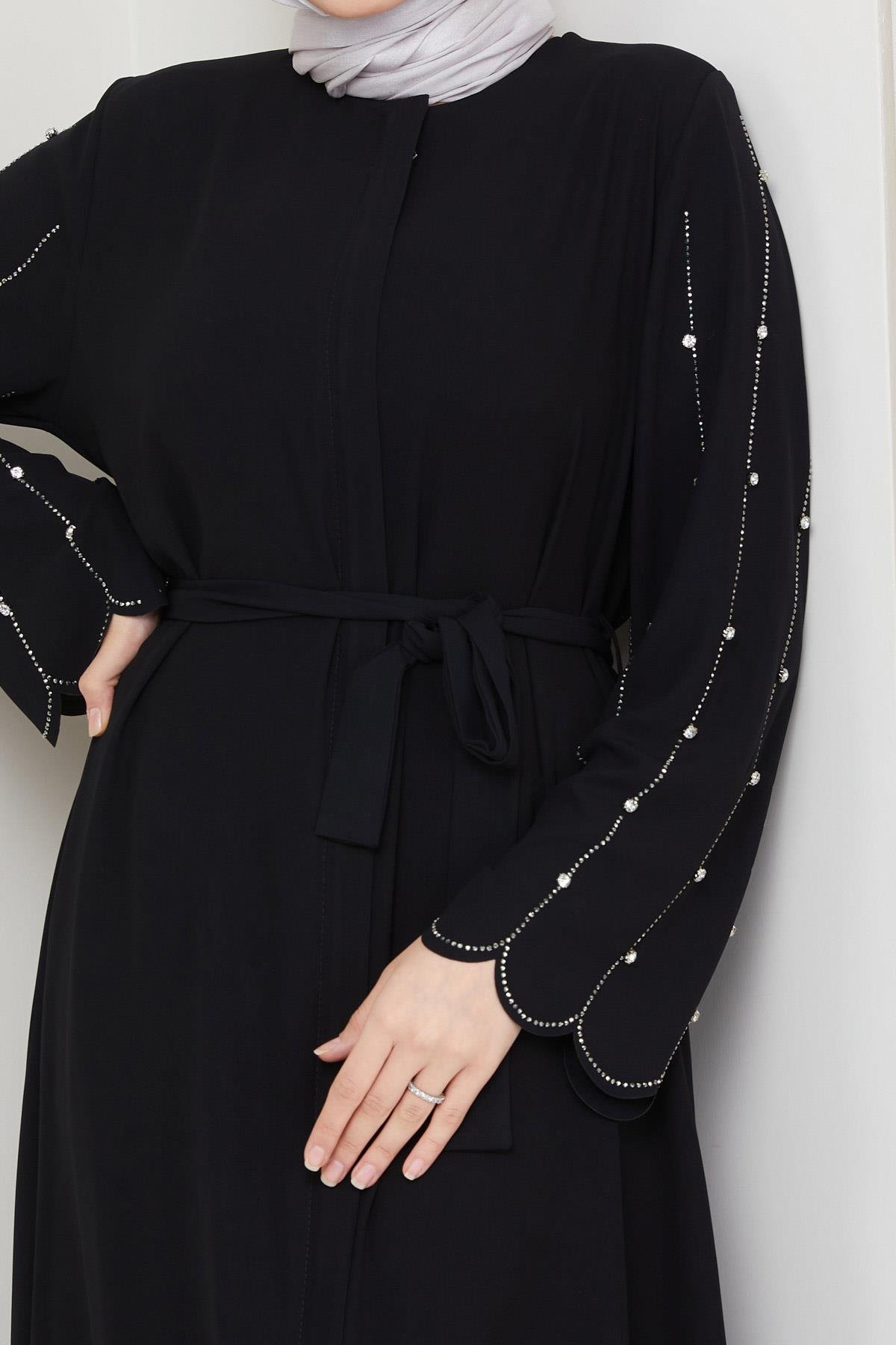 Features of the Black Abaya with Stone Embellished Sleeves and Hidden Placket
