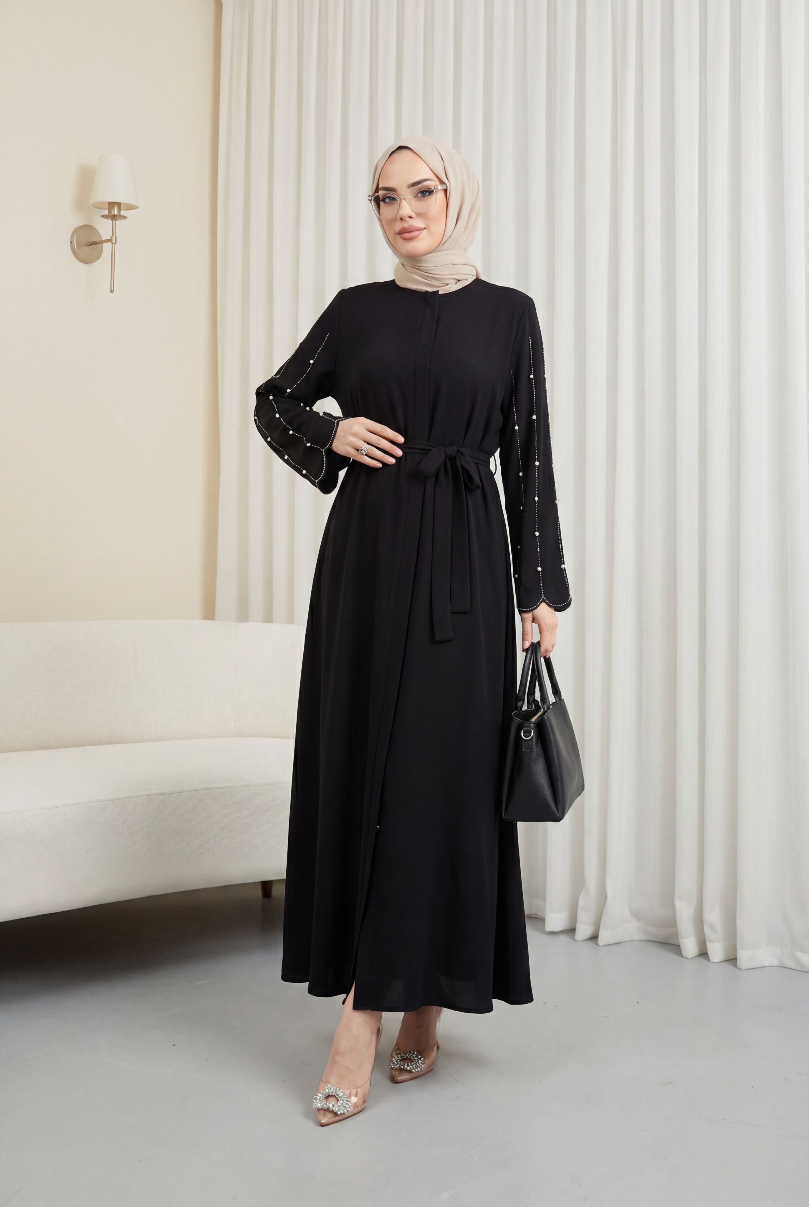 Black Abaya with Stone Embellished Sleeves and Hidden Placket