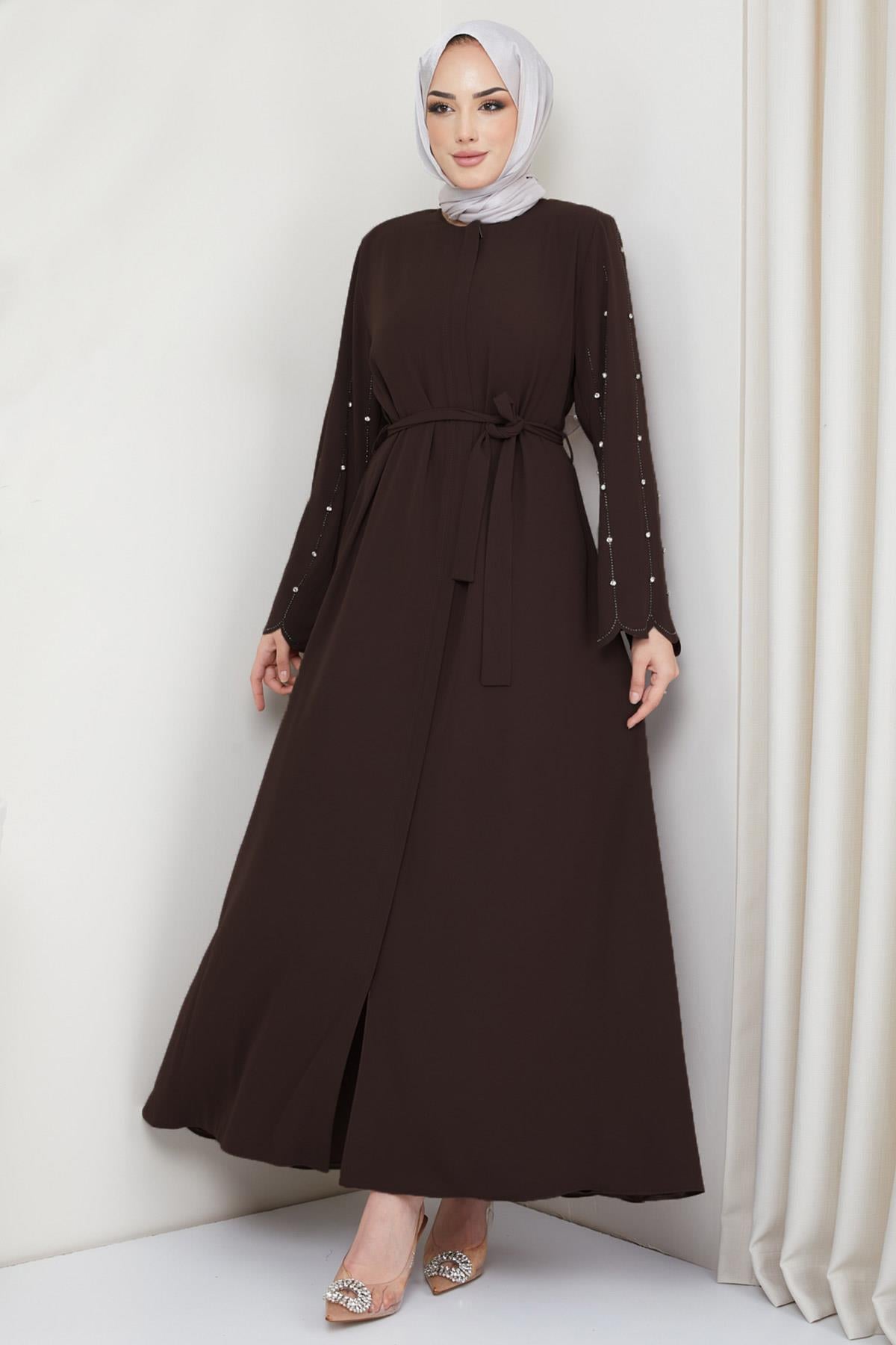Embellished Sleeve Hidden Placket Abaya Dark Brown HM2152