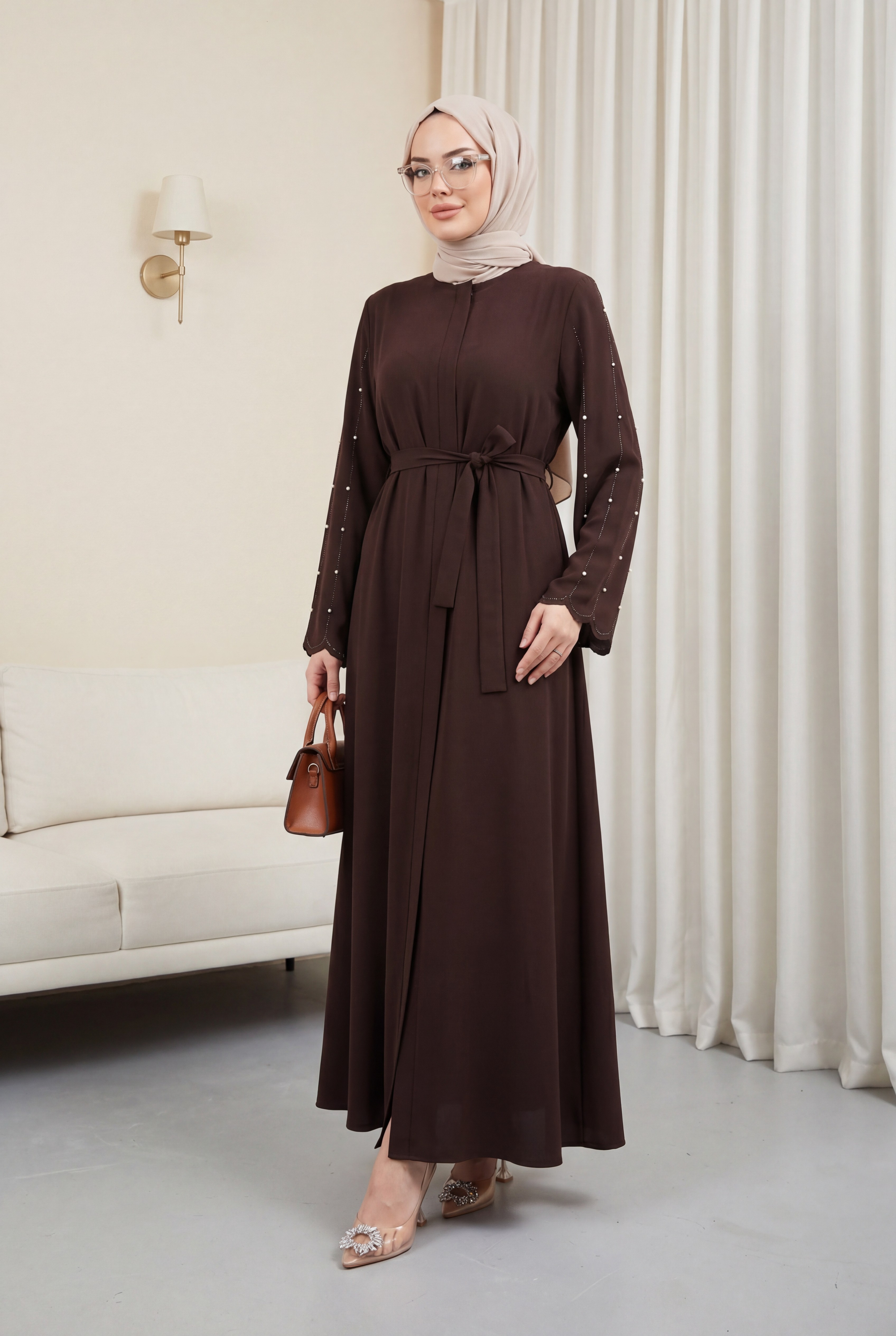 Features of the Dark Brown Abaya with Stone Embellished Sleeves and Hidden Placket: