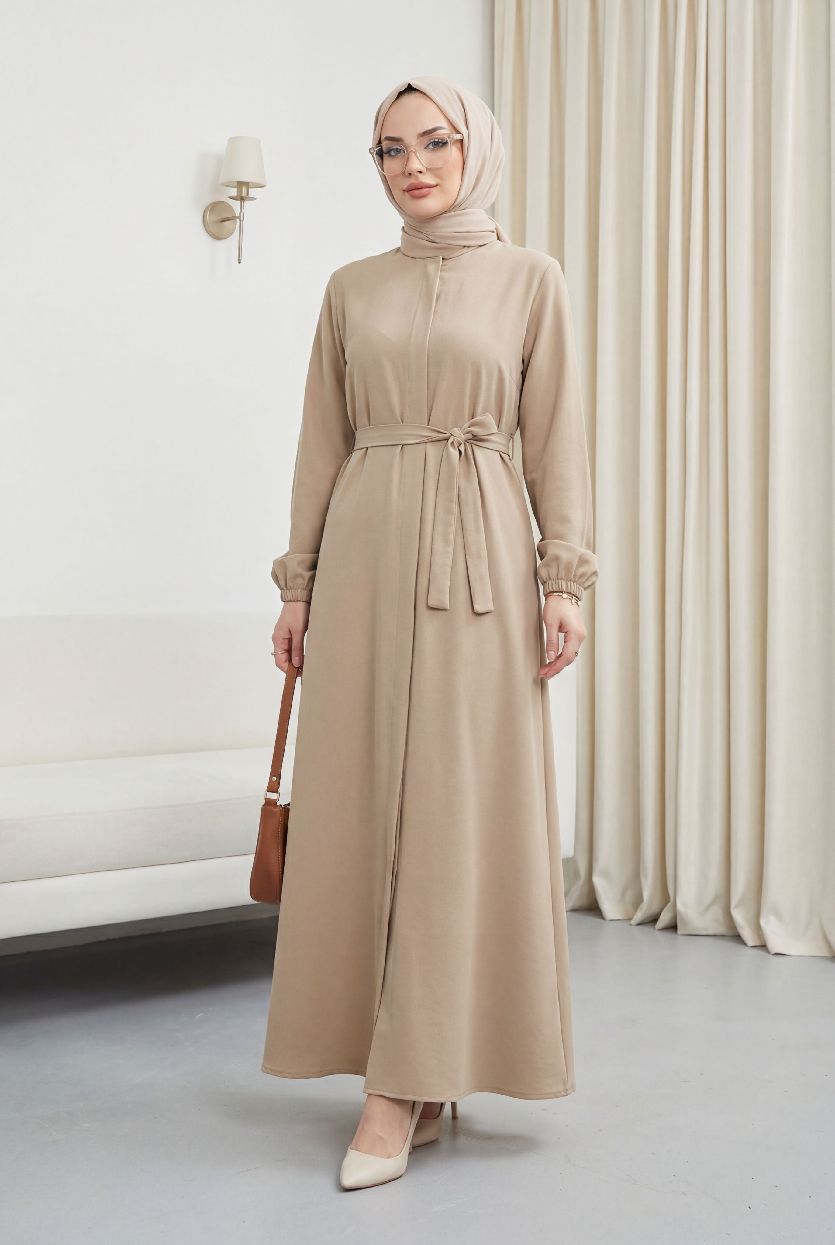Hidden Belted Abaya Beige HM2361