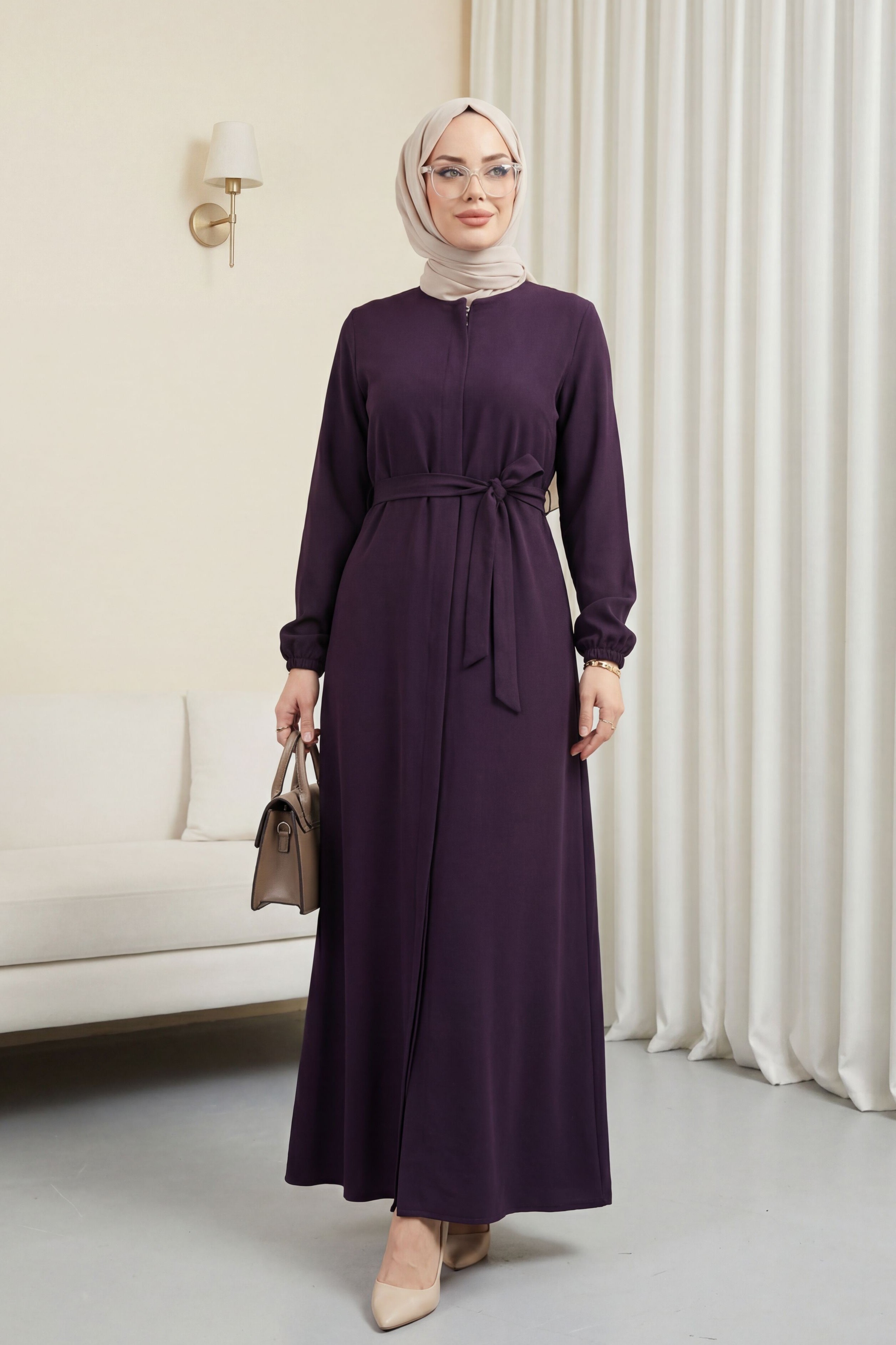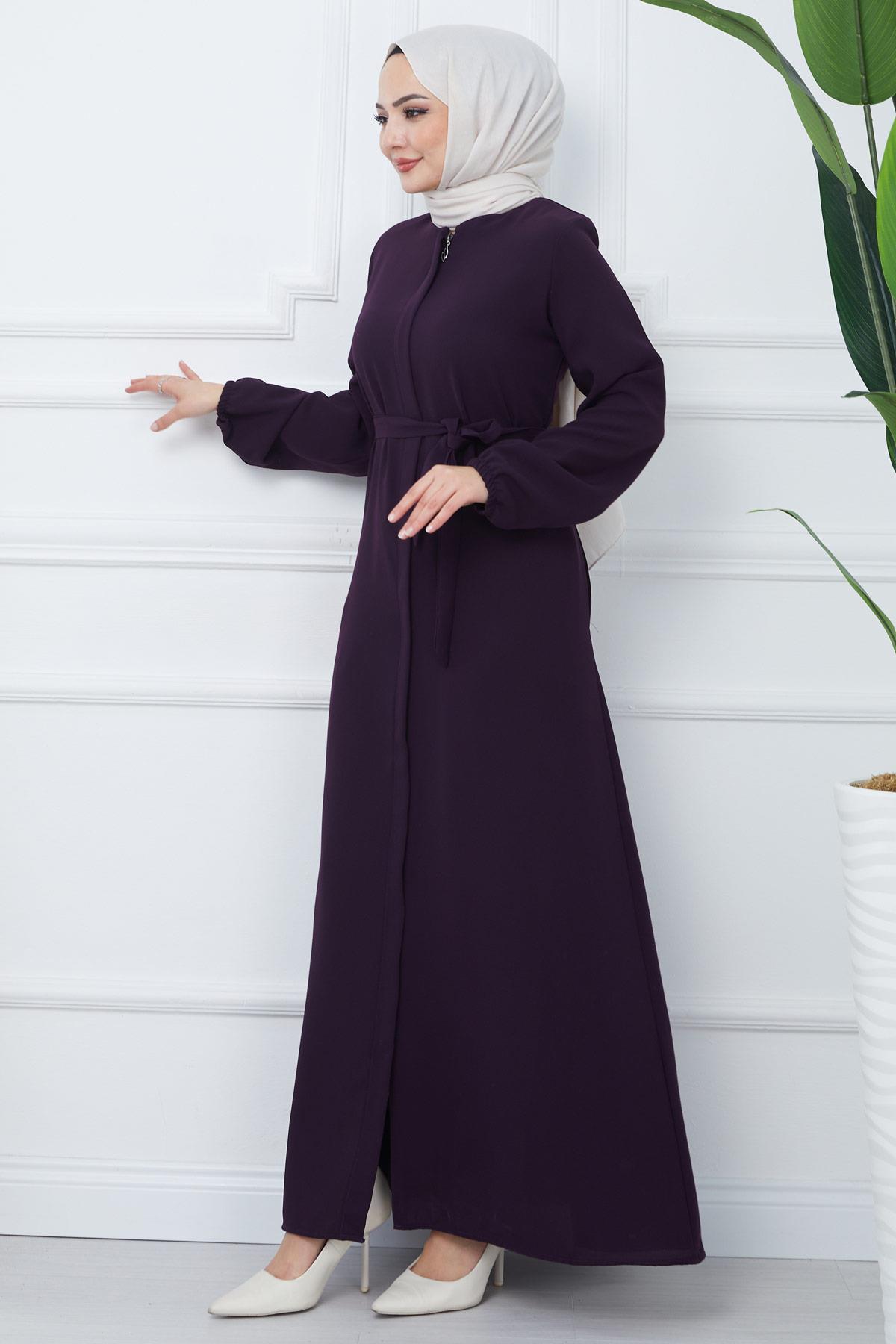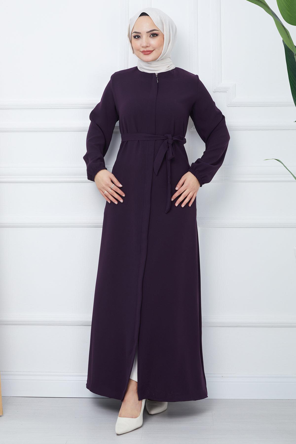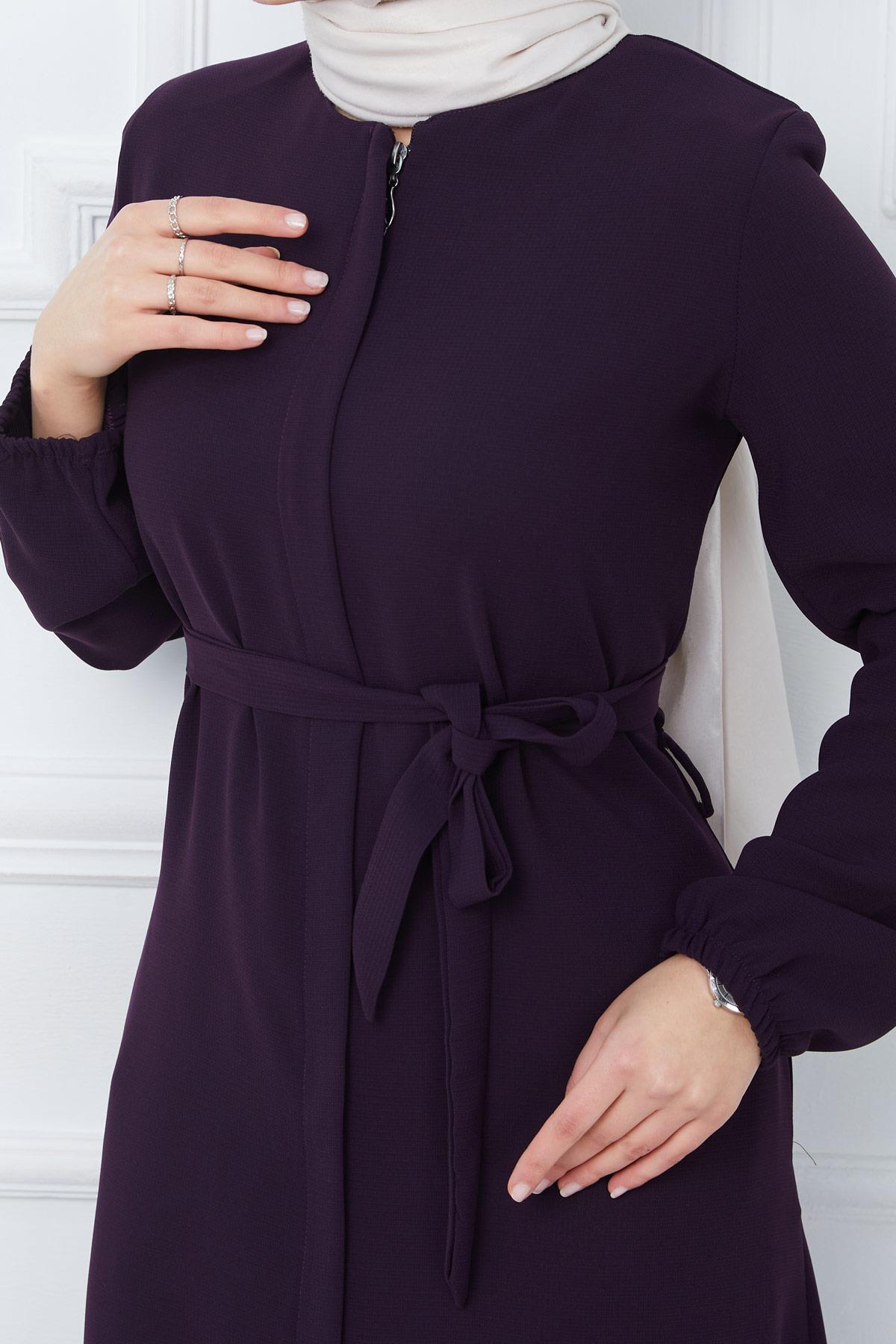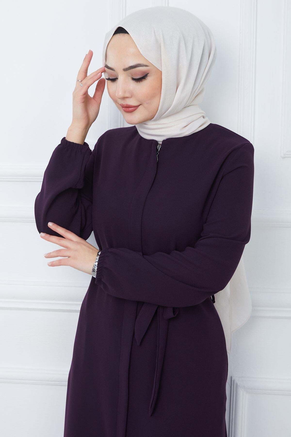Product Features: This is a full-length zippered abaya style . It closes with a hidden placket zipper at the front. It has two side pockets. It has a belted waist. The shoulders are padded, and the cuffs are elasticated ribbed. It is unlined. There may be a slight difference in color due to concept photography.