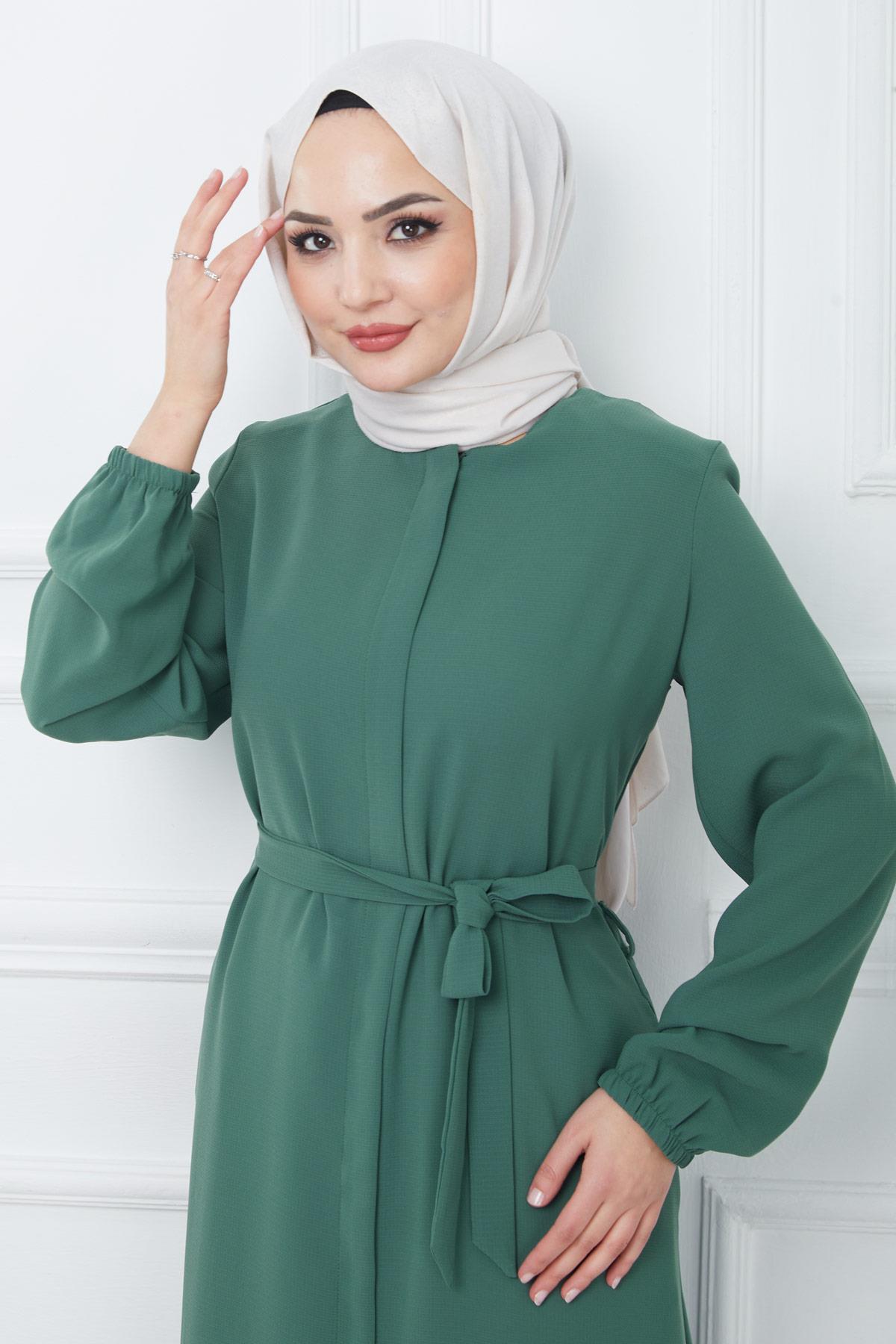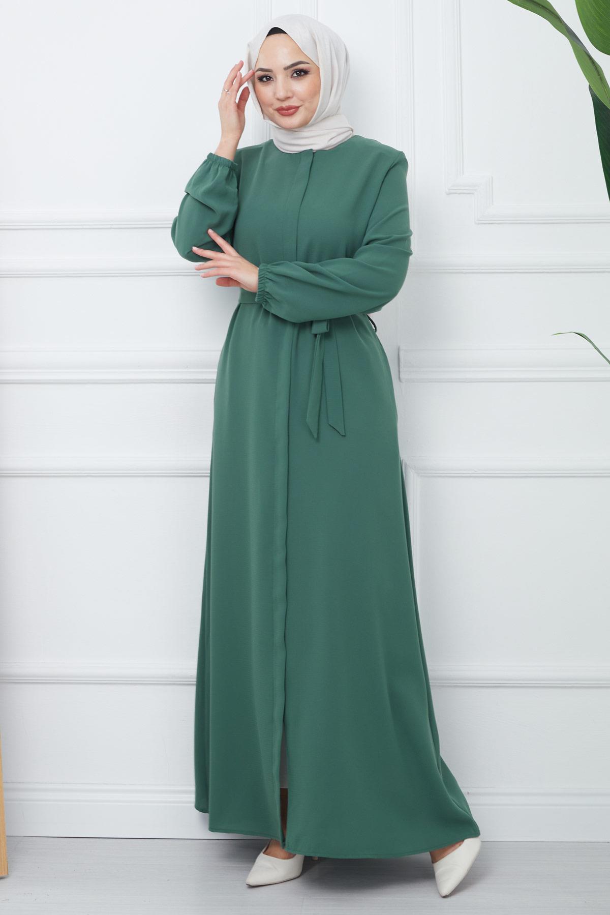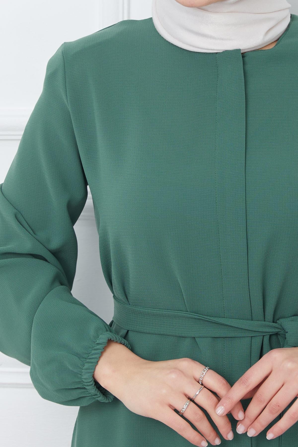 Hidden Placket Belted Abaya Green HM2361