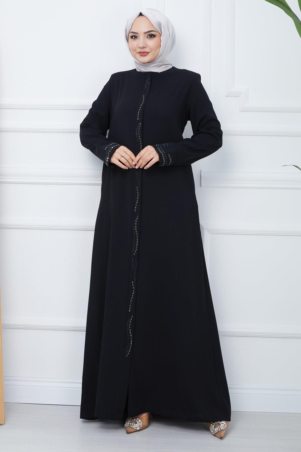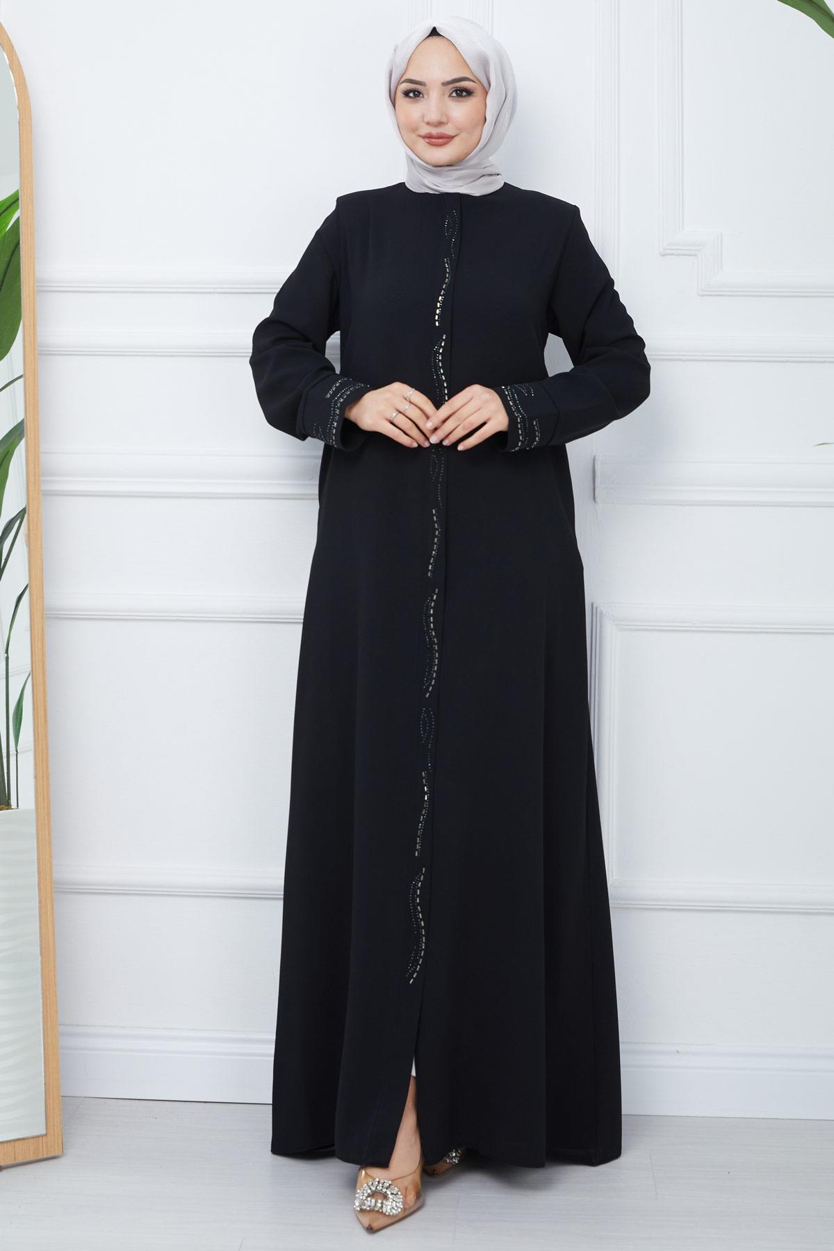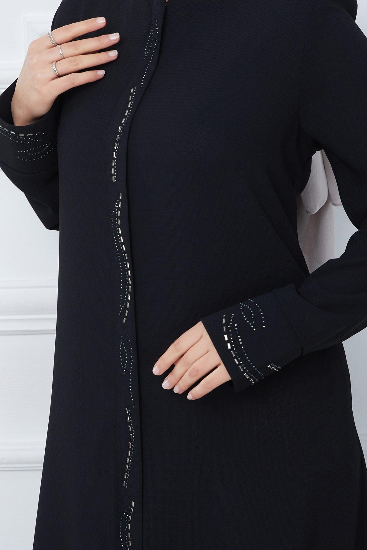 Product Features: This is a plus-size abaya model with full-length stone embellishments. It closes with a hidden placket and a front zipper. It has two side pockets. The shoulders are padded, and the cuffs have stone details. It is unlined. There may be a slight difference in color due to concept photography.