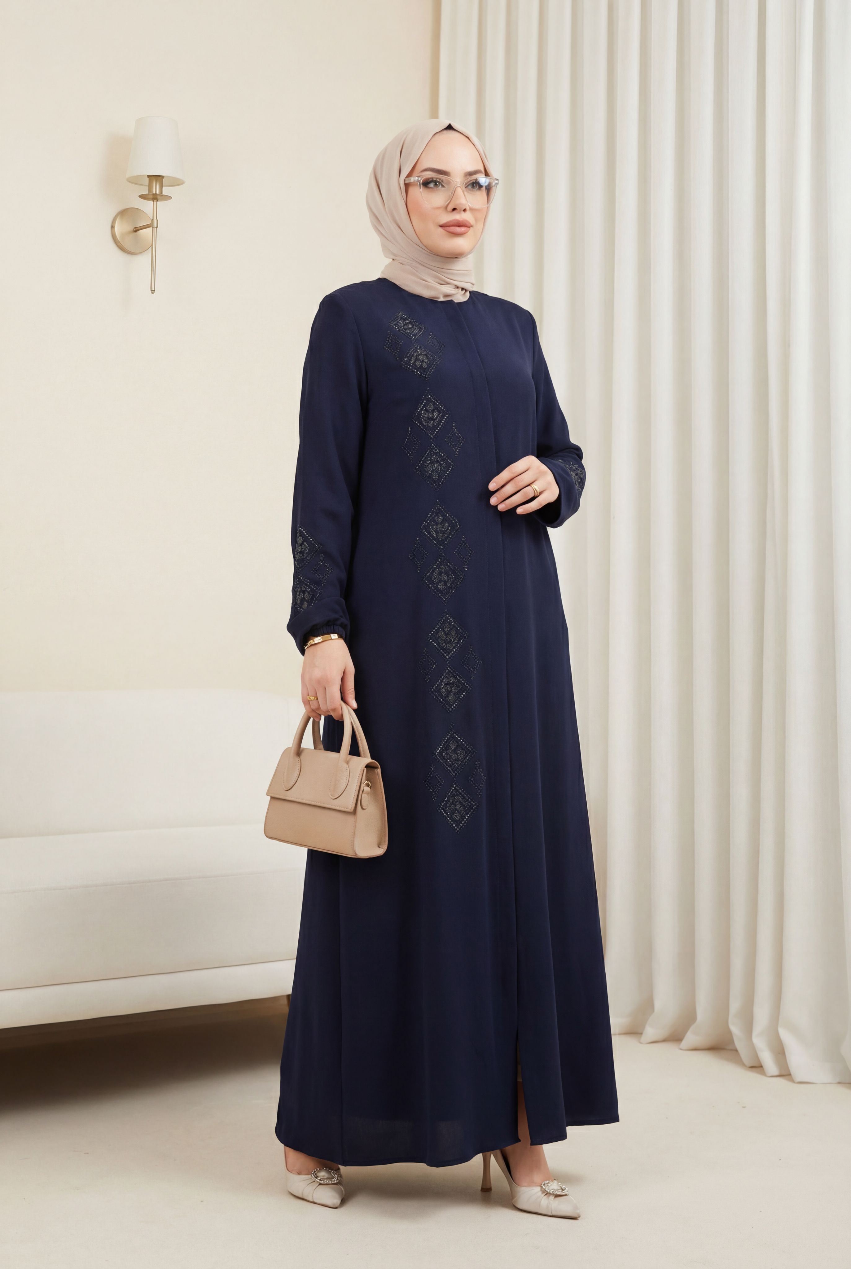 Leather Embroidered Abaya Navy Blue HM2849