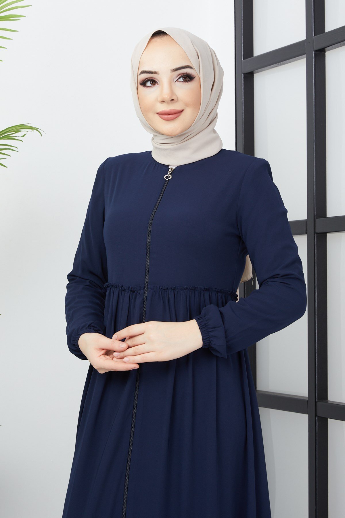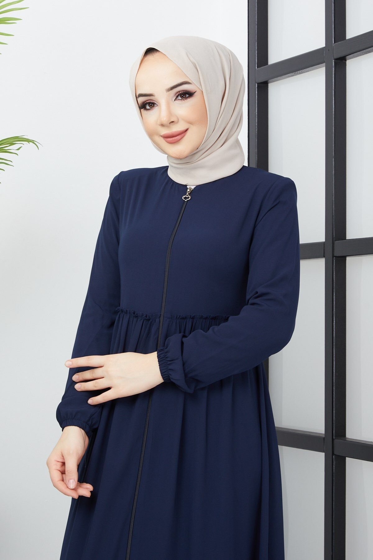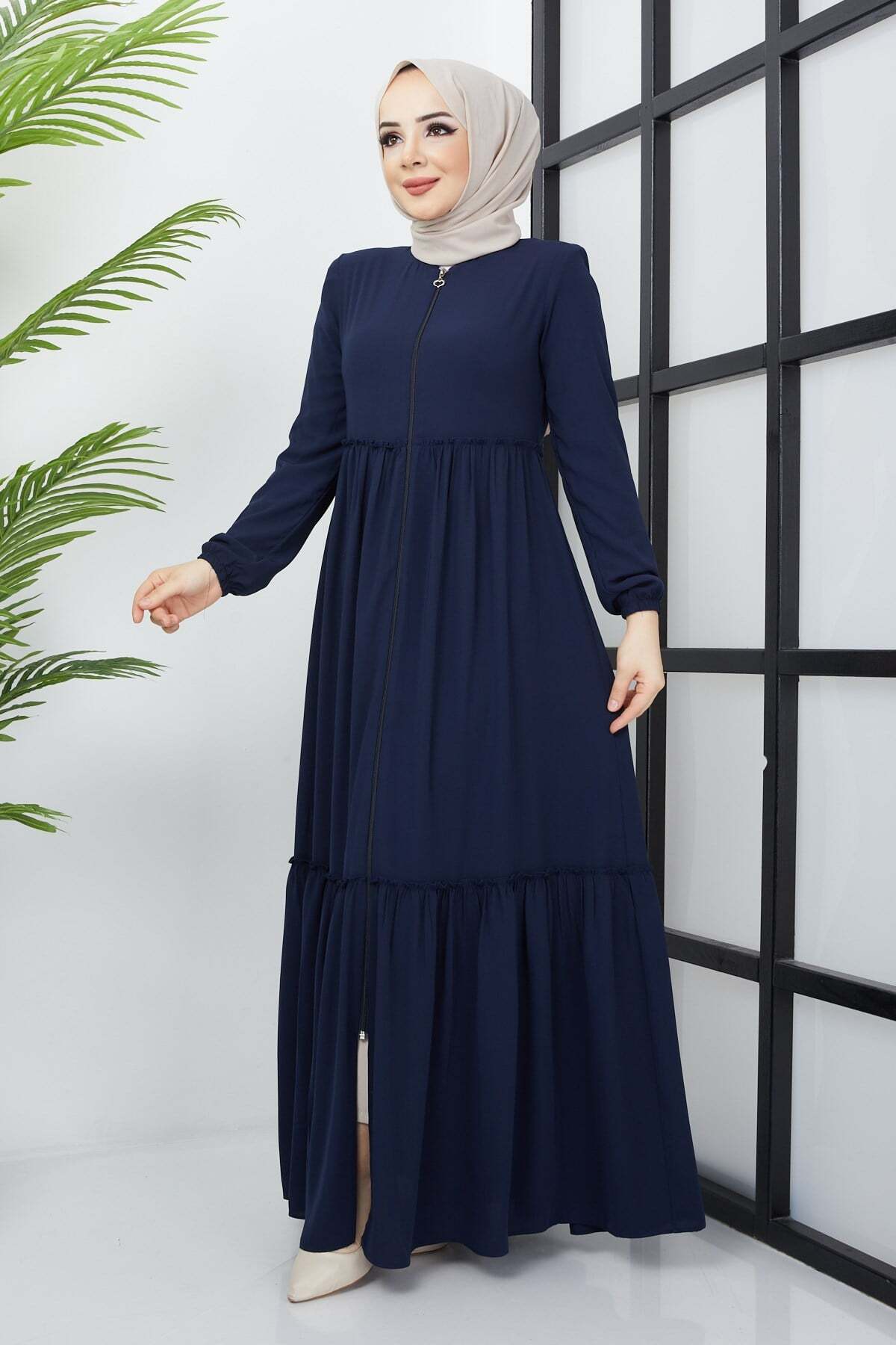 Product Features: This is a new season navy blue abaya model with ruching detail. It closes with a front zipper. It has ruching details at the front and back. It has shoulder pads. There may be a slight difference in color tone due to concept photos.
