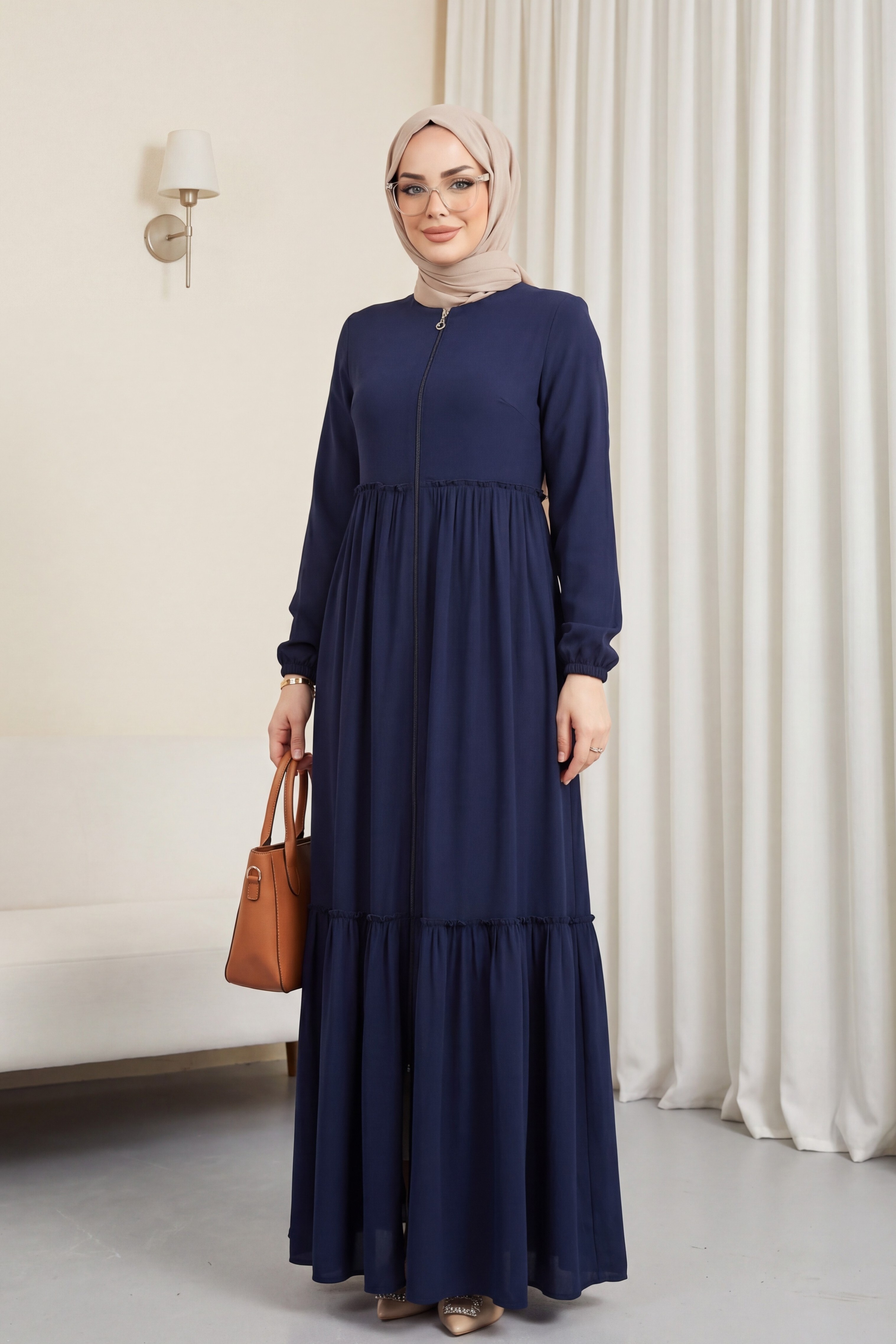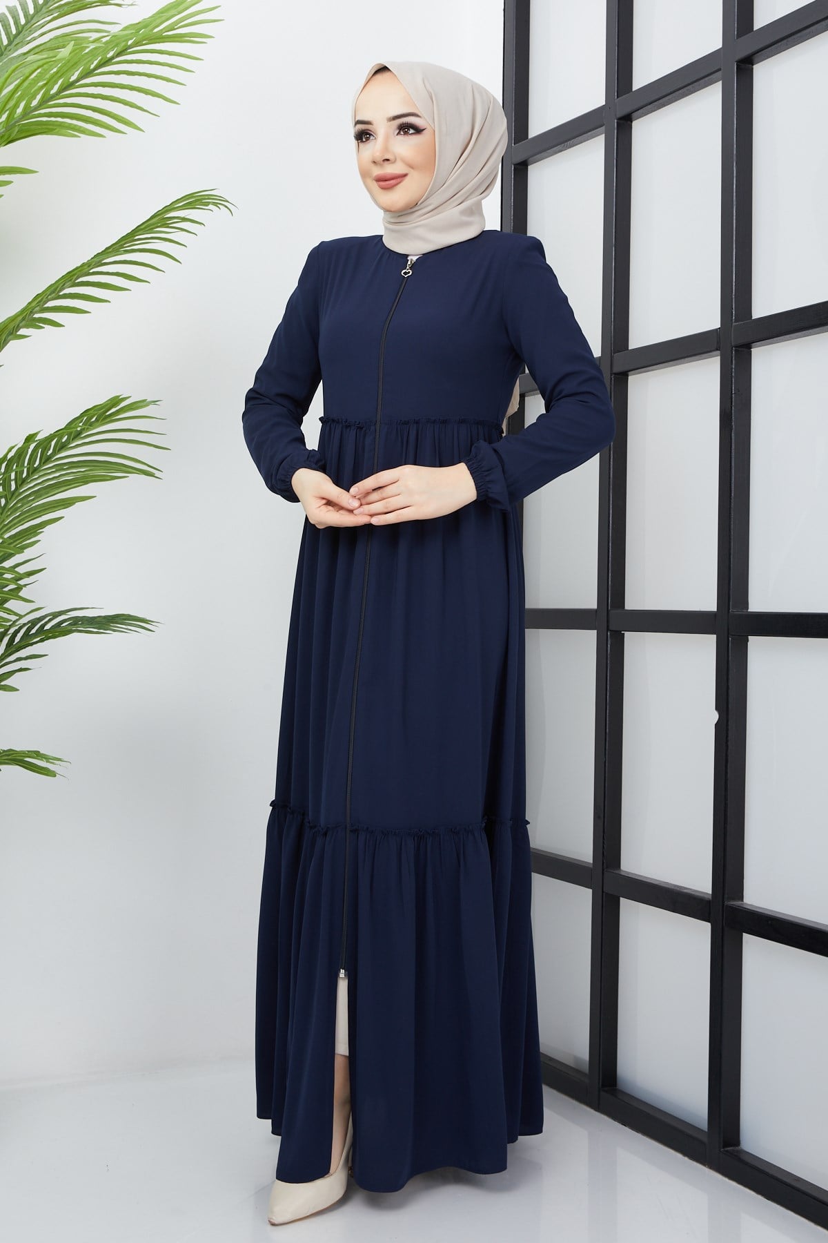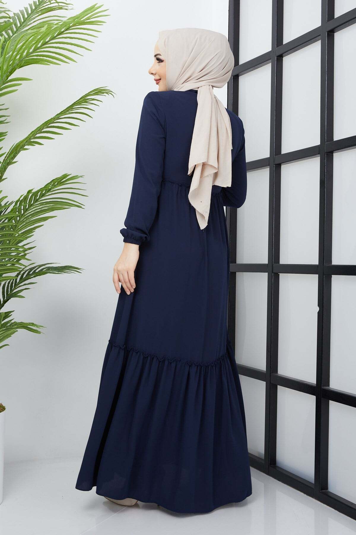 Product Features: This is a new season navy blue abaya model with ruching detail. It closes with a front zipper. It has ruching details at the front and back. It has shoulder pads. There may be a slight difference in color tone due to concept photos.