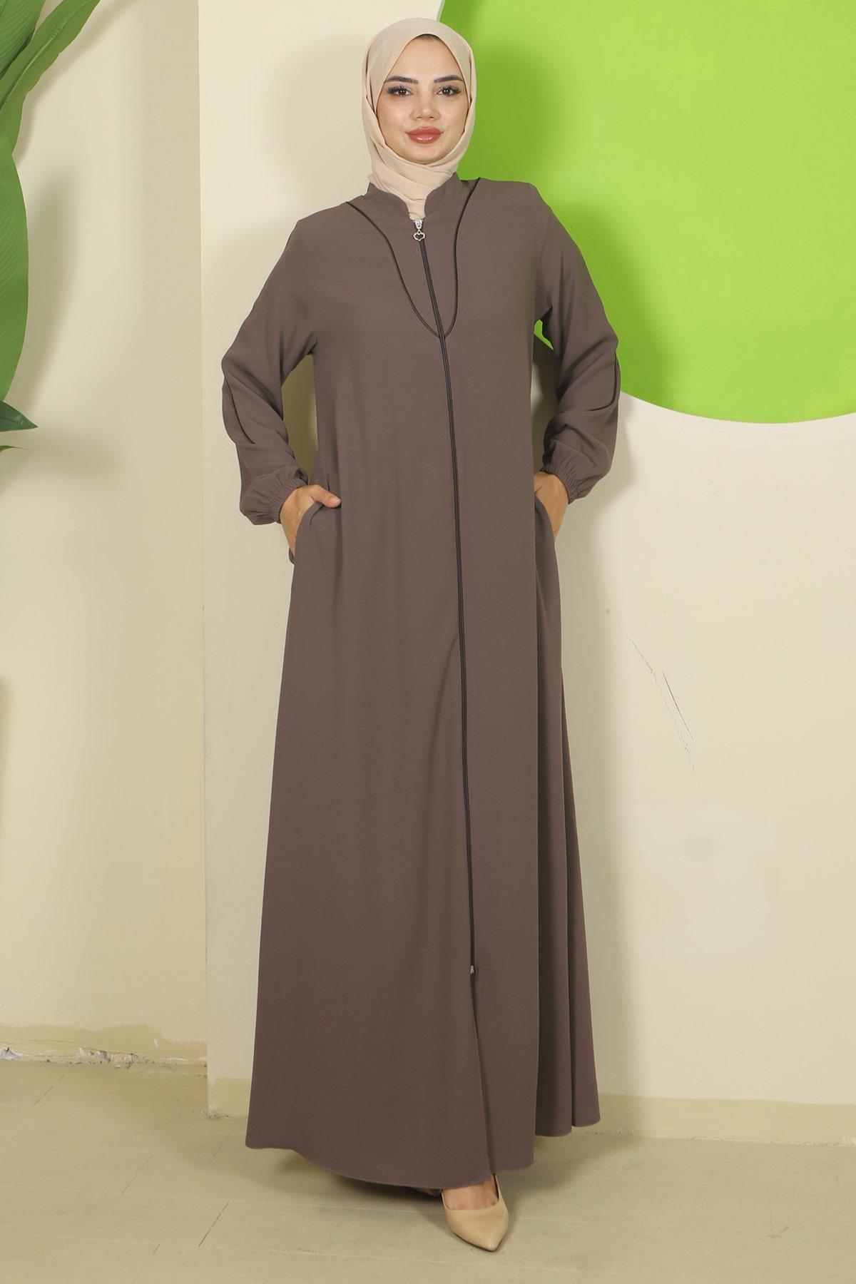 Product Features: This is a high-waisted, full-zip abaya model with piping details on the sleeves and collar. It has padded shoulders, side pockets, elasticated cuffs, and is unlined. There may be a slight difference in color due to concept photography.