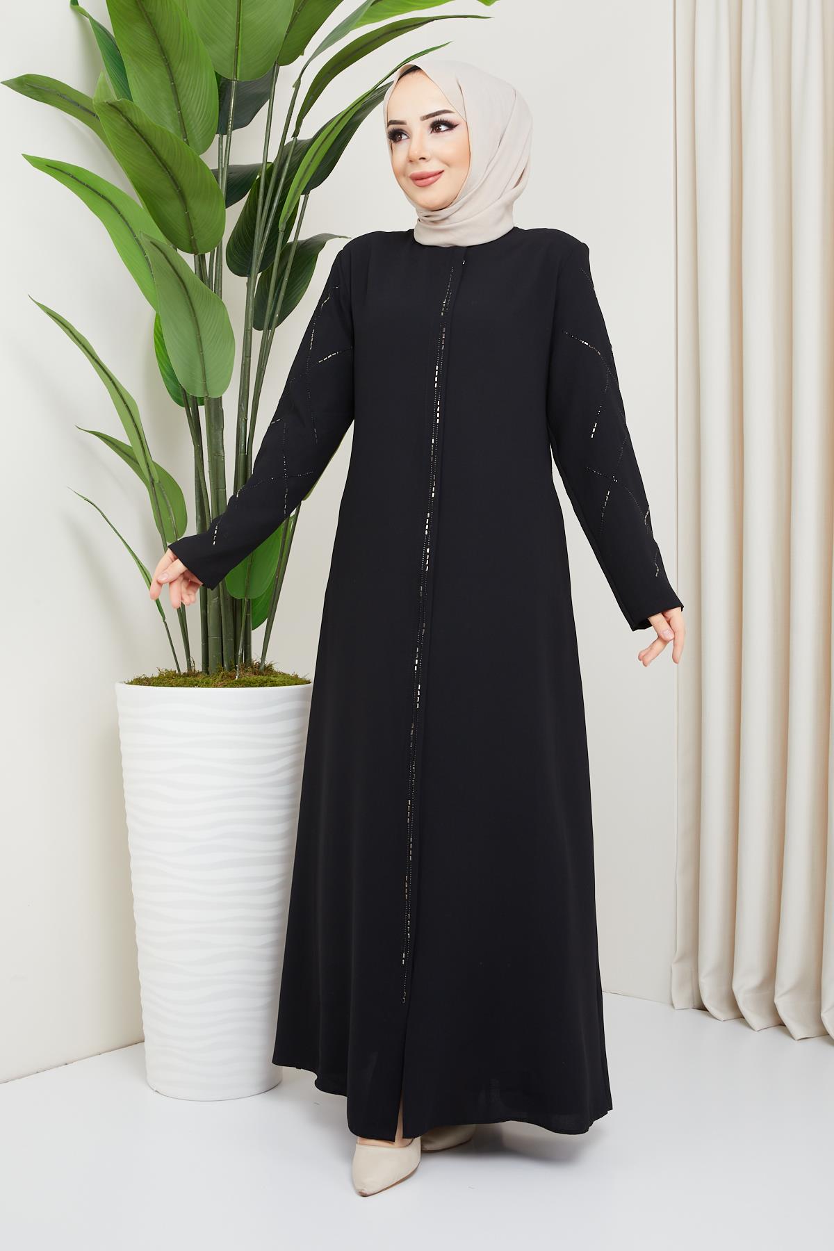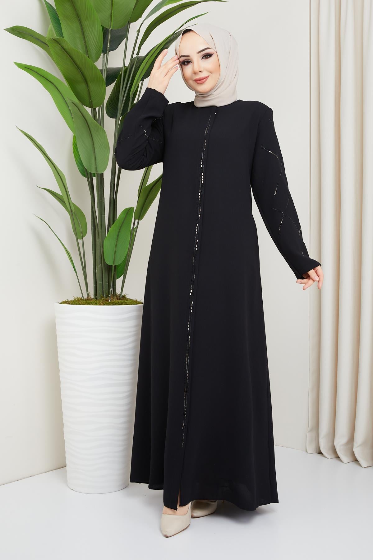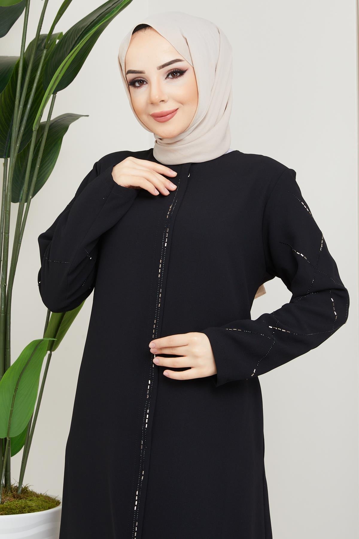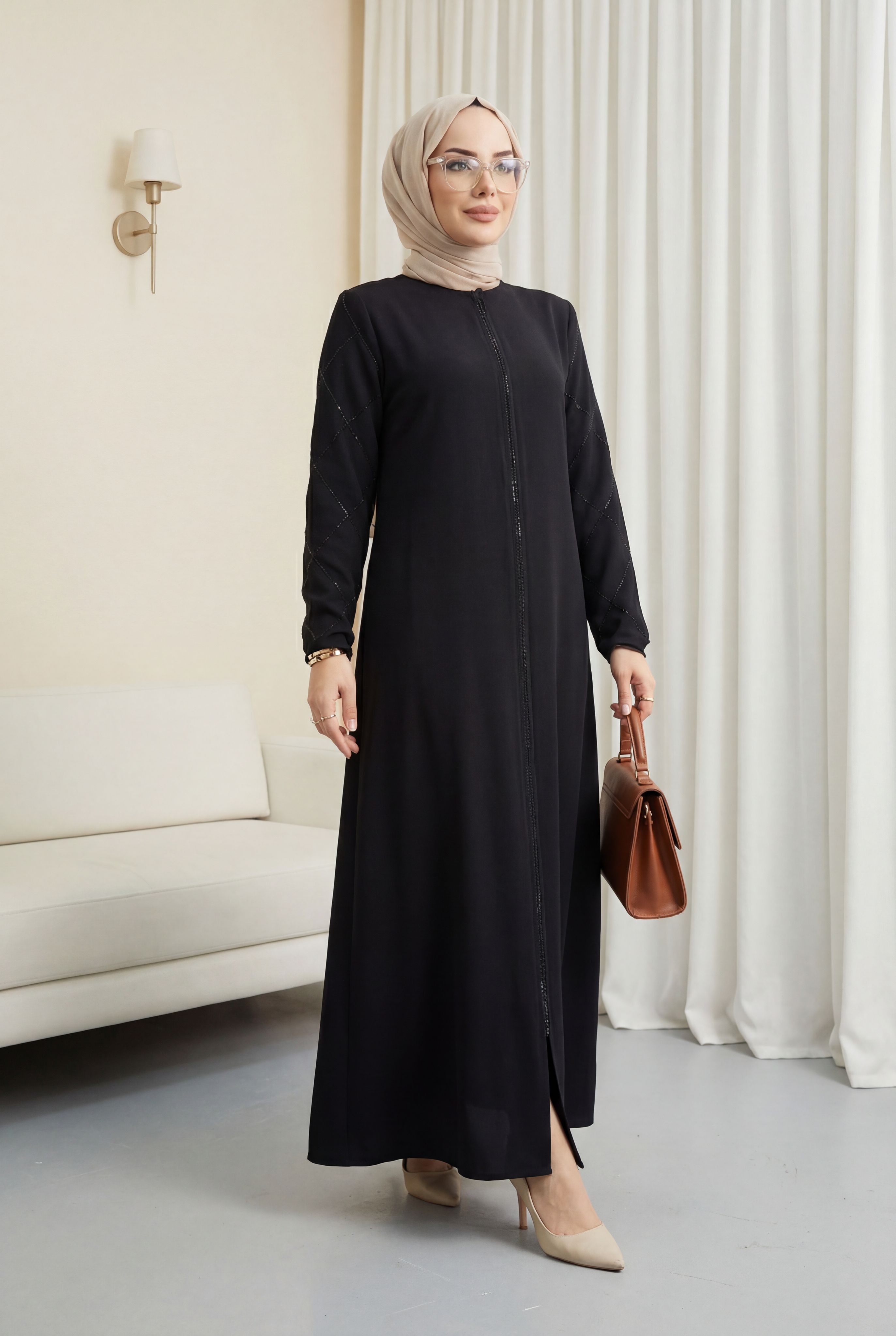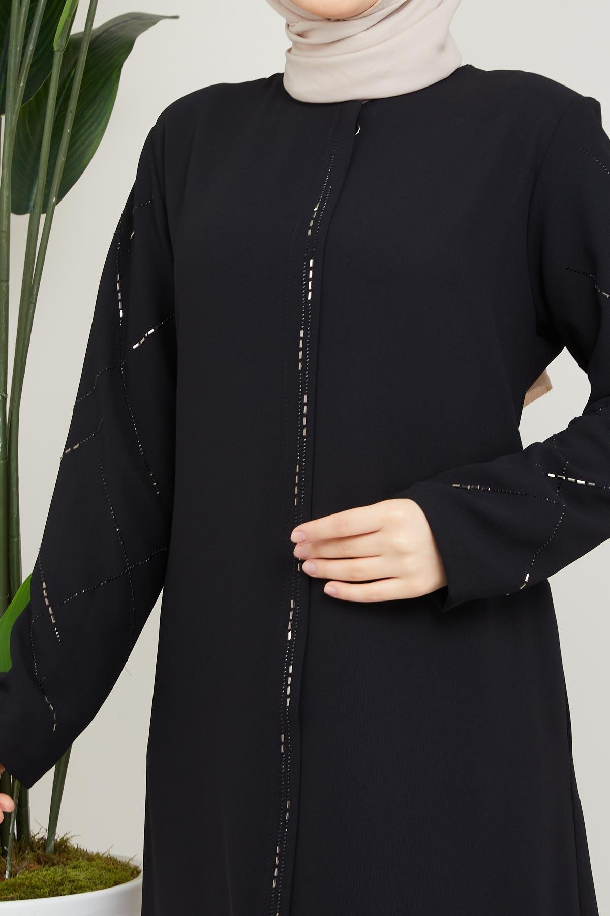 Product Features: This is a new season black abaya model with stone details. It closes with a front zipper. The garment has two functional pockets. It has padded shoulders. The front placket and sleeves are detailed with stones. There may be a slight difference in color due to concept photography.