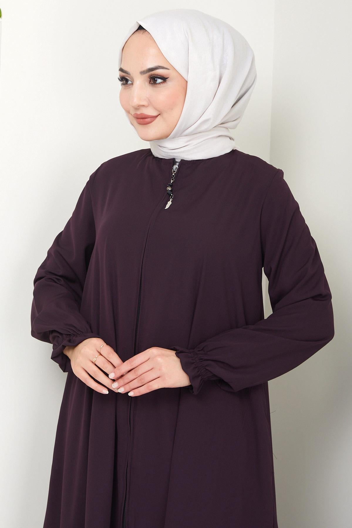 Product Features: This is a new season summer crew neck plus size Mevlana abaya model. It closes with a front zipper. The product has two functional pockets. It has padded shoulders. The sleeves have elastic cuffs. It is unlined. There may be a slight difference in color due to concept photos.