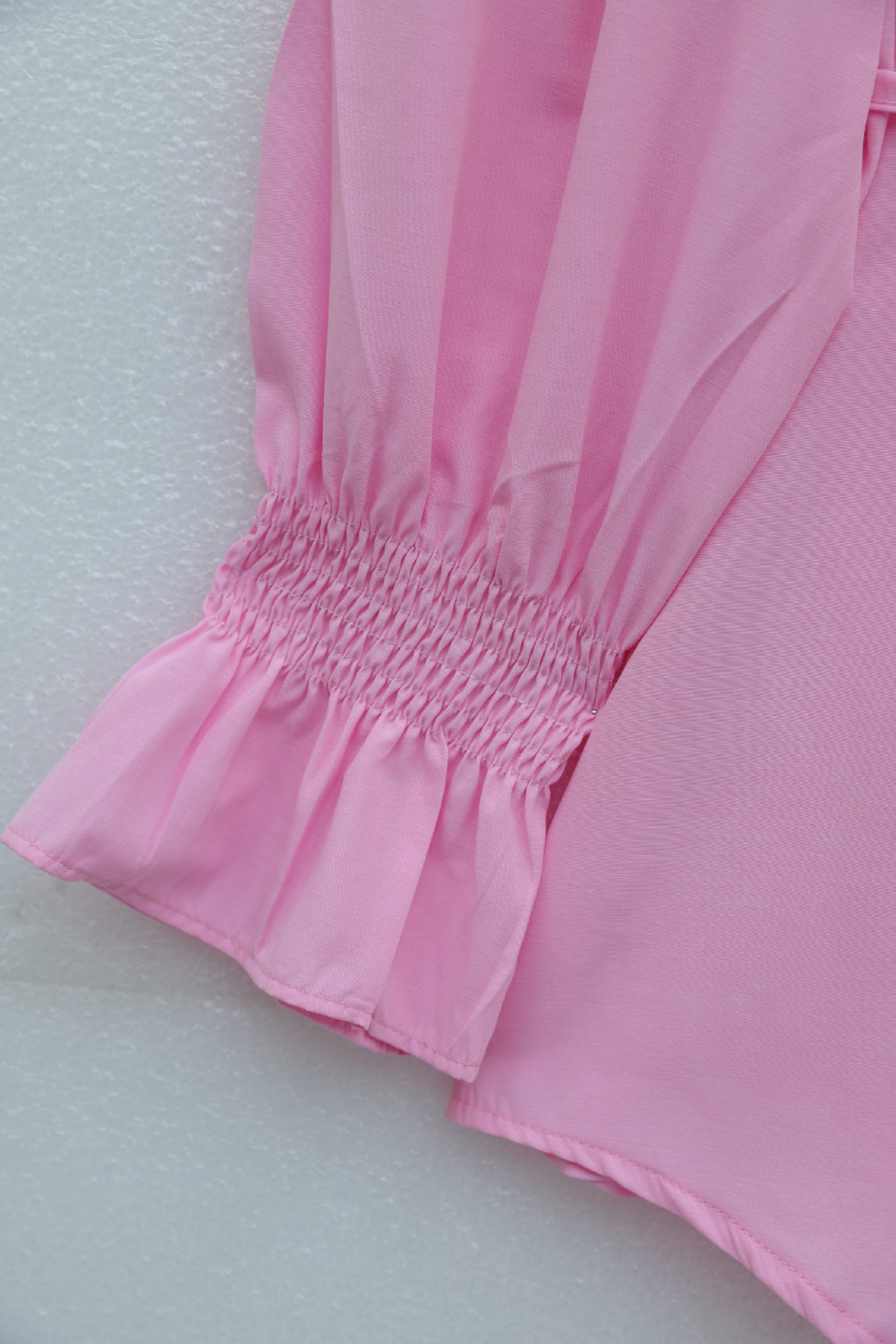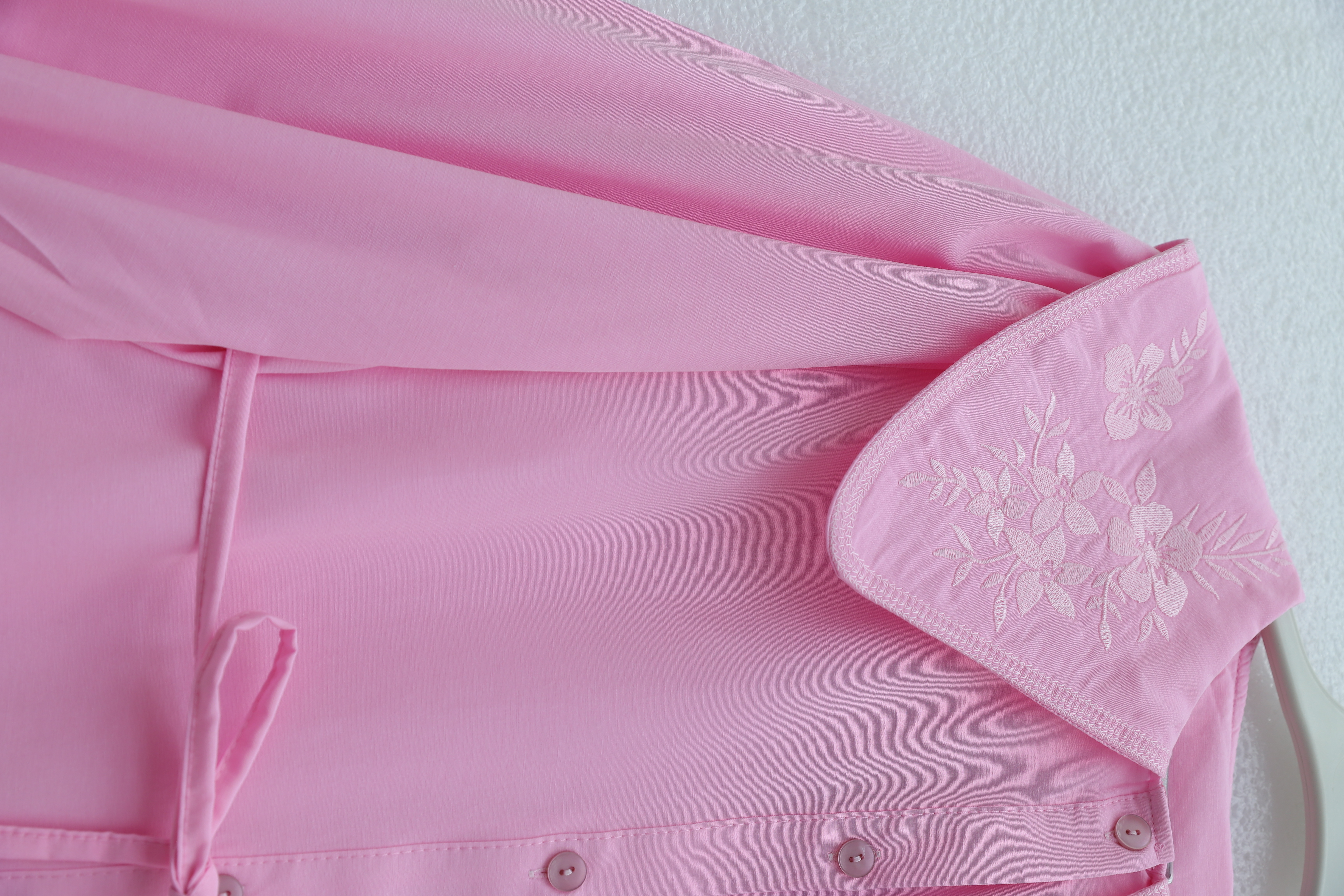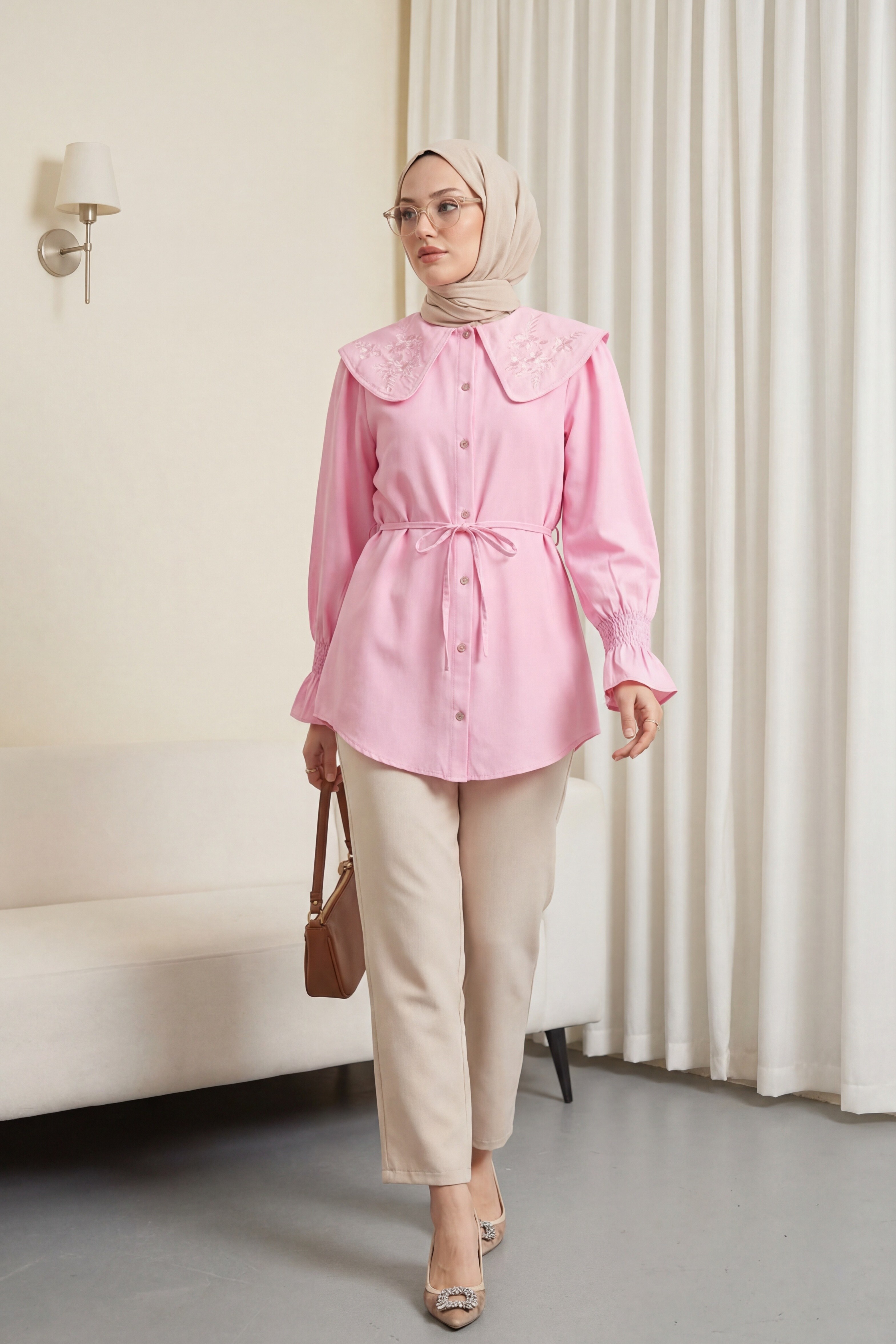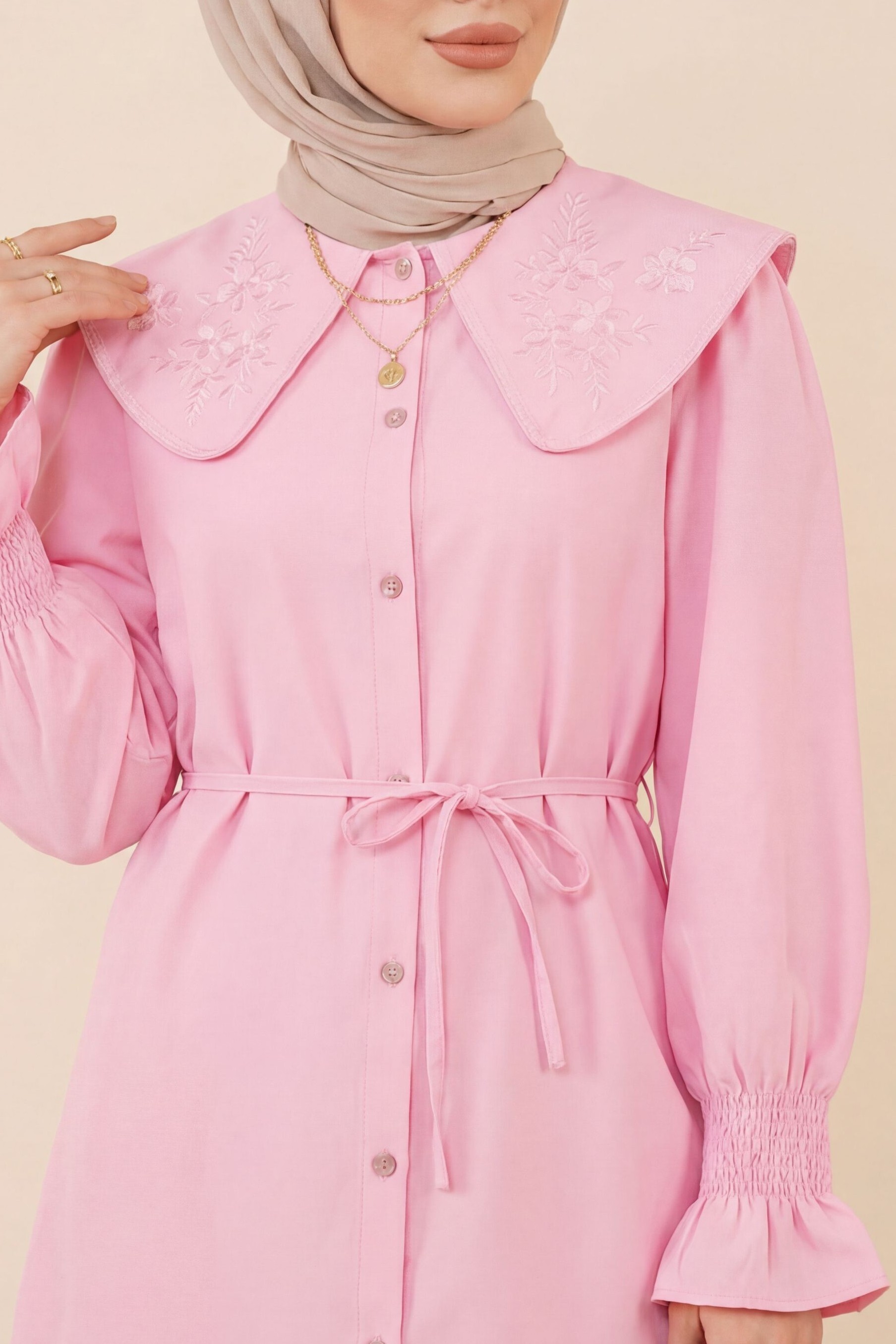 Baby Collar Embroidered Poplin Shirt with Tie Waist -Pink