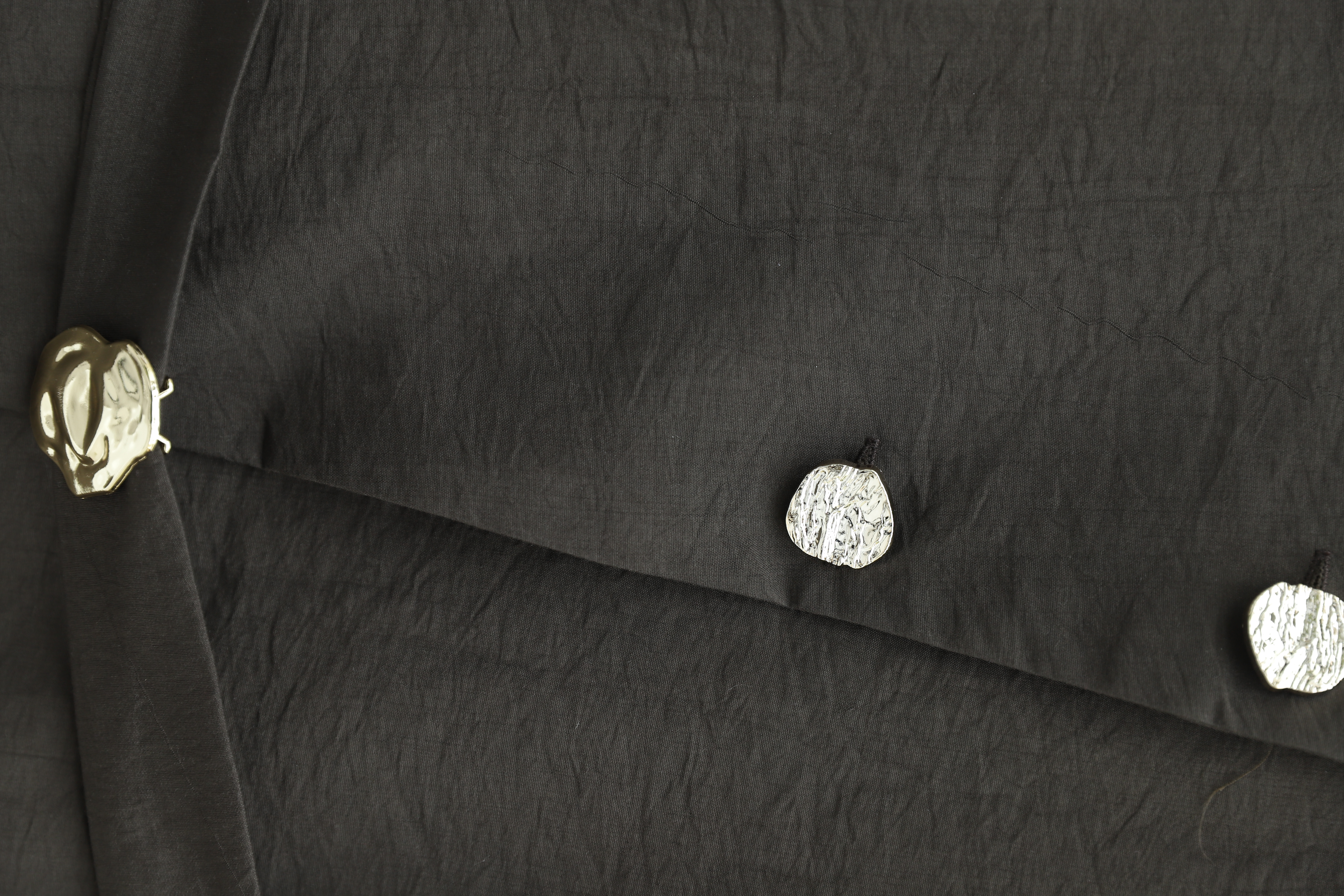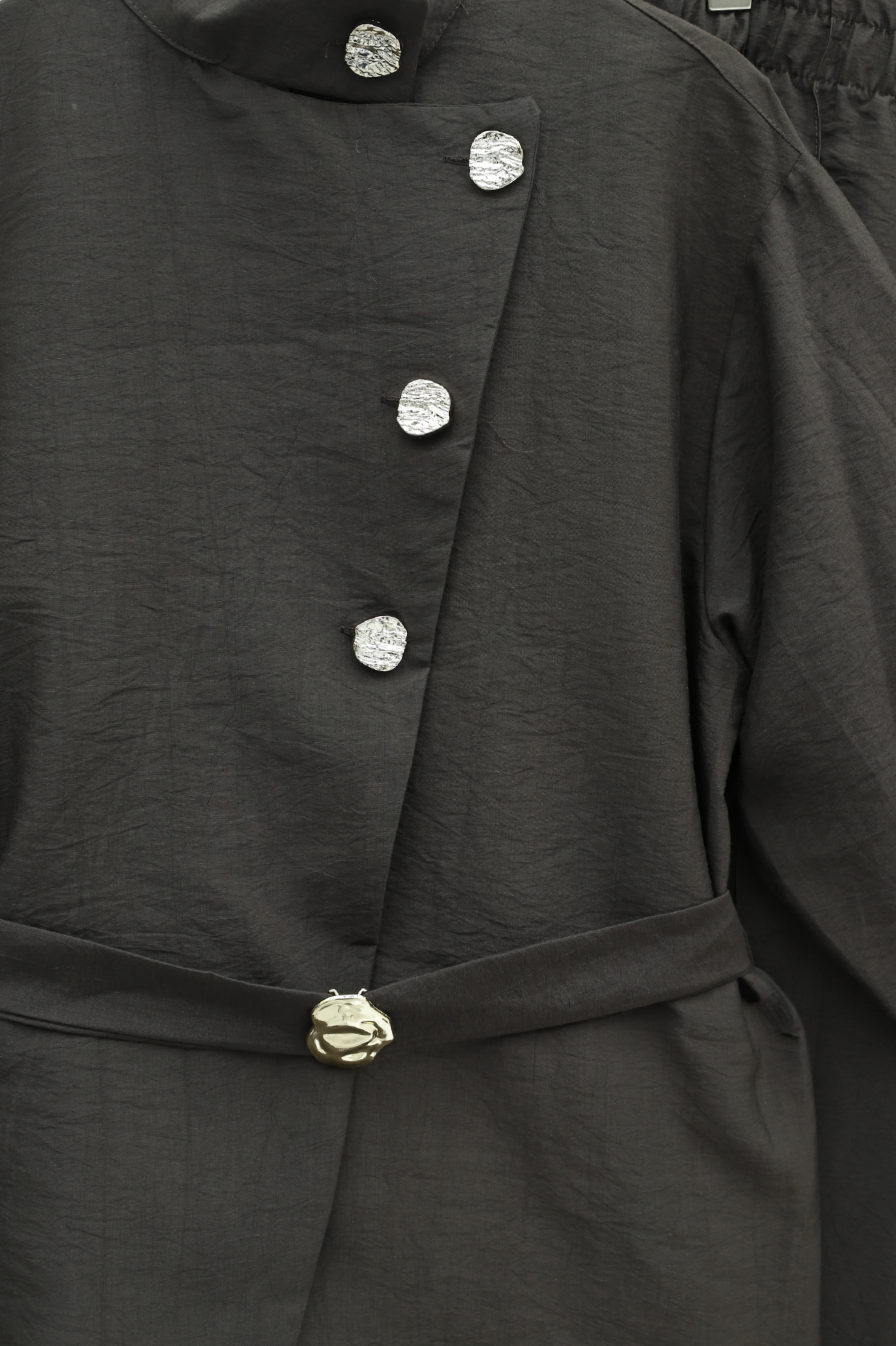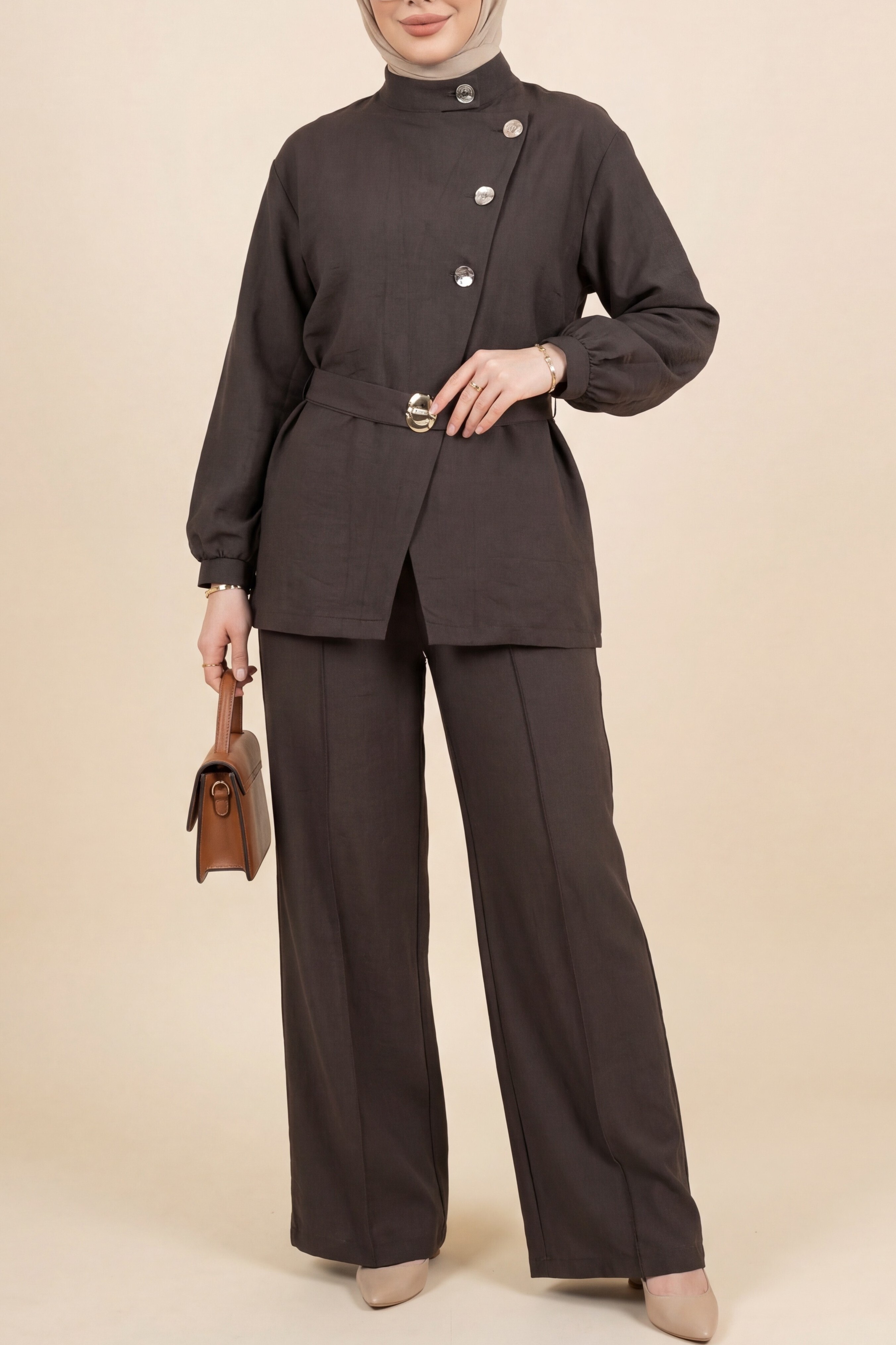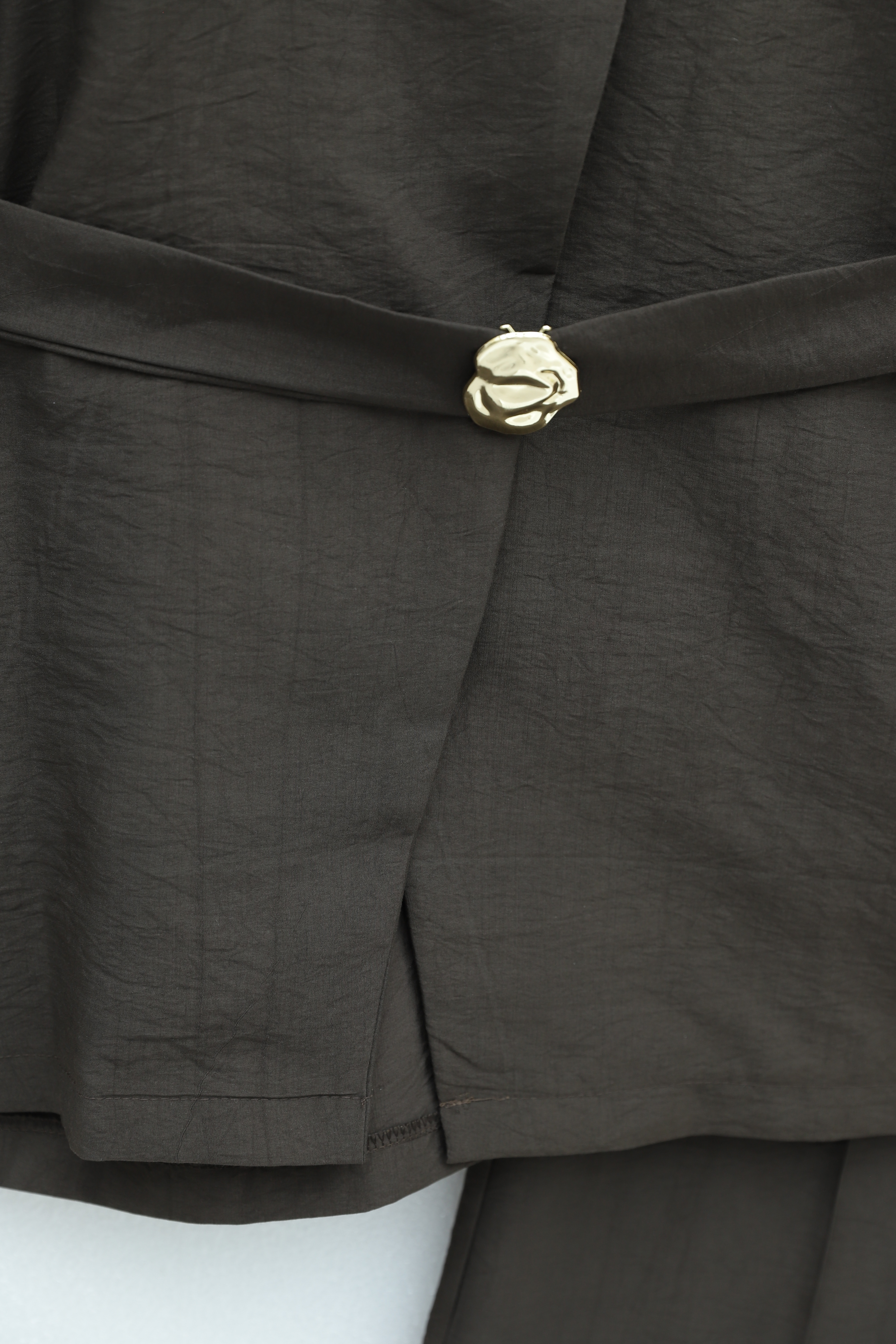 Cupra Suit with Gold Buttons, Buckle, Belt, and Ruffle Details -Dark Coffee