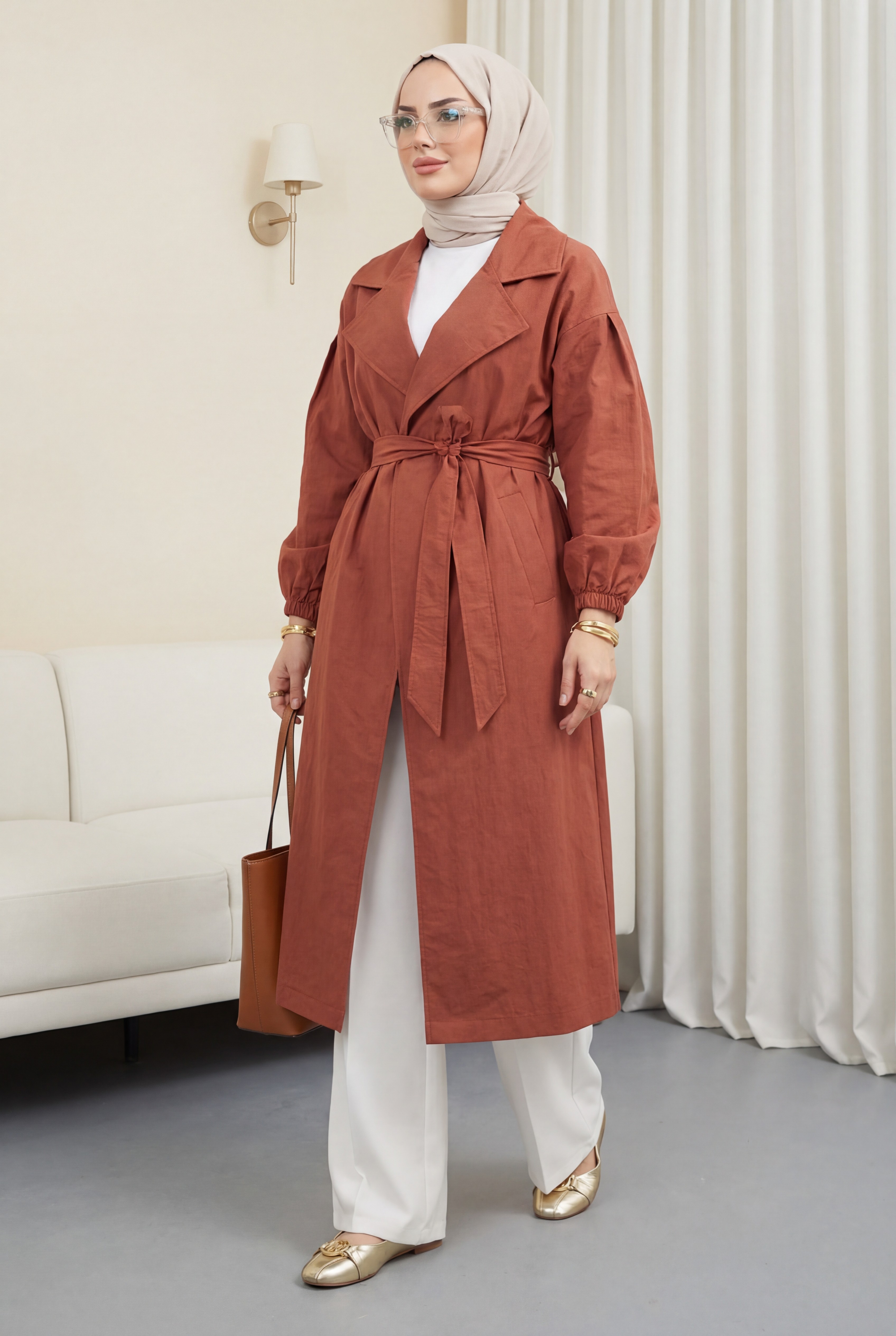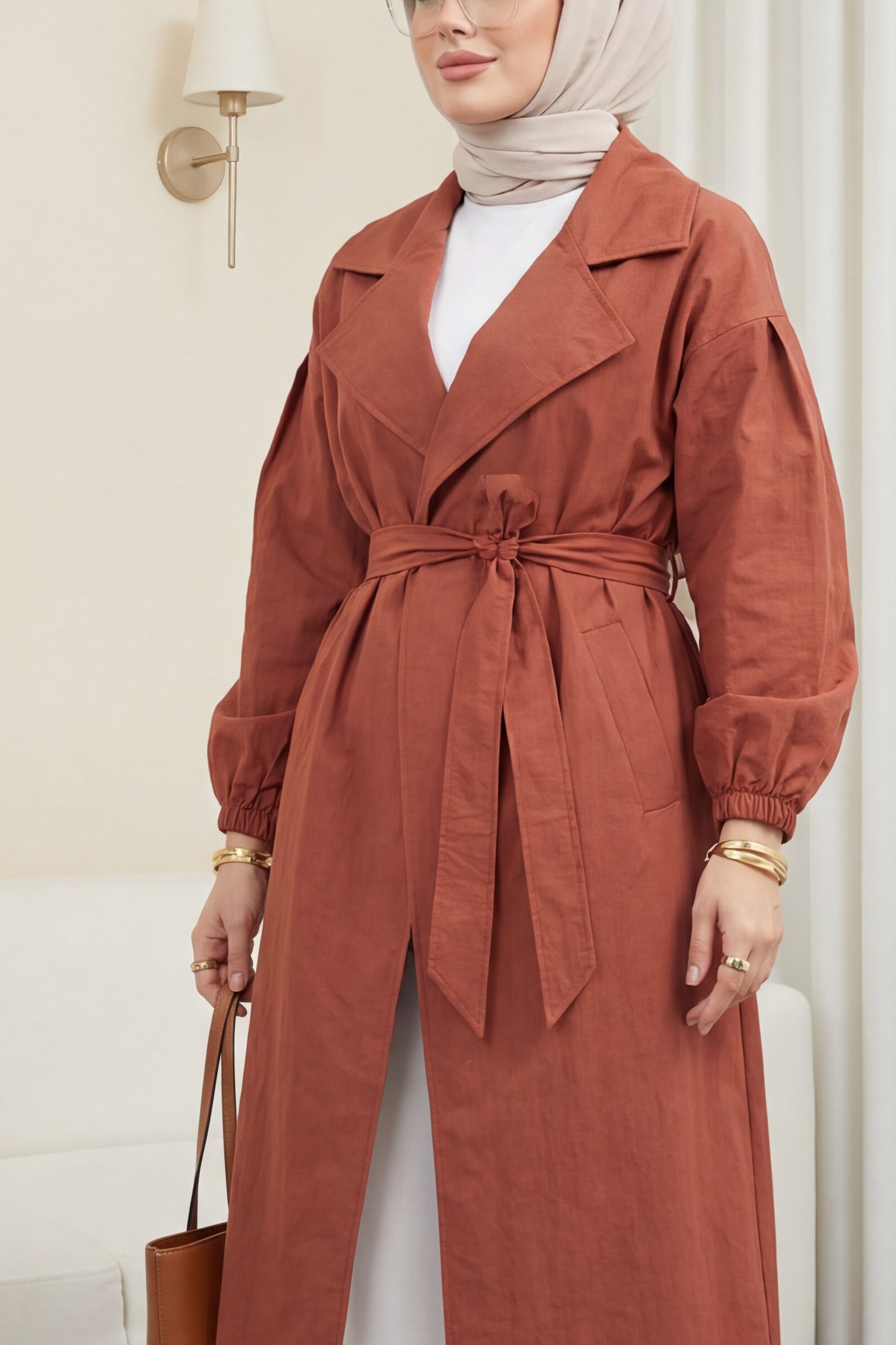 Belted Lined Trench Coat with Elastic Sleeves -Brick color