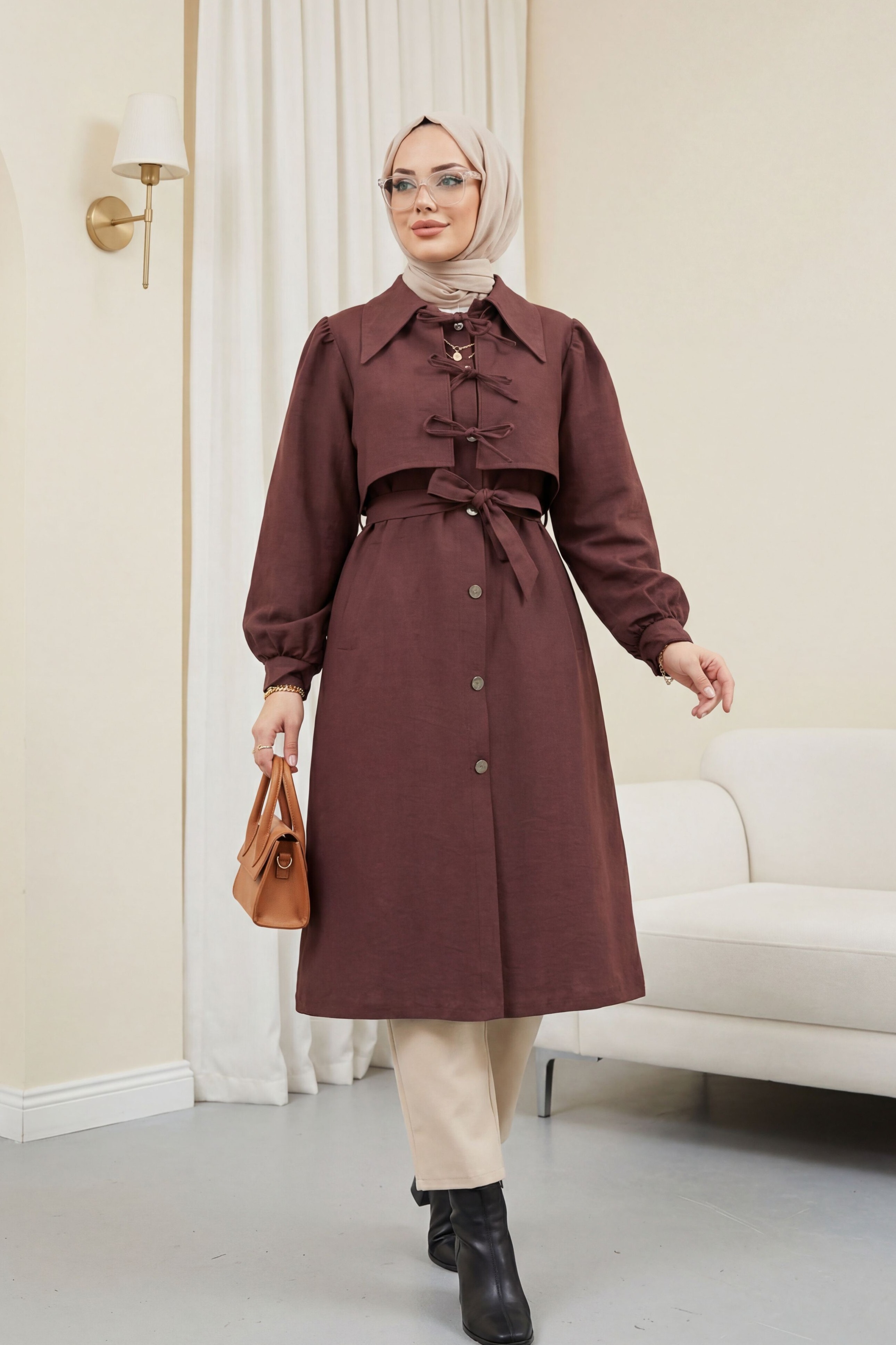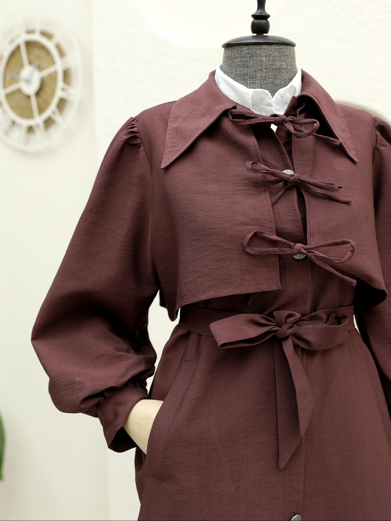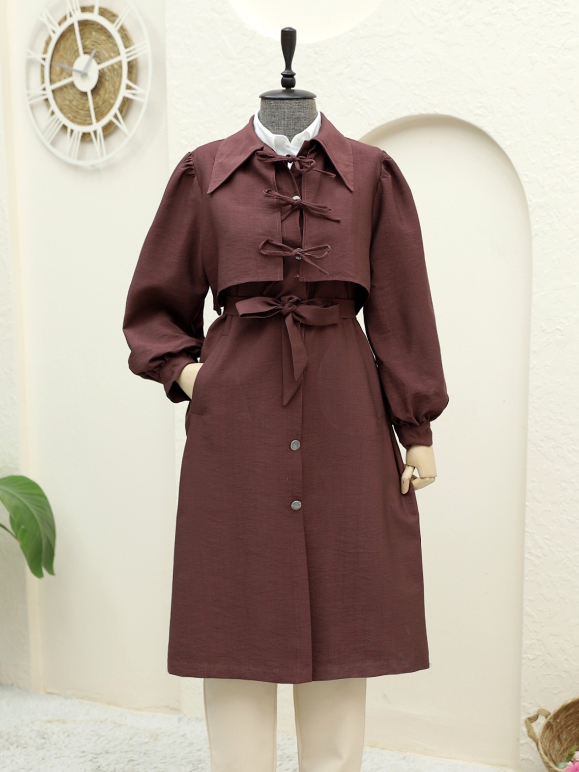 Front Tie Detail Buttoned Pocket Trench Coat -Damson