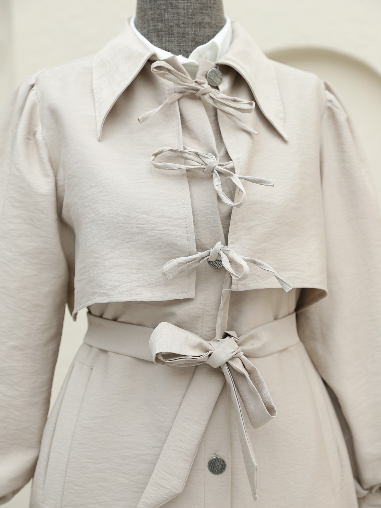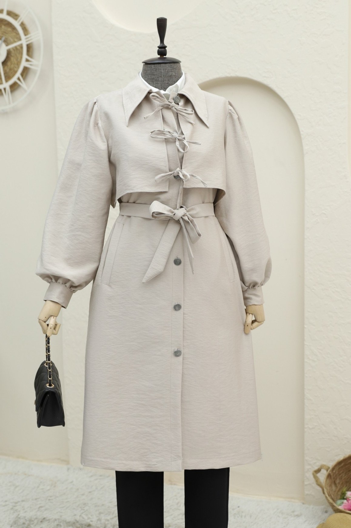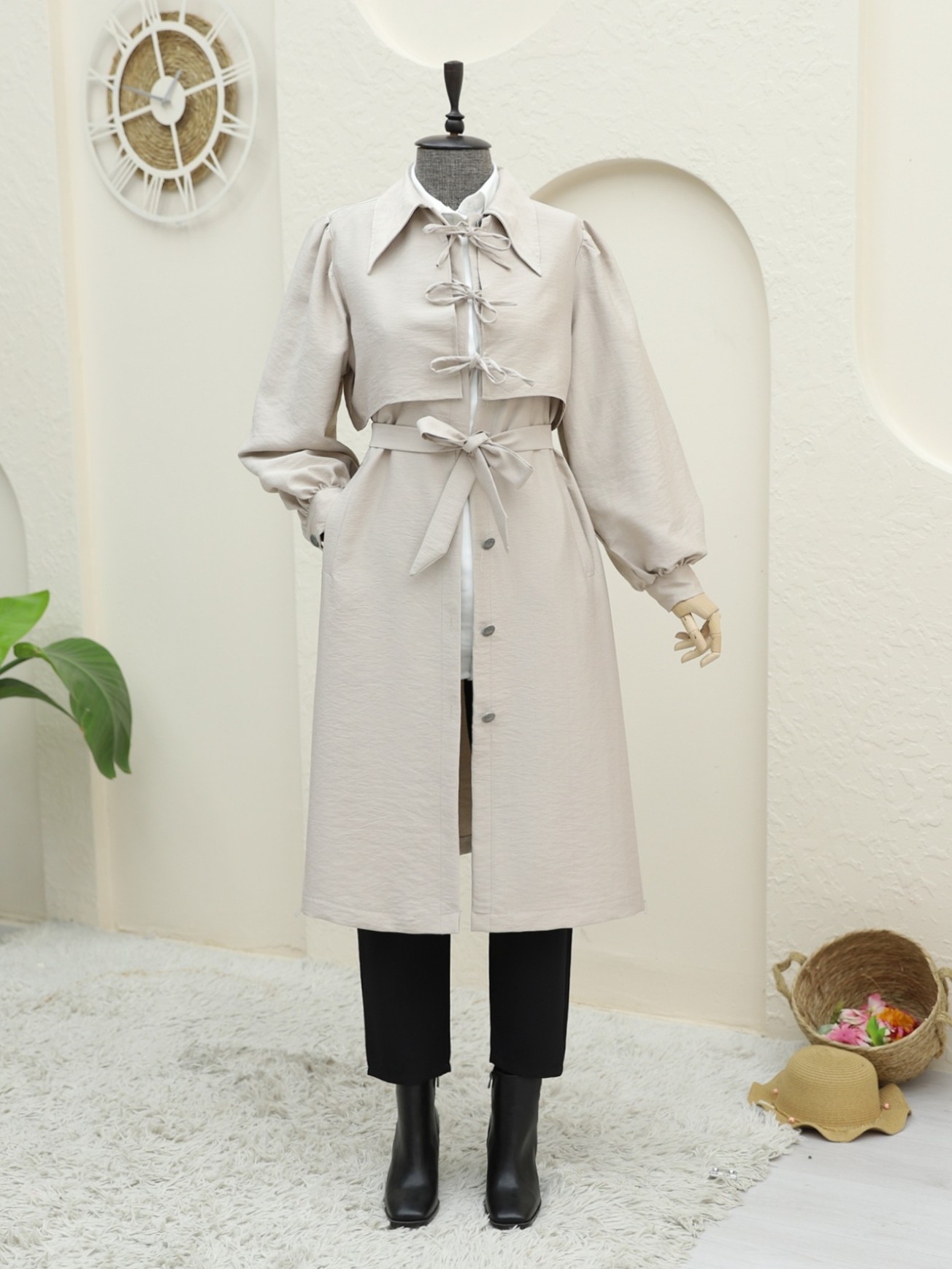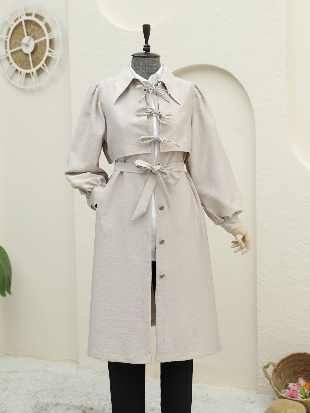 The Buttoned Pocket Trench Coat with Front Tie Detail combines elegance and functionality. The front tie detail creates a modern and sophisticated look, while the button and pocket design adds practicality. This trench coat keeps you warm in colder weather without compromising on style. Ideal for both everyday wear and special occasions, it complements any style effortlessly.