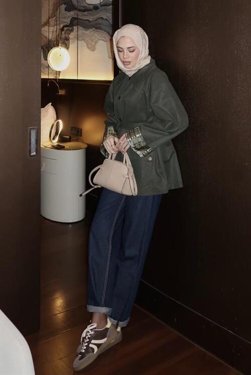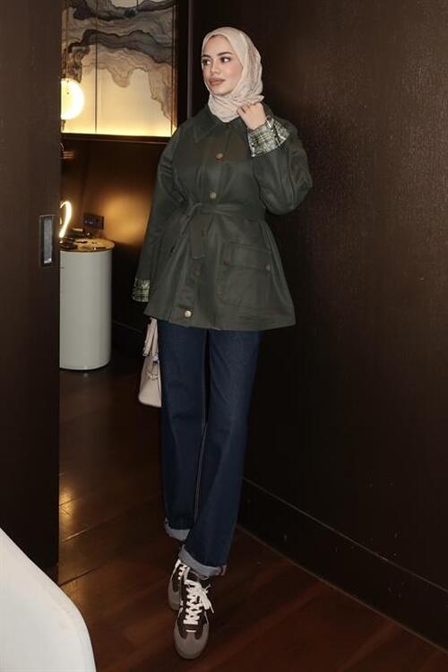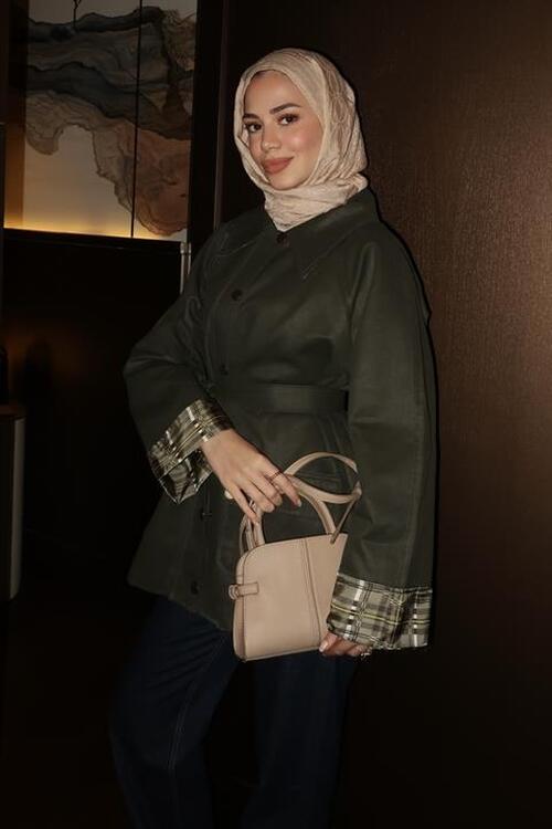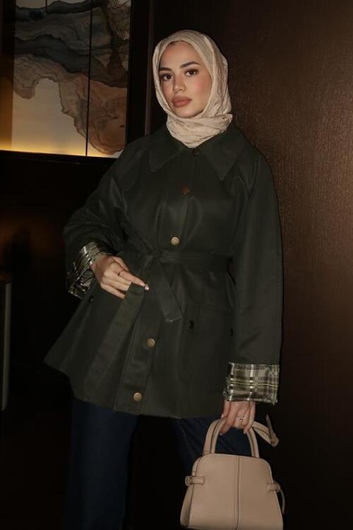 The plaid detailed trench coat is a stylish outerwear piece that adds plaid patterned fabric pieces to the classic trench coat model.