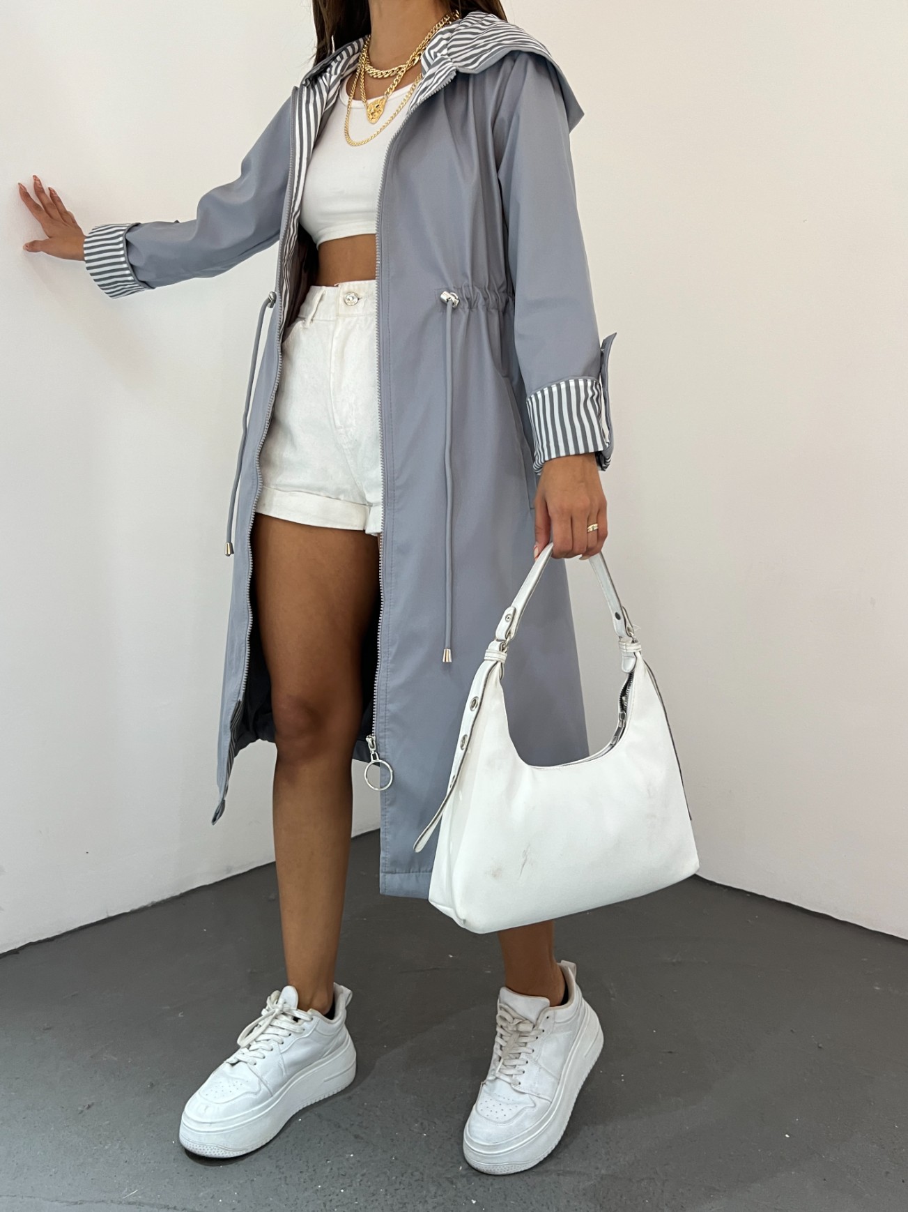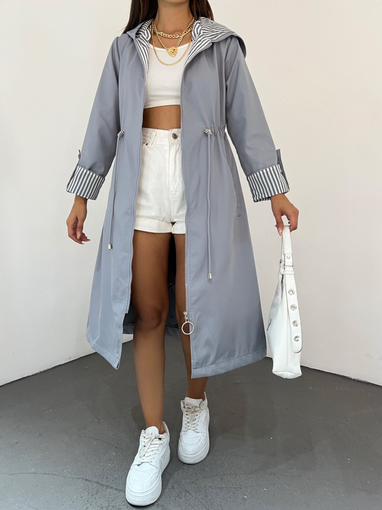 Our hooded, 2-pocket, gathered waist, folded sleeve trench coat model has taken its place among the most trendy models of the new season.