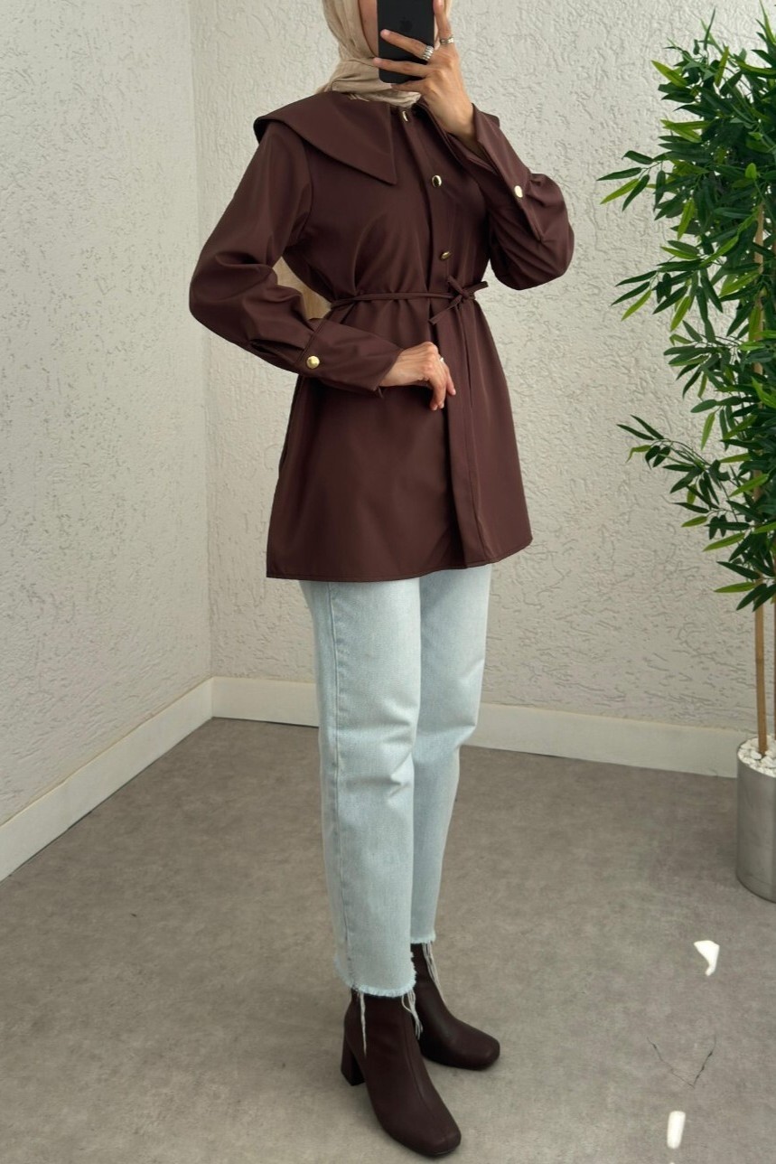 Wide Collared Waist-Tied Bonding Cape -Brown
