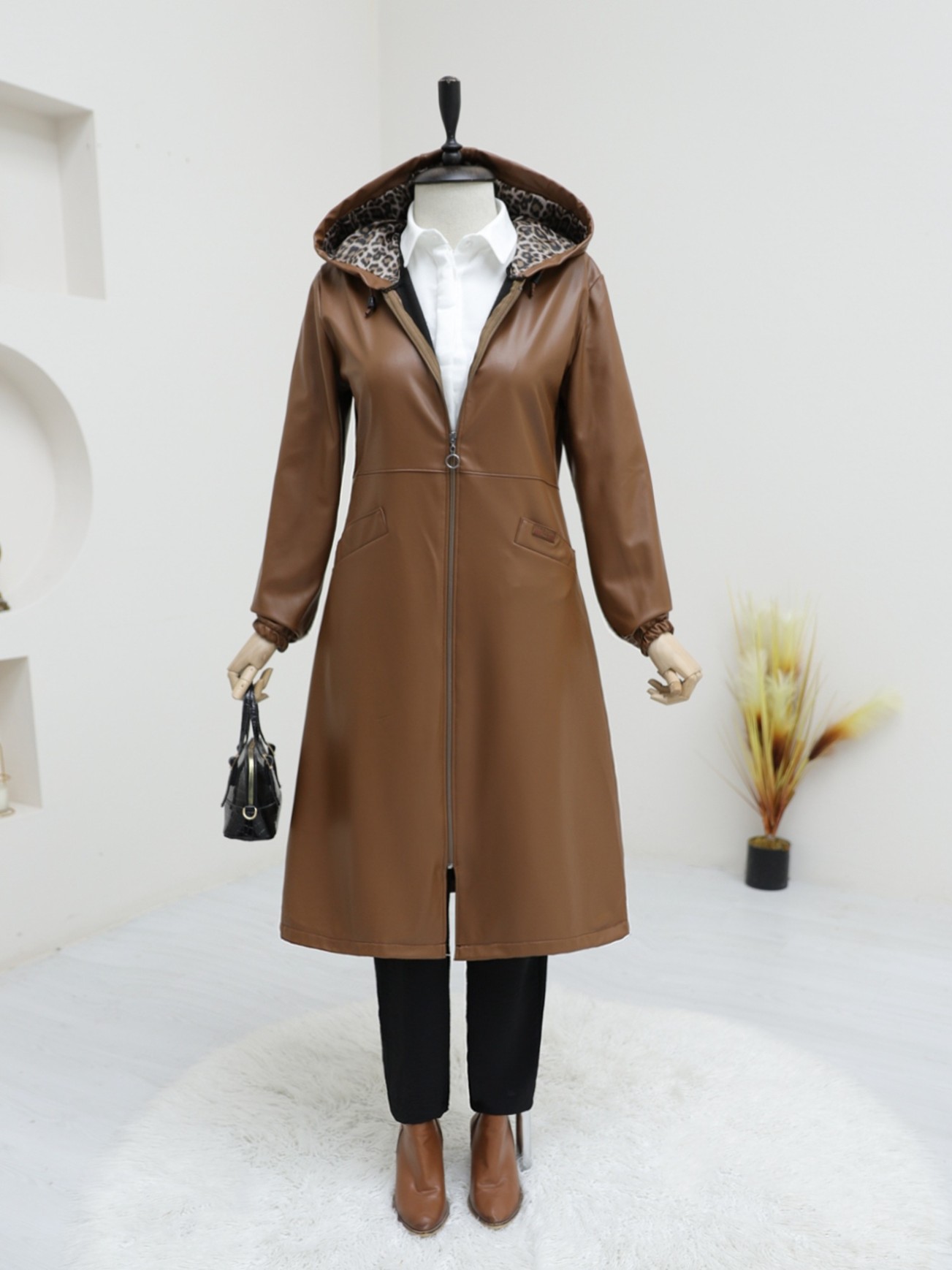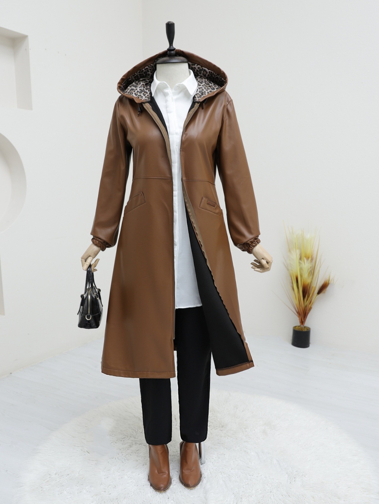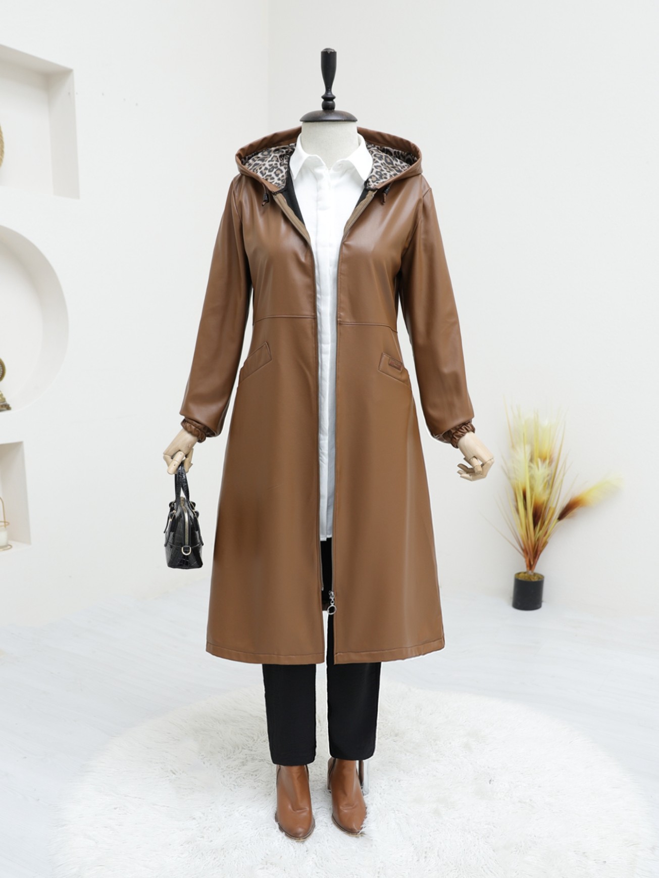 Our front zippered, hooded, 2-pocket, leather trench coat model with raised inside is among the most popular models of the new season.