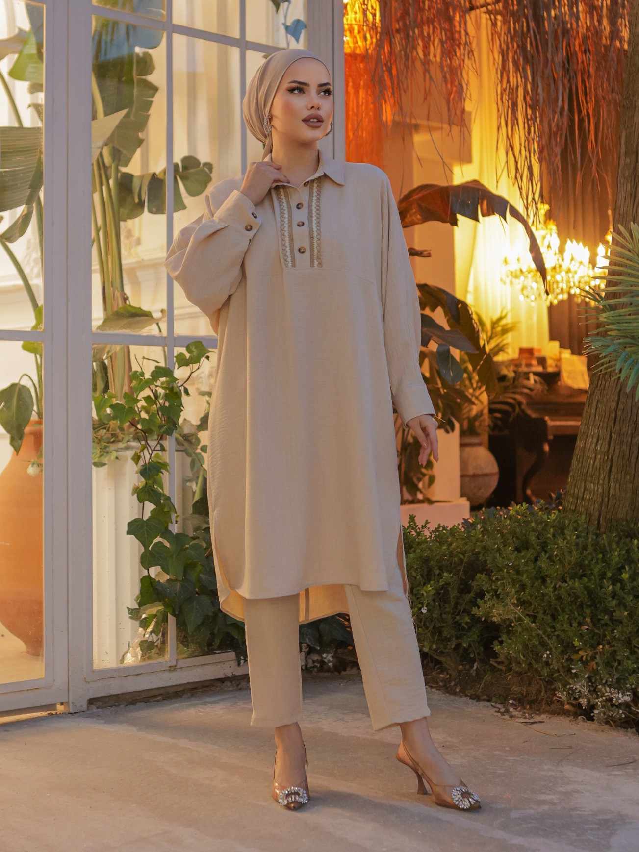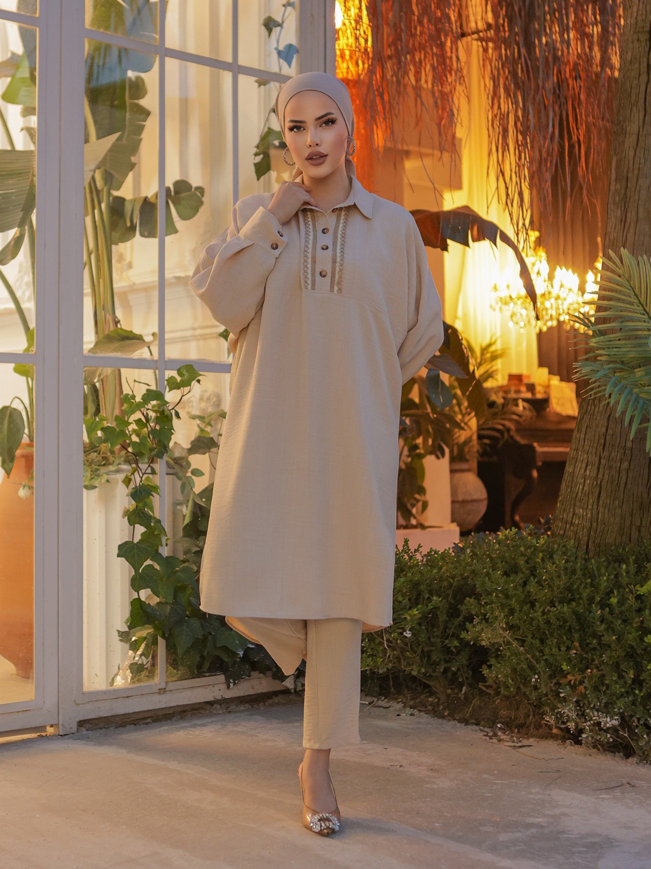 Depending on the user and region, this product can also be called comfortable tunic, hijab tunic, daily tunic, seasonal tunic, summer tunic, linen tunic, buttoned tunic.