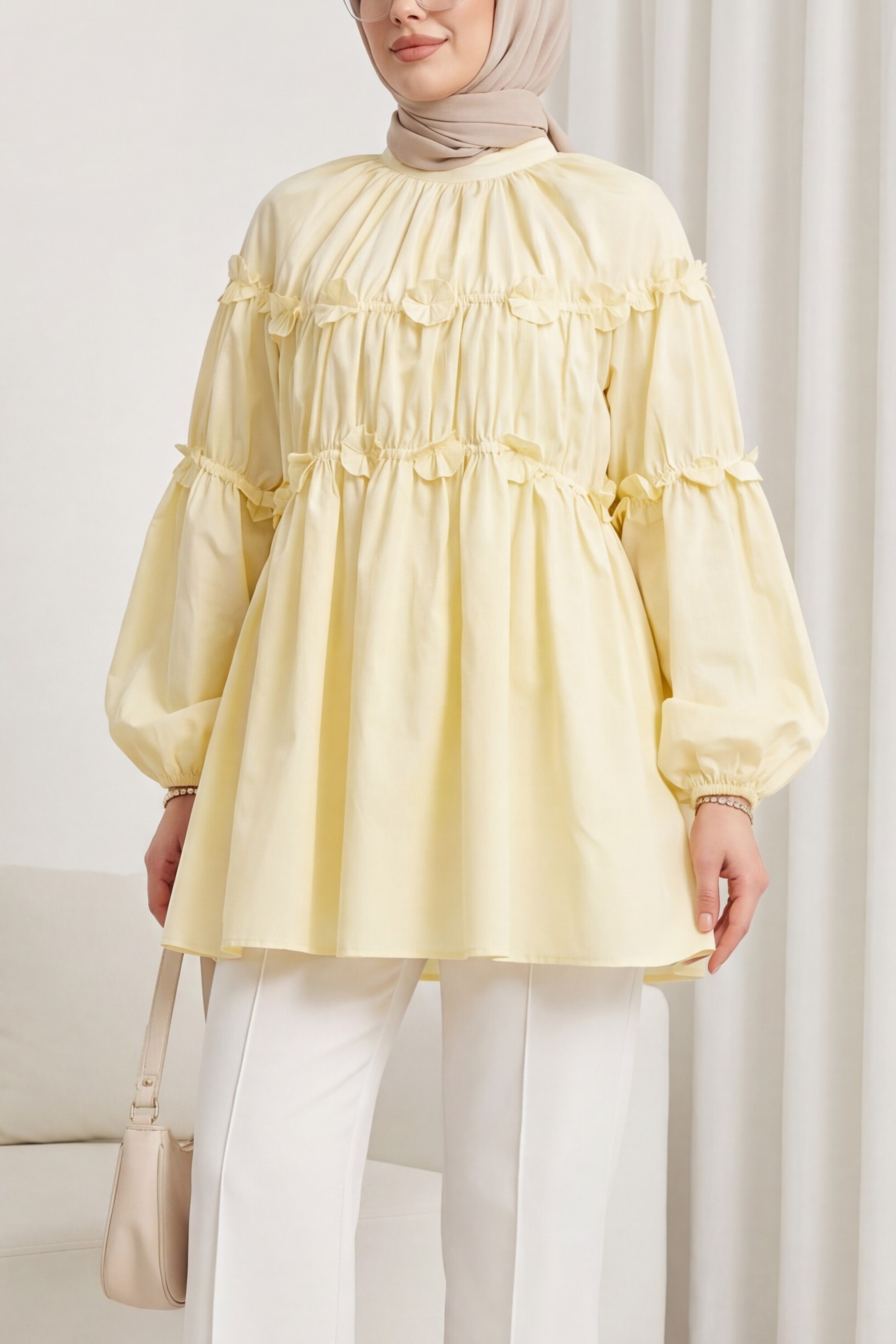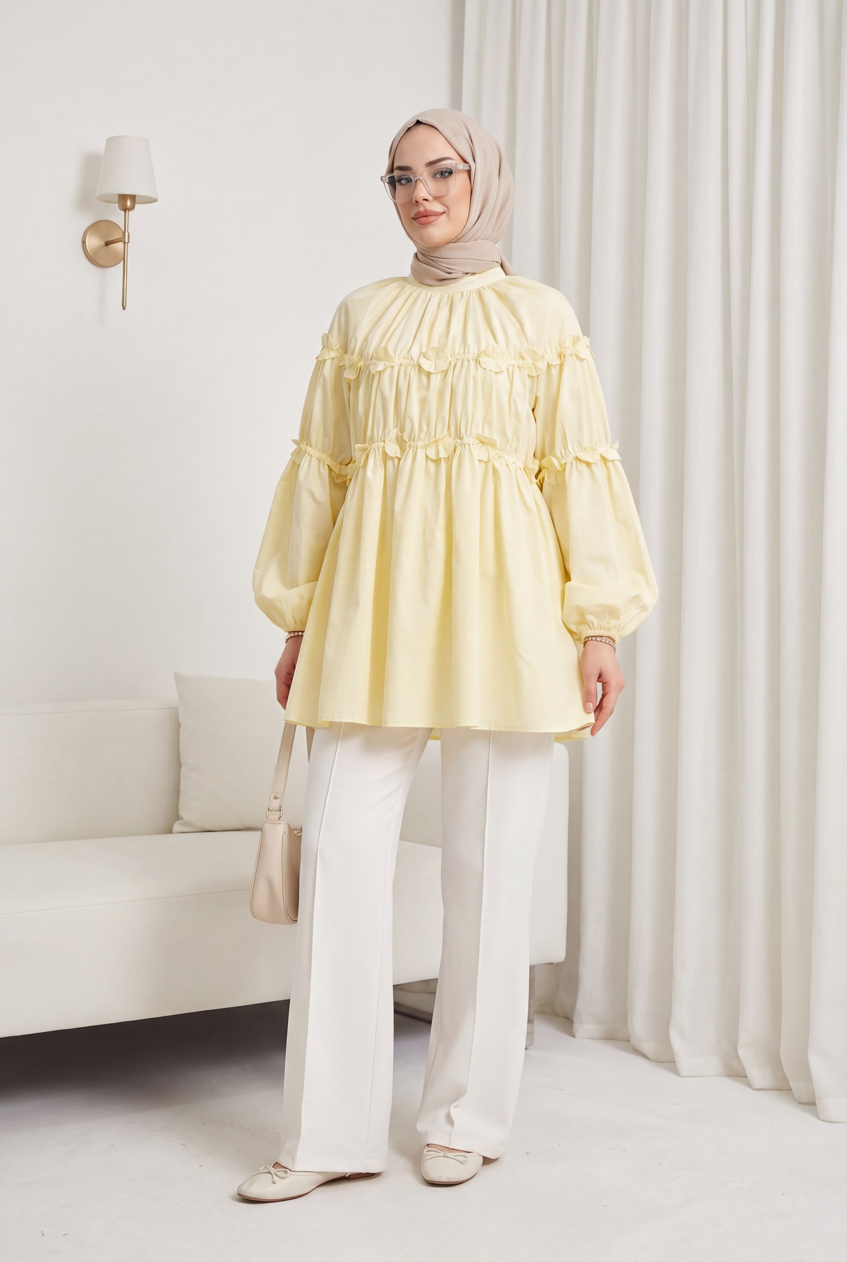 Poplin Tunic with Elastic Sleeves and Daisy Detail -Yellow