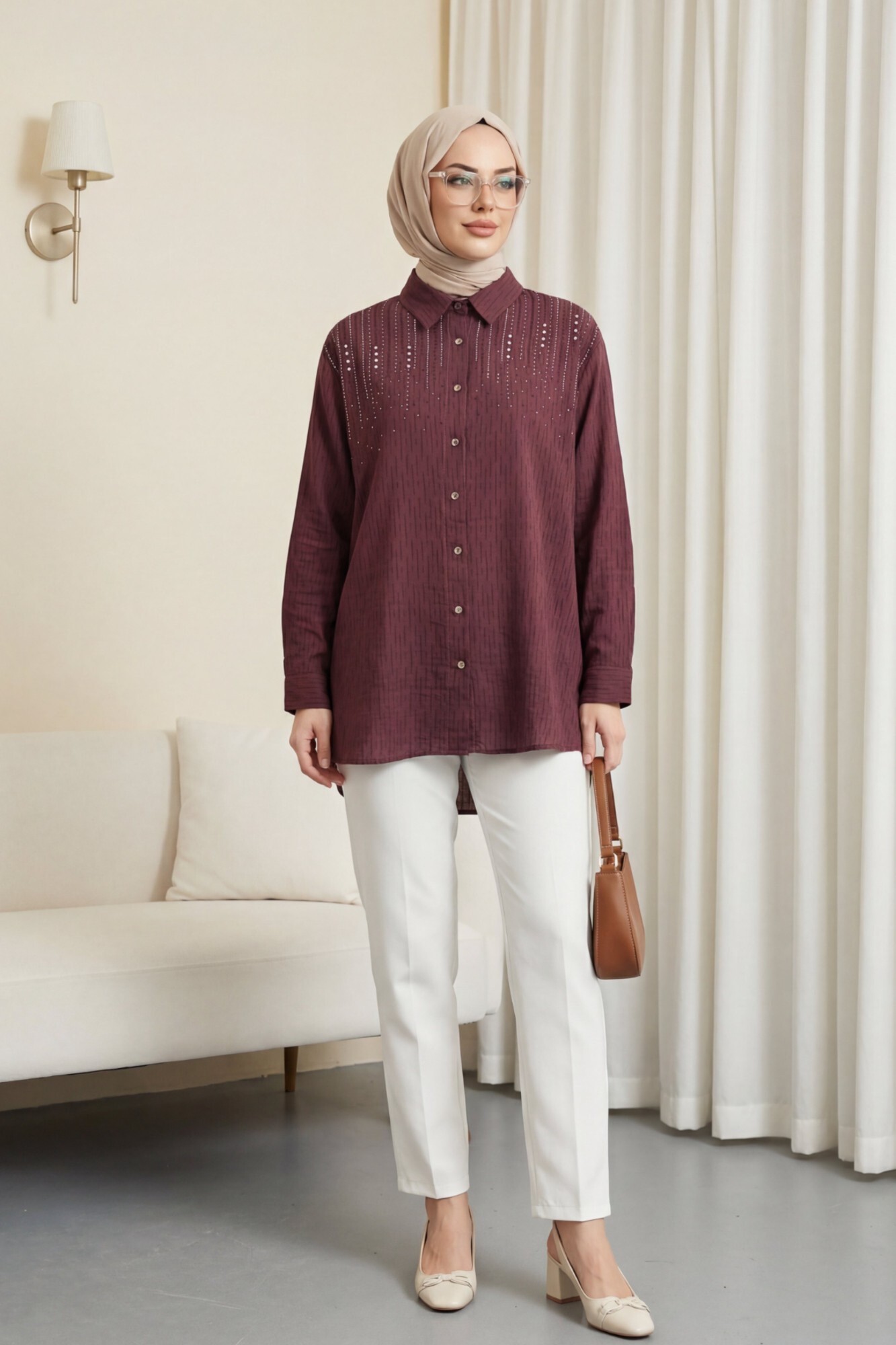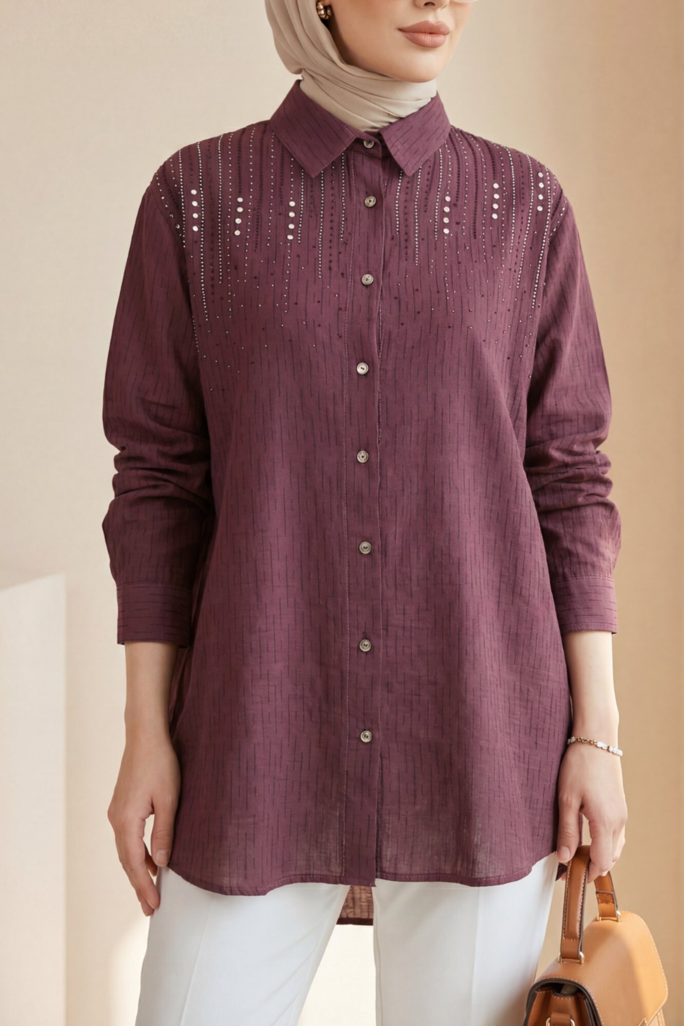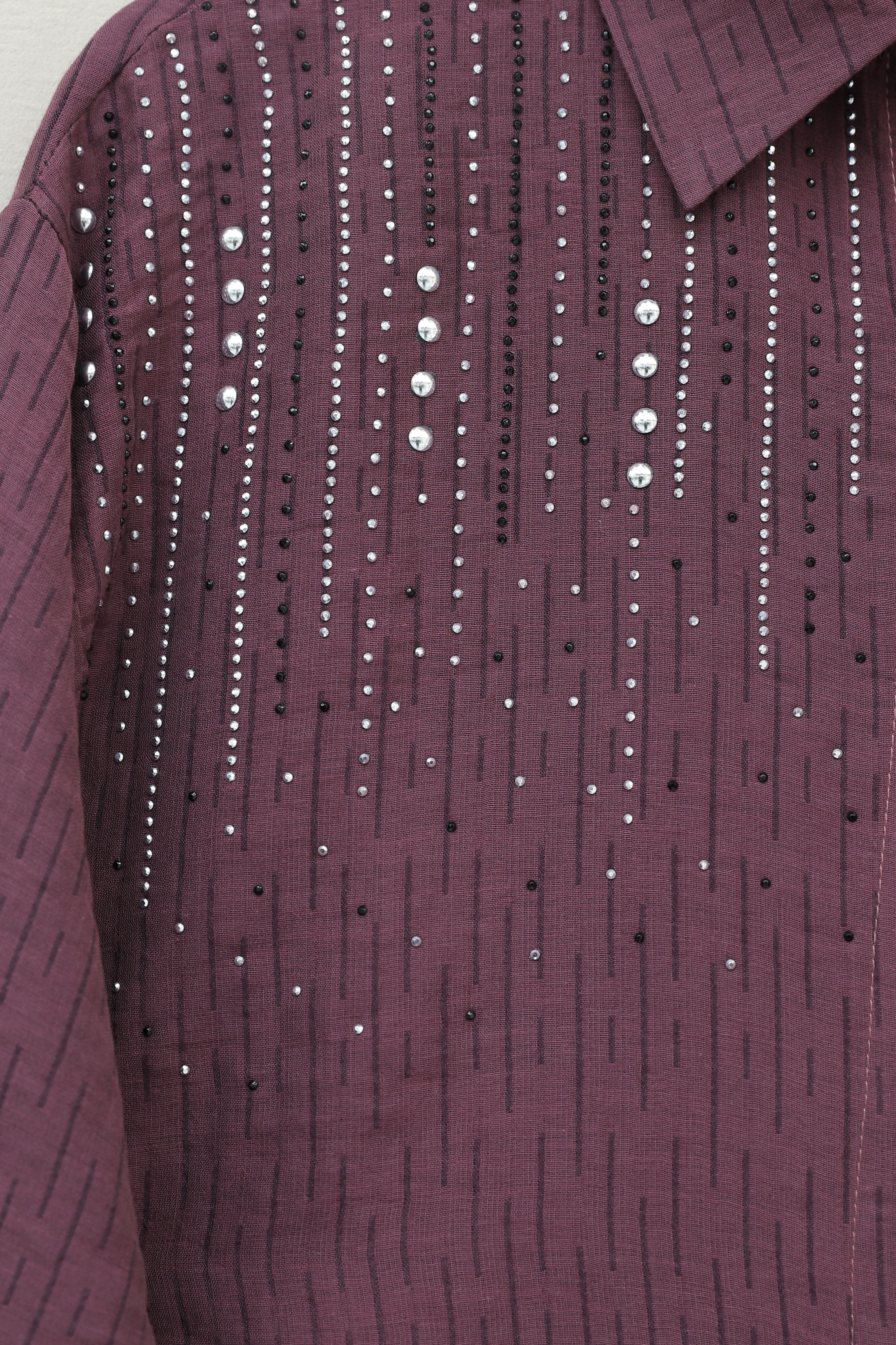 Deep Voile Shoulder Buttoned Shirt with Stone Detail -Damson
