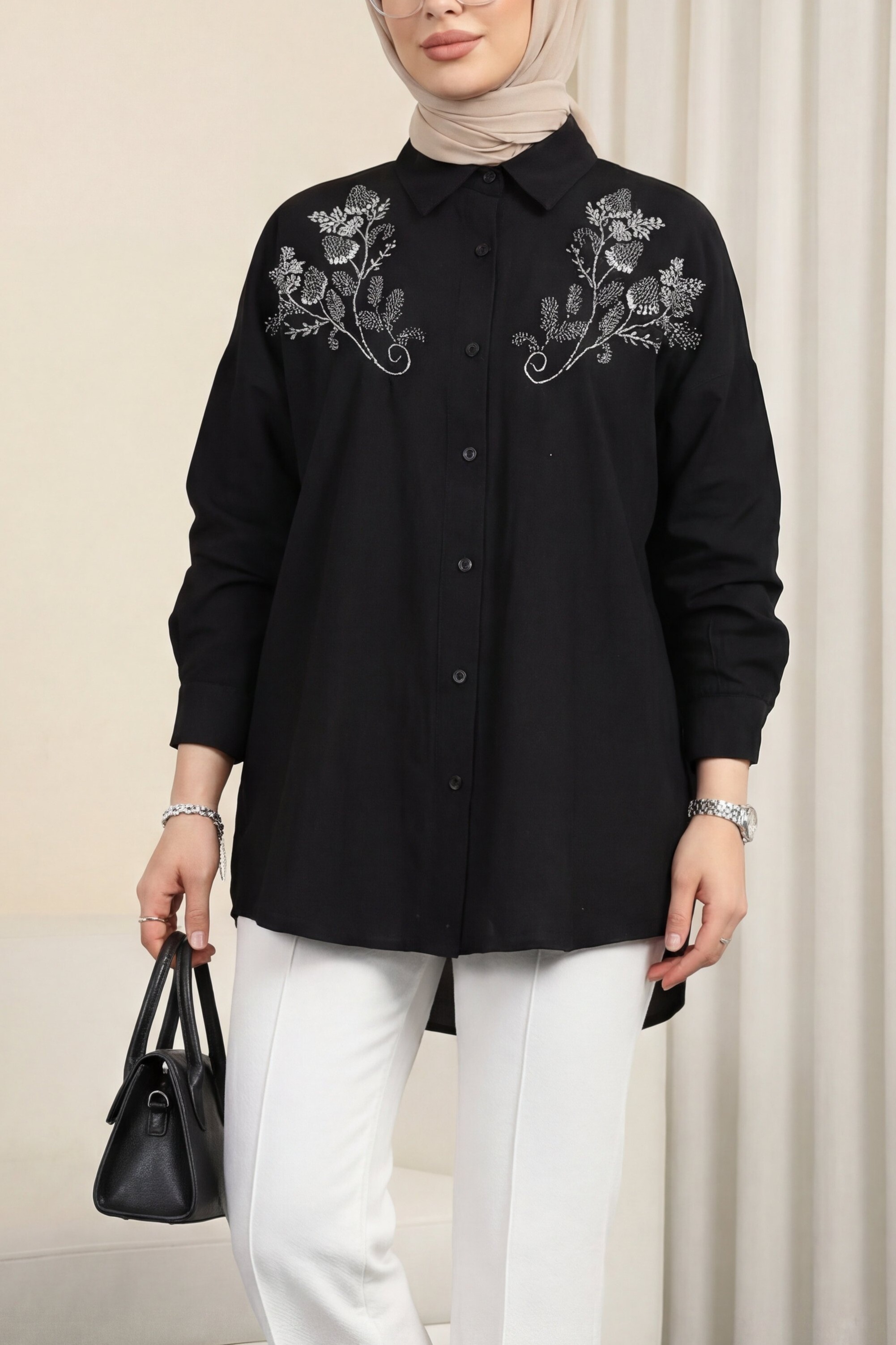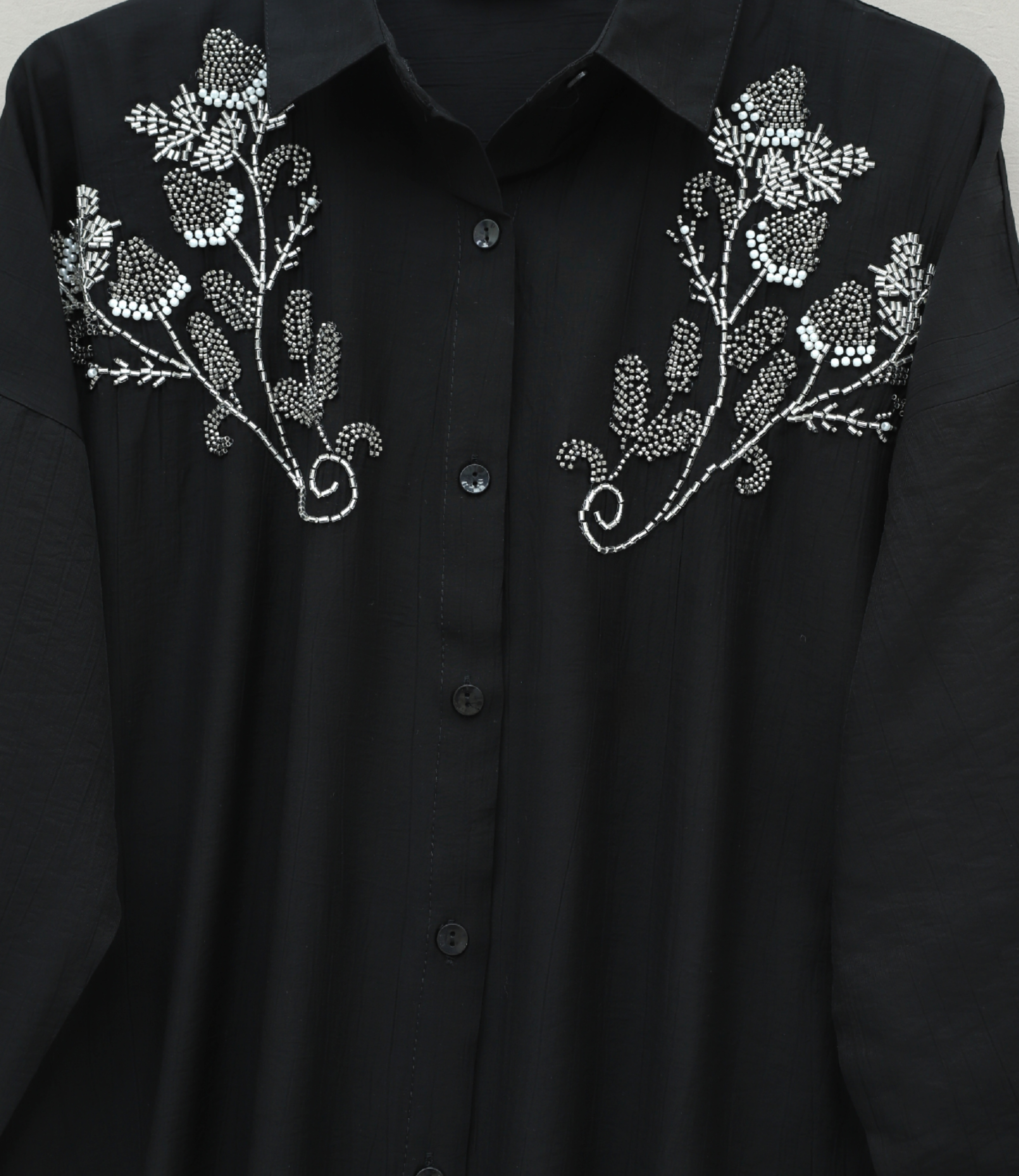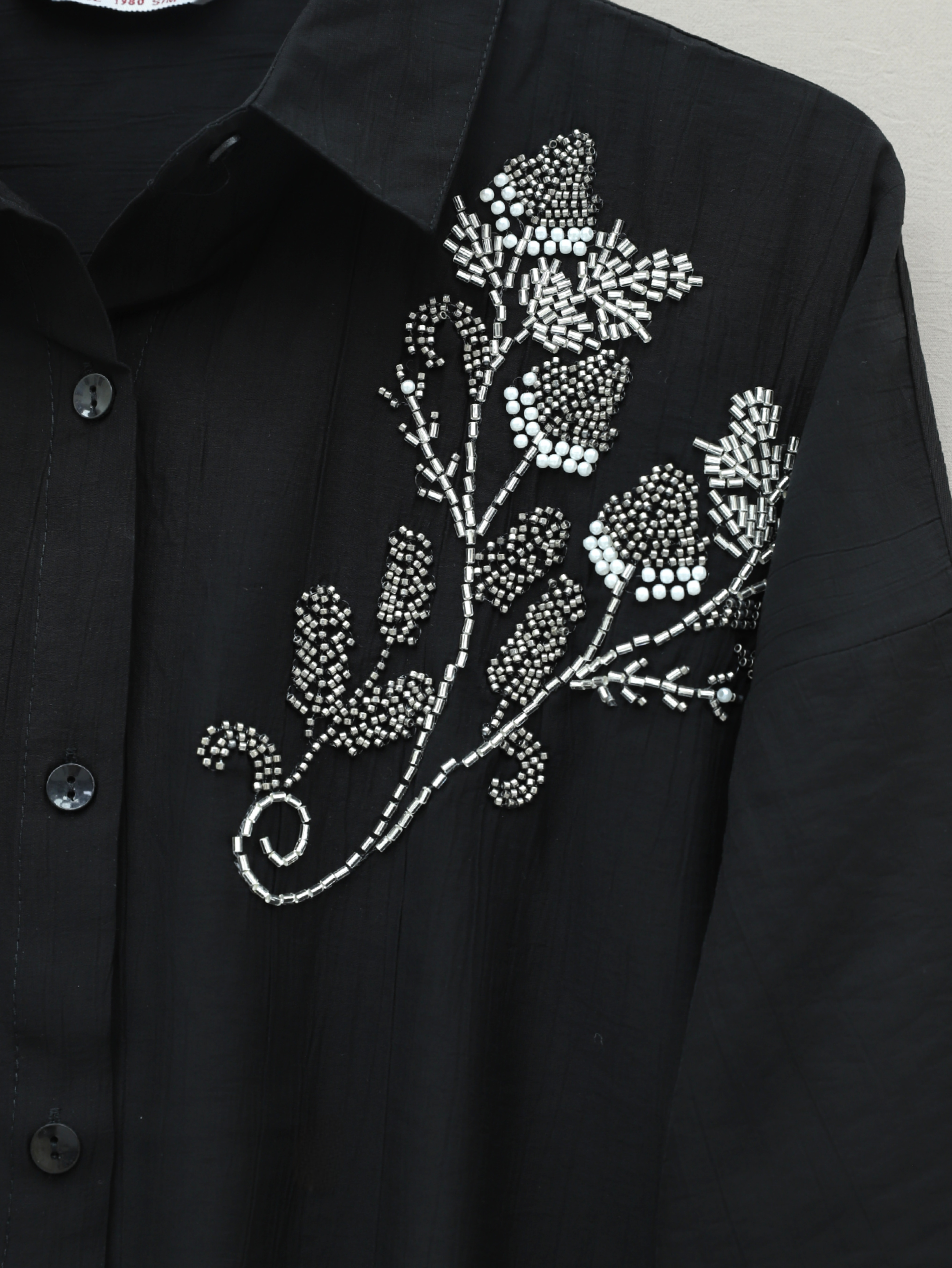Flower Bead Patterned Buttoned Strawberry Shirt -Black