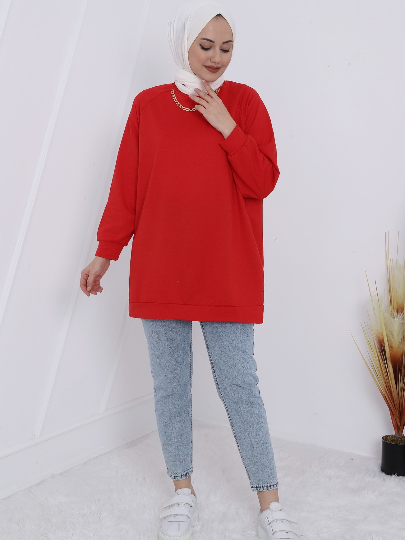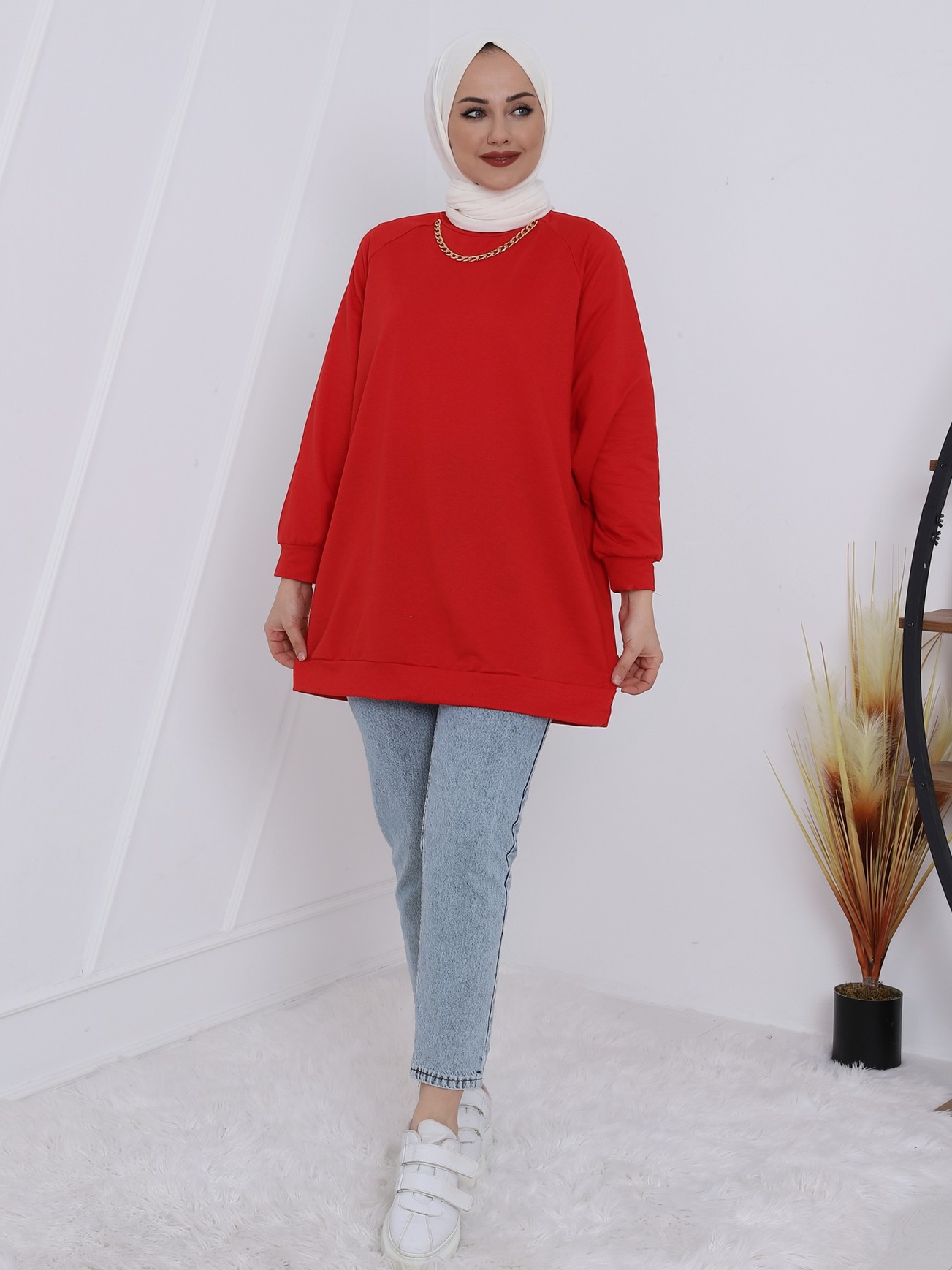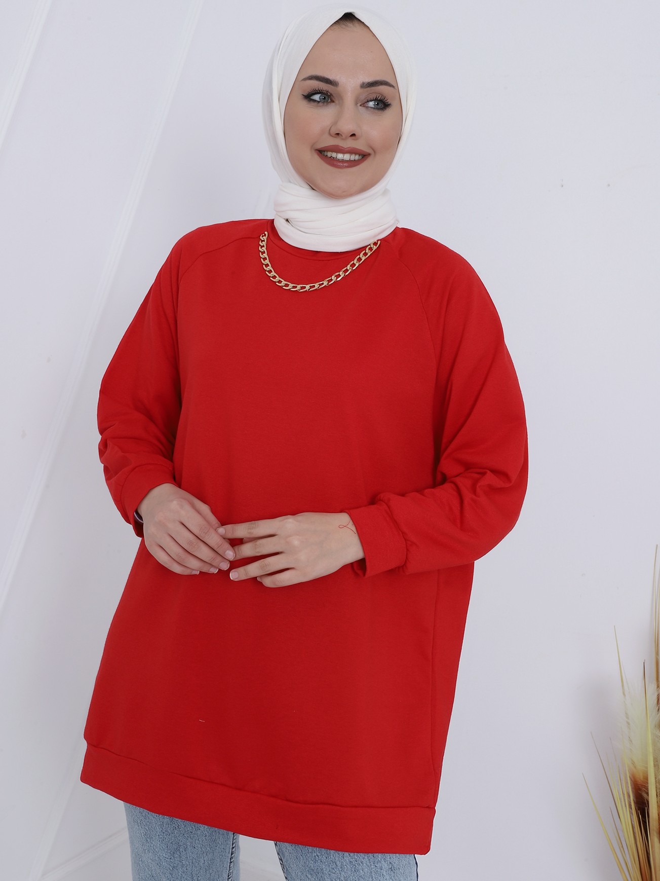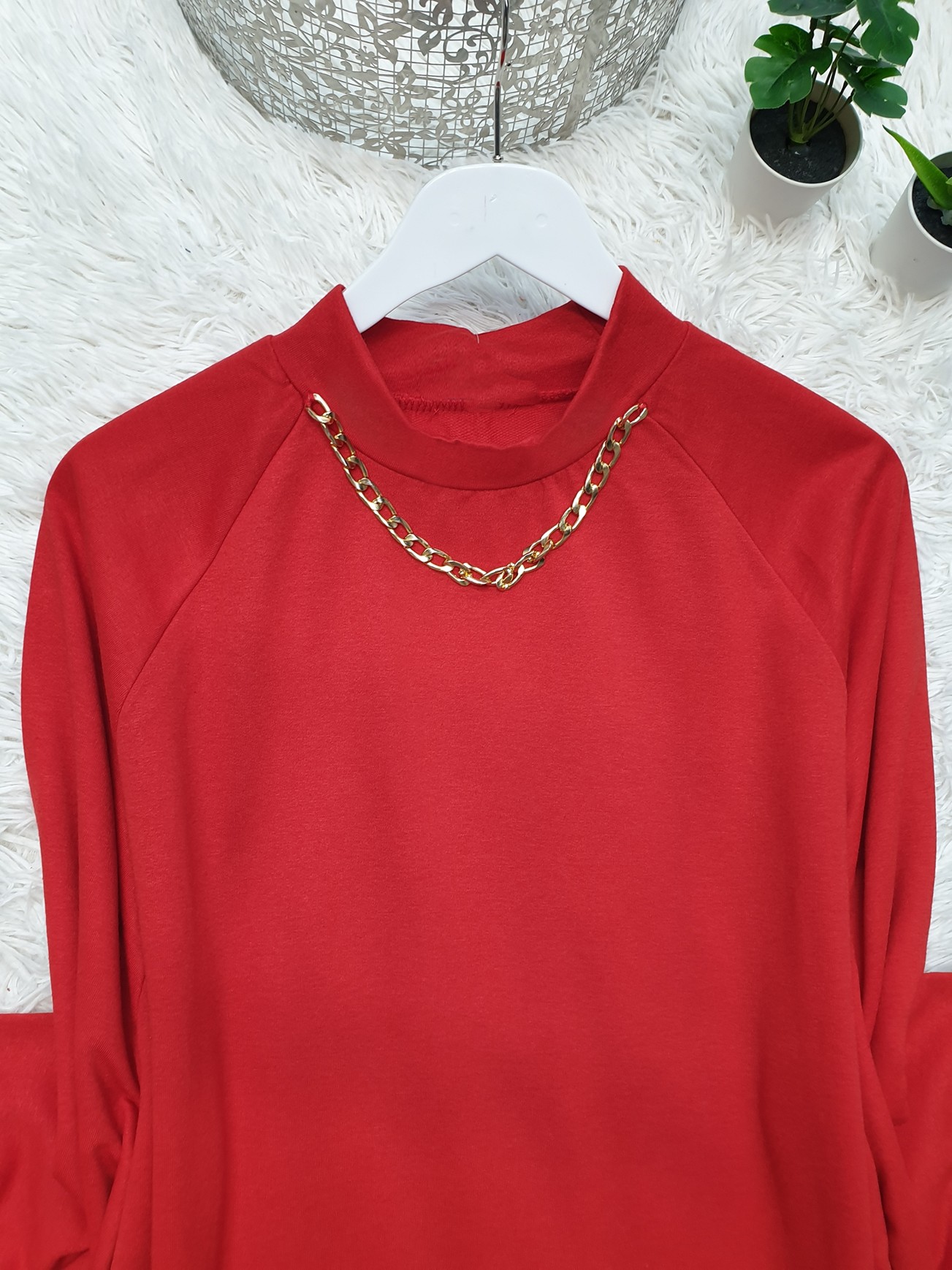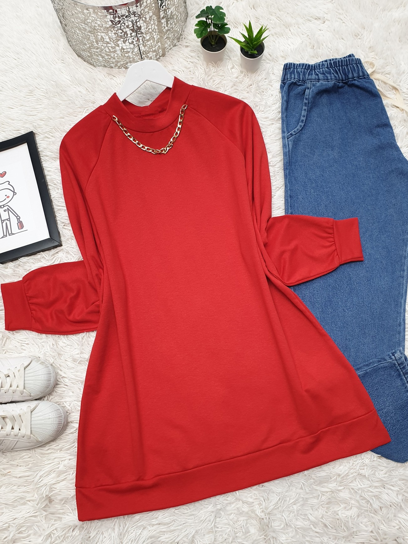 Our half neck, chain detail, bat sleeve tunic model has taken its place among the most trendy models of the new season.