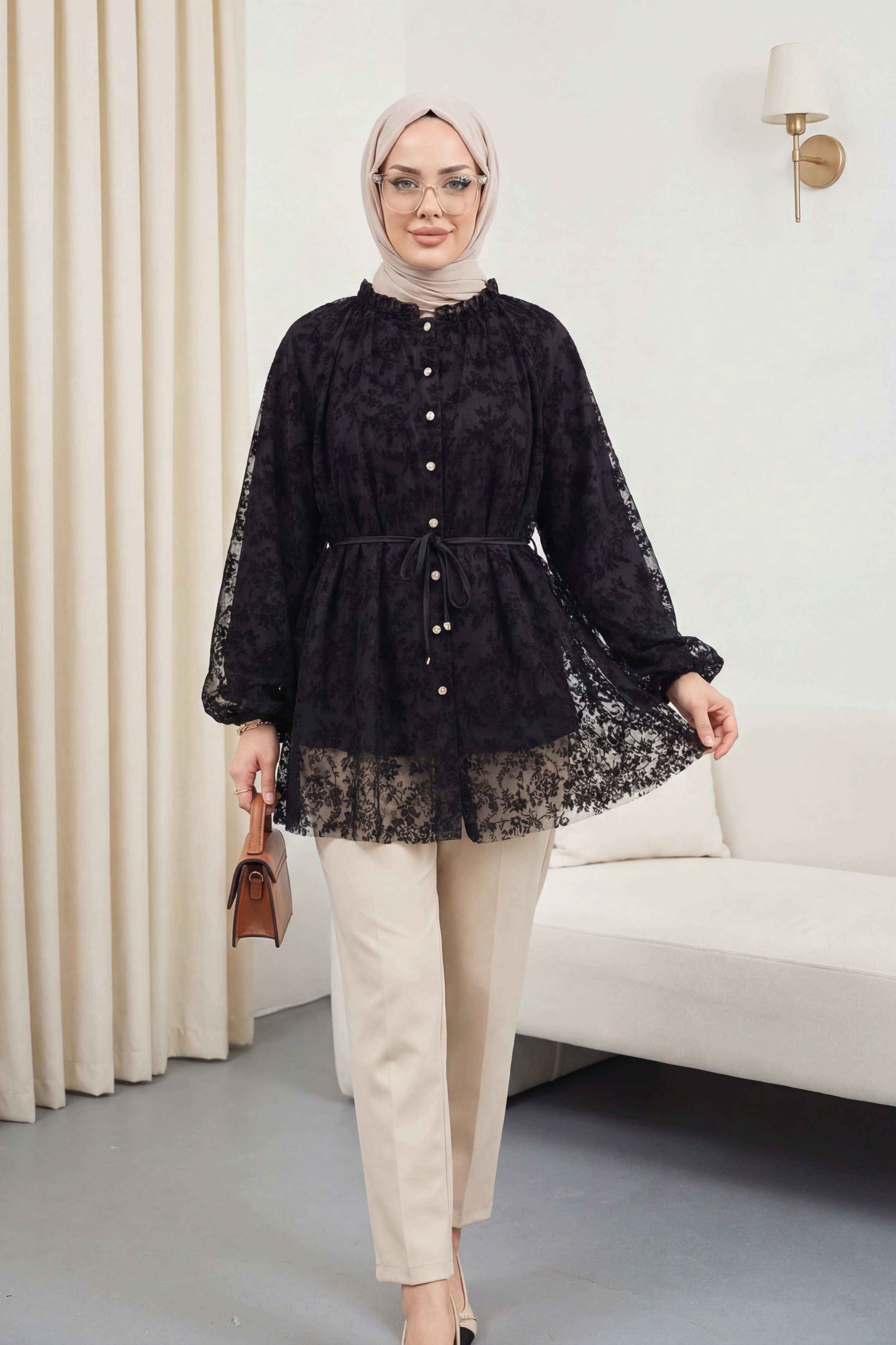 Double Pocket Elastic Waist Lace Detail Trousers -White