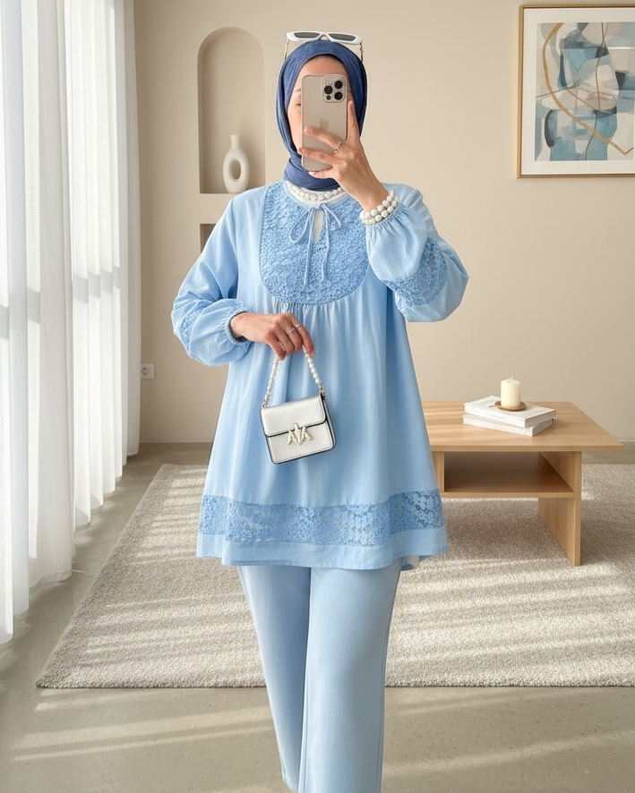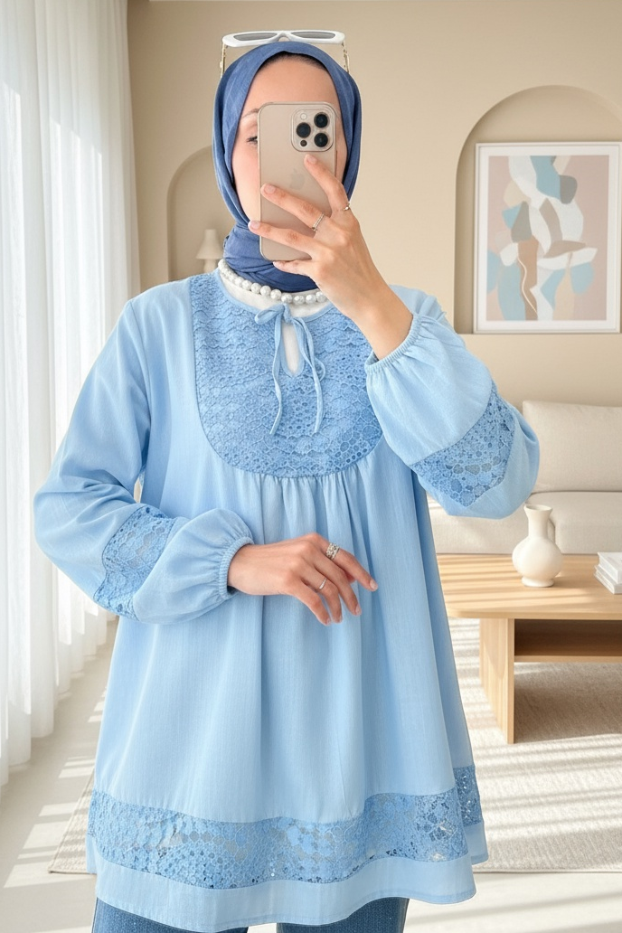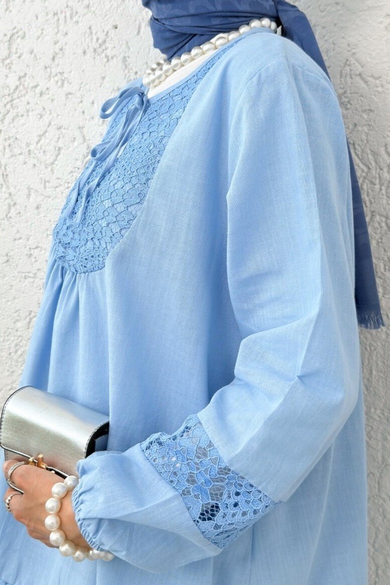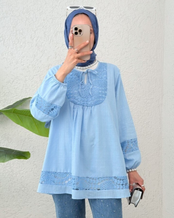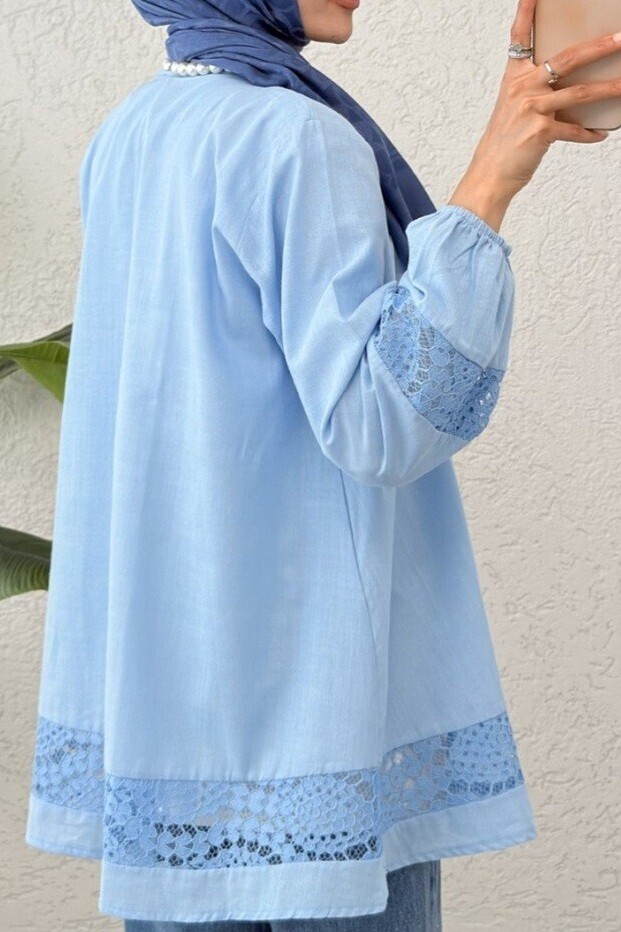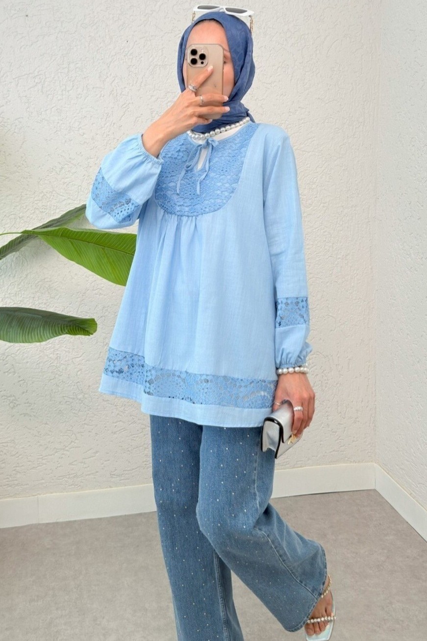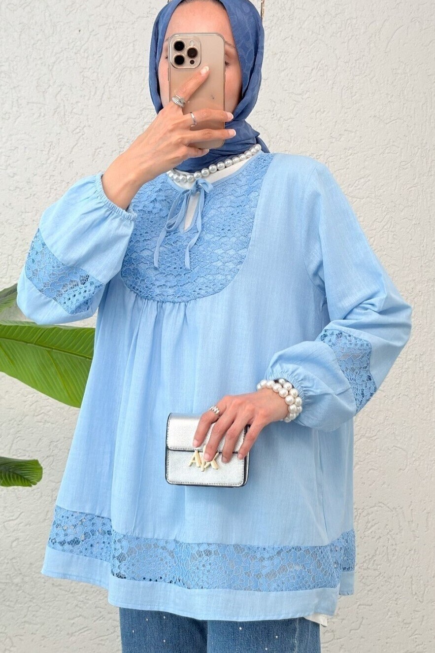 Lace Detailed Tied Collar Elastic Sleeve Shirt -Blue