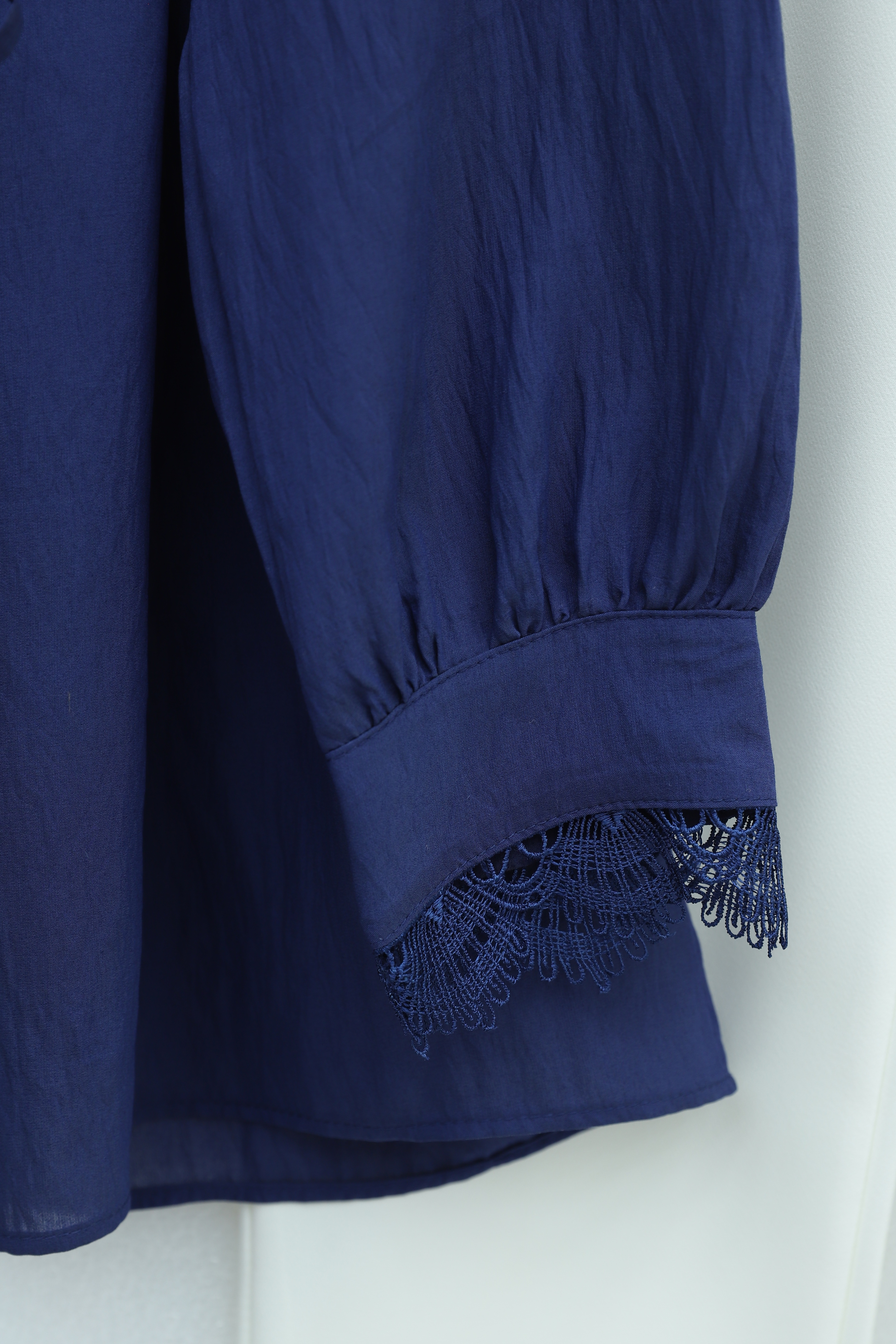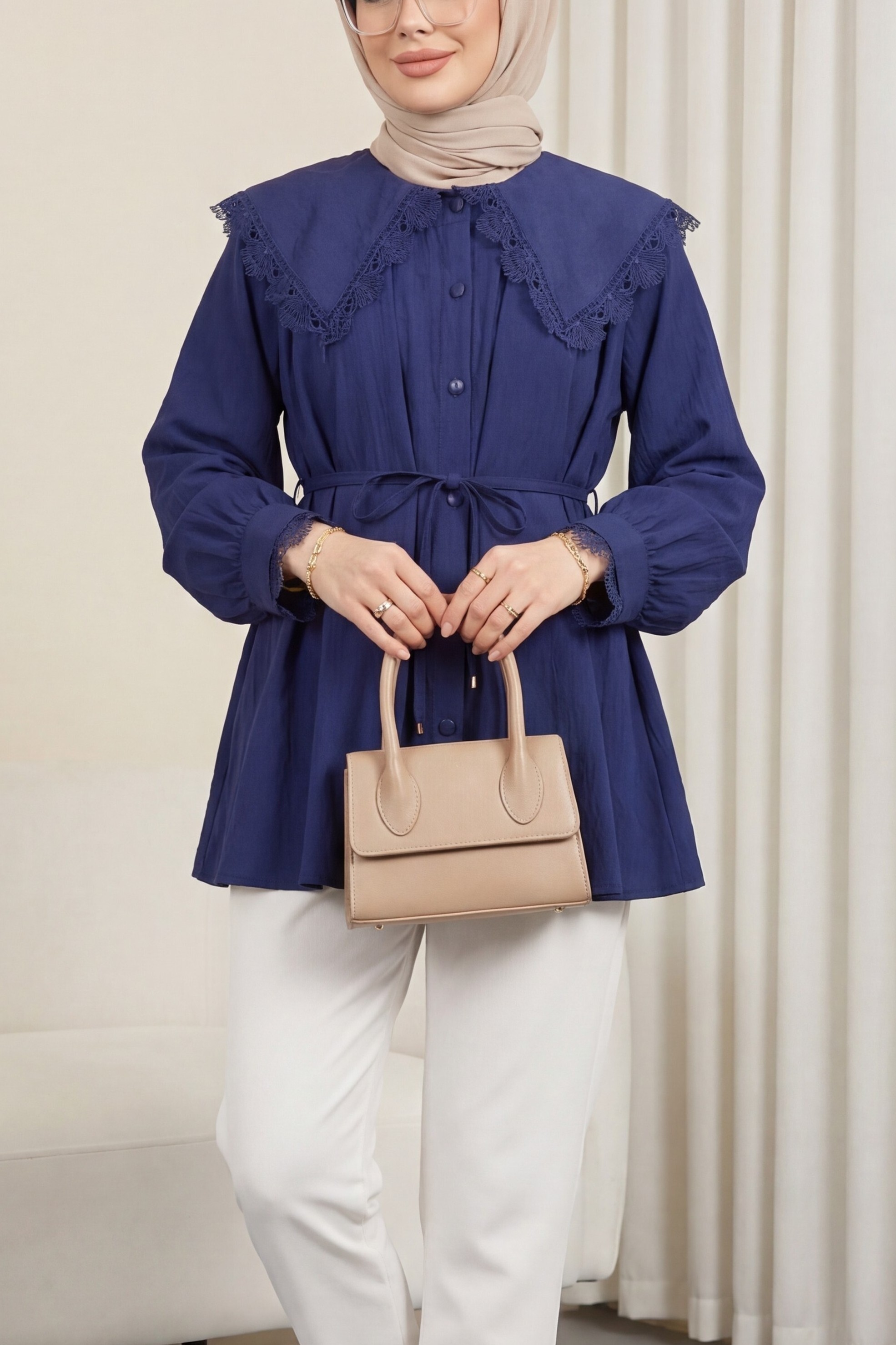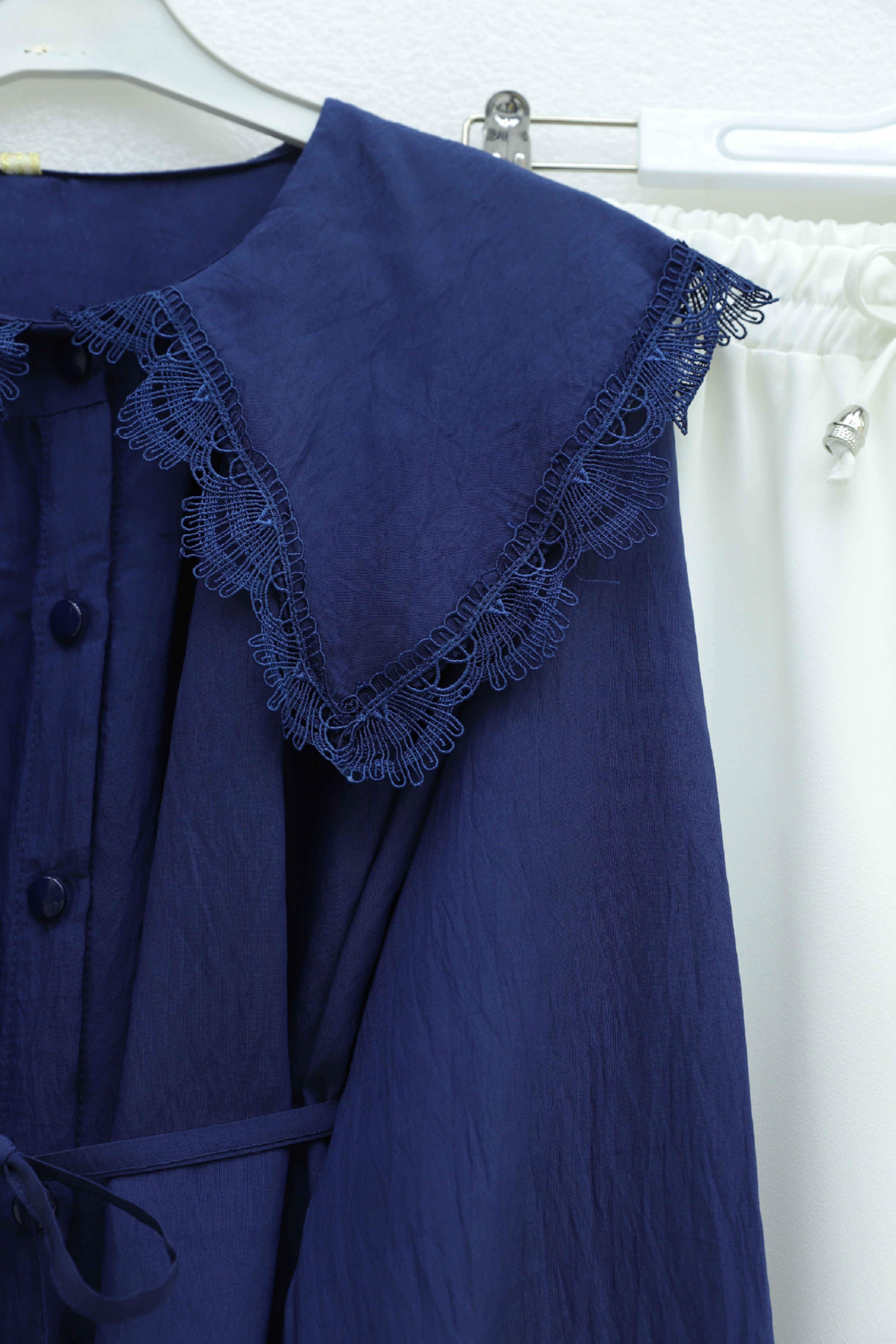 Peter Pan Collar, Ruffled, Drawstring Waist Modal Tunic -Navy blue