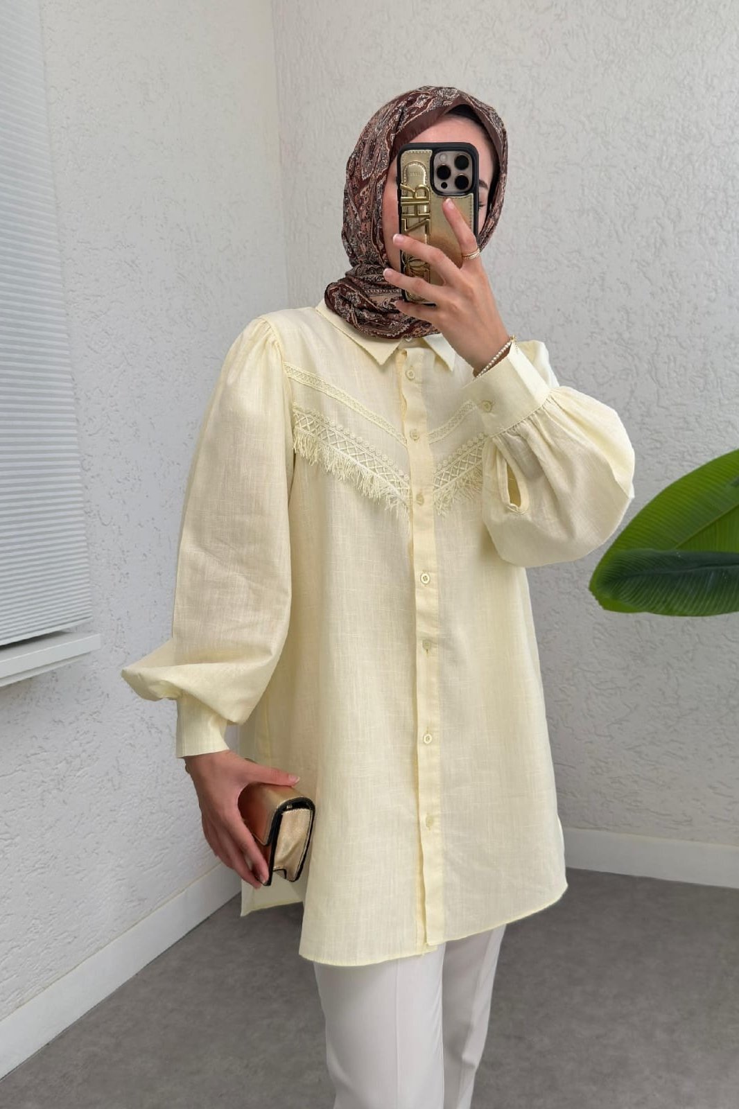"Complete your style with the elegance and comfort of the lace fringed balloon sleeve linen shirt. With its light, breathable fabric, delicate lace details, and chic balloon sleeves, it’s a perfect choice for any season. Available in various colors for a modern, sophisticated look."