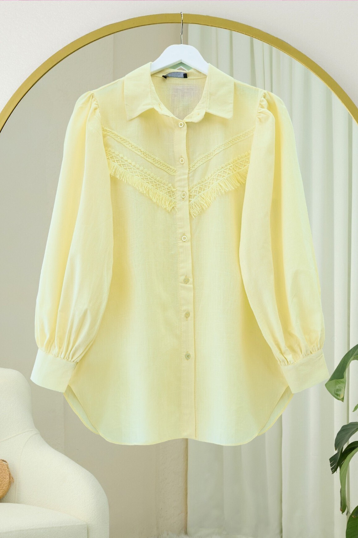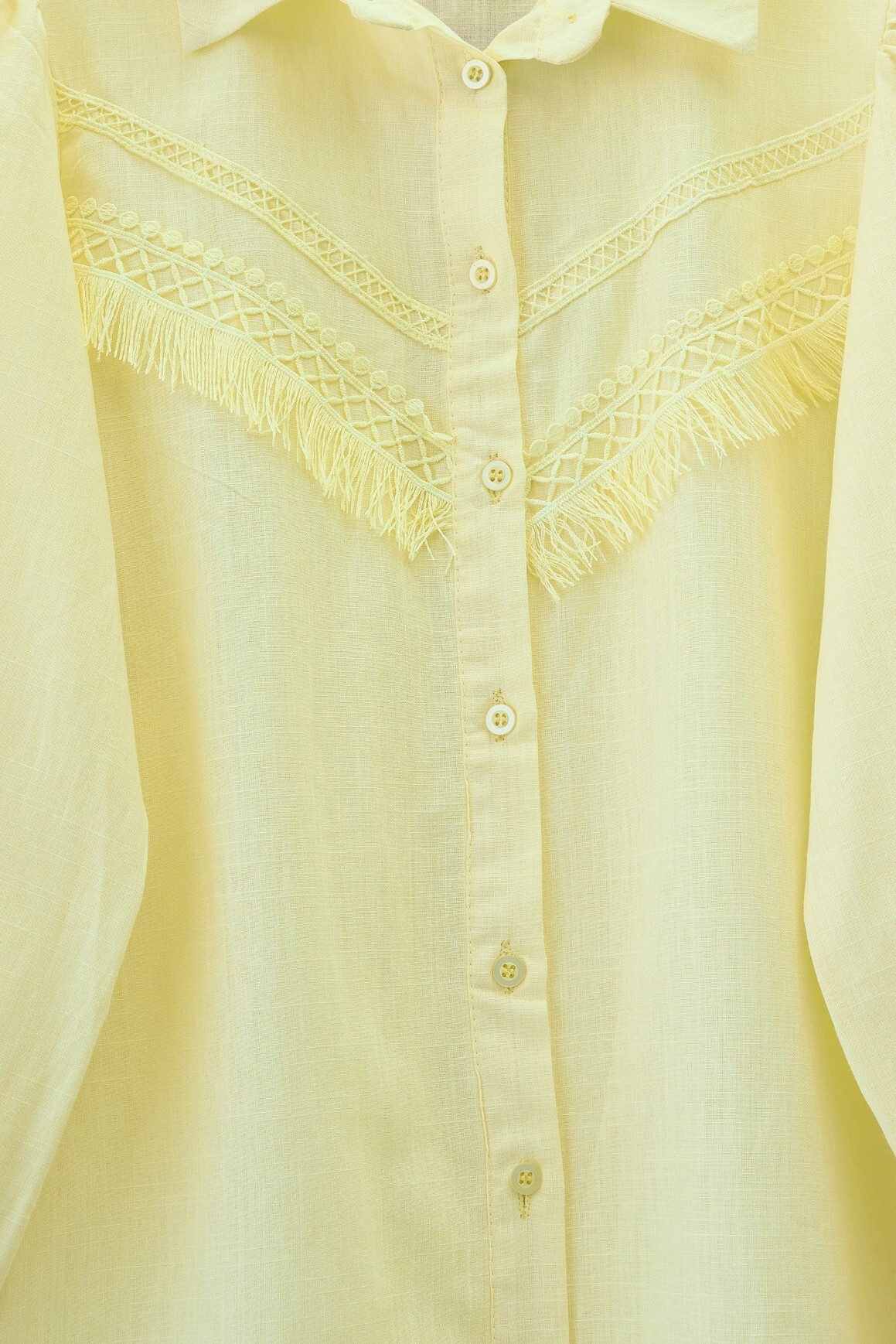 Raw Linen Balloon Sleeve Shirt with Guipure Tassels -Light yellow