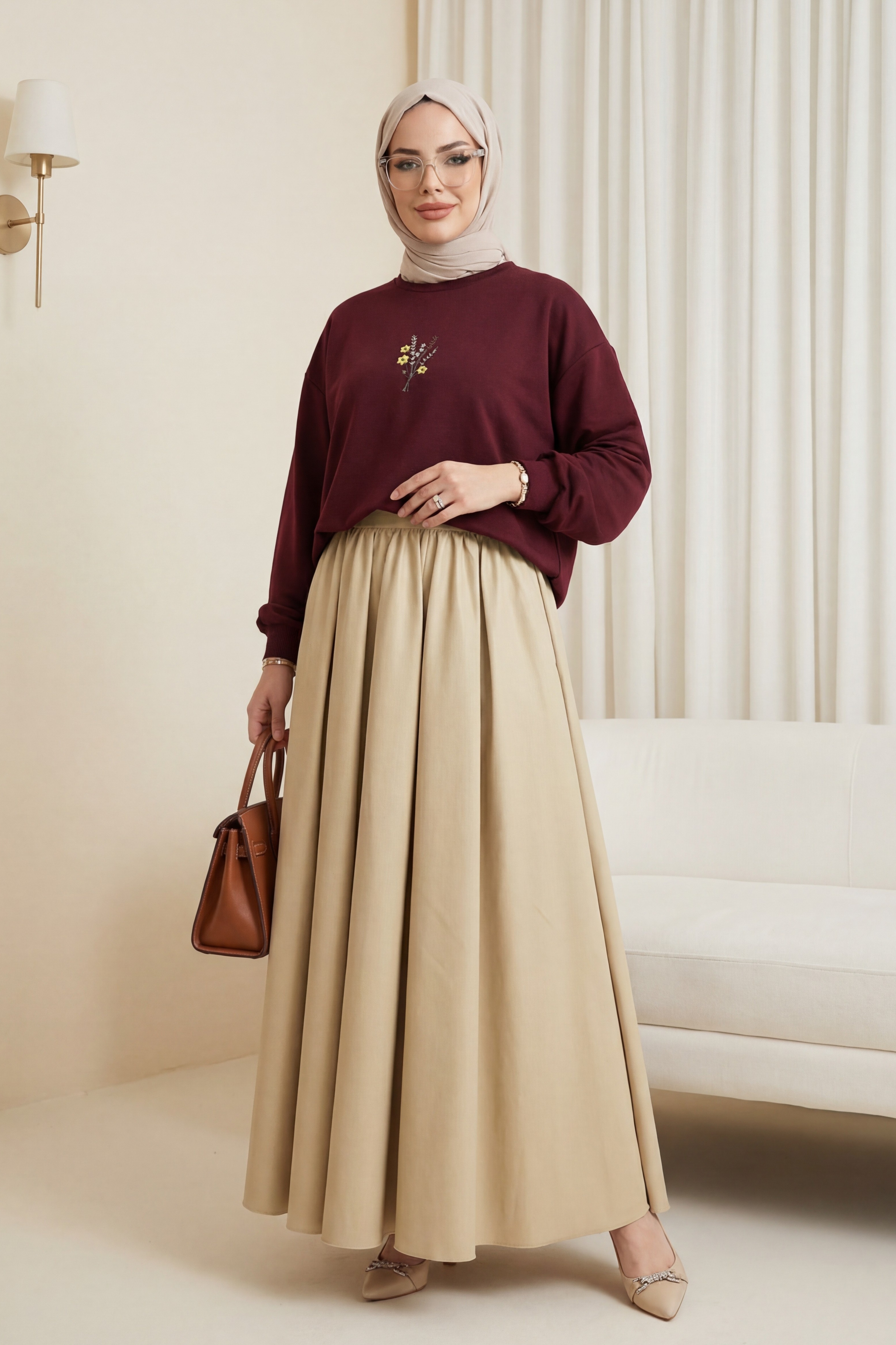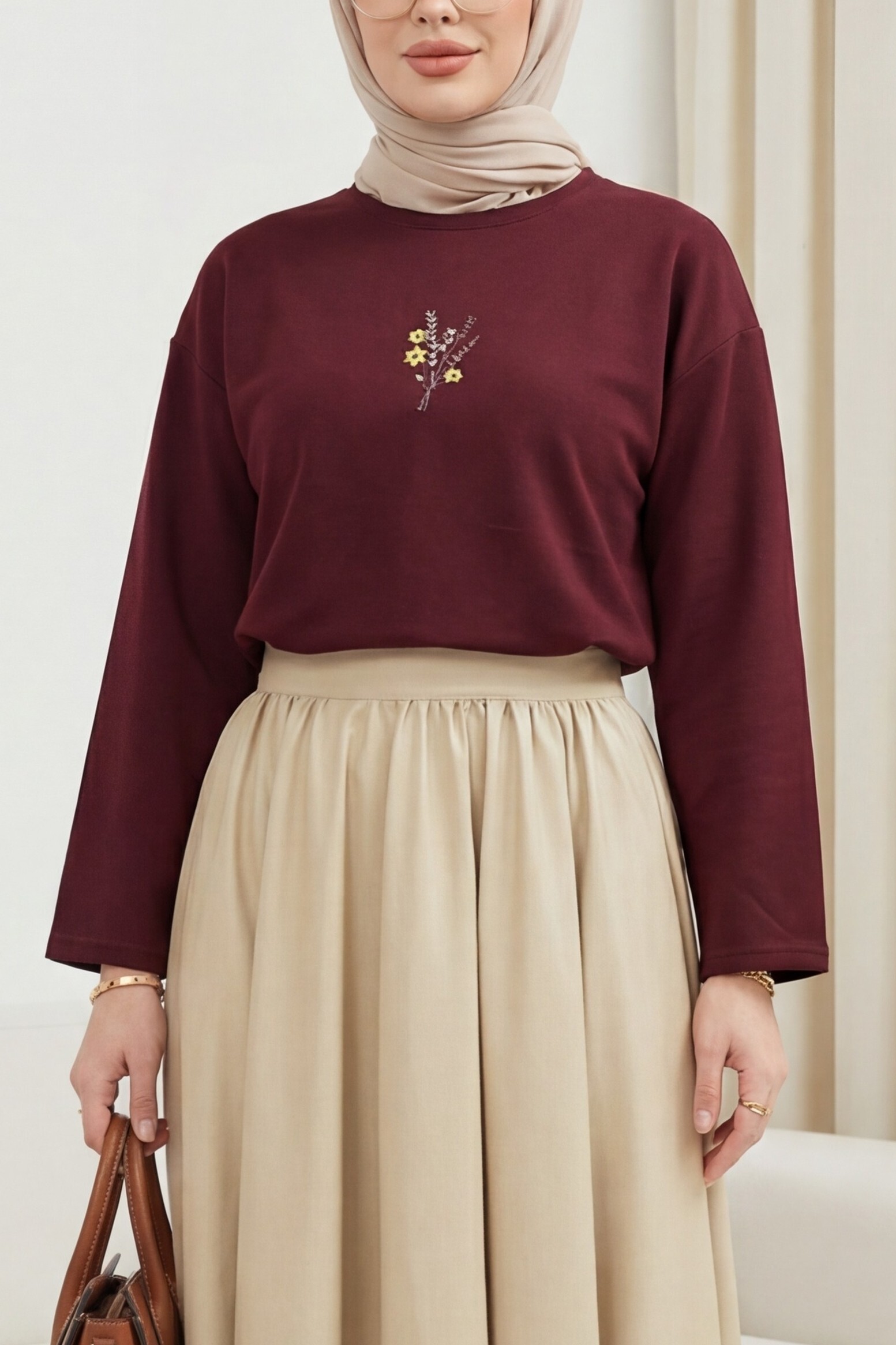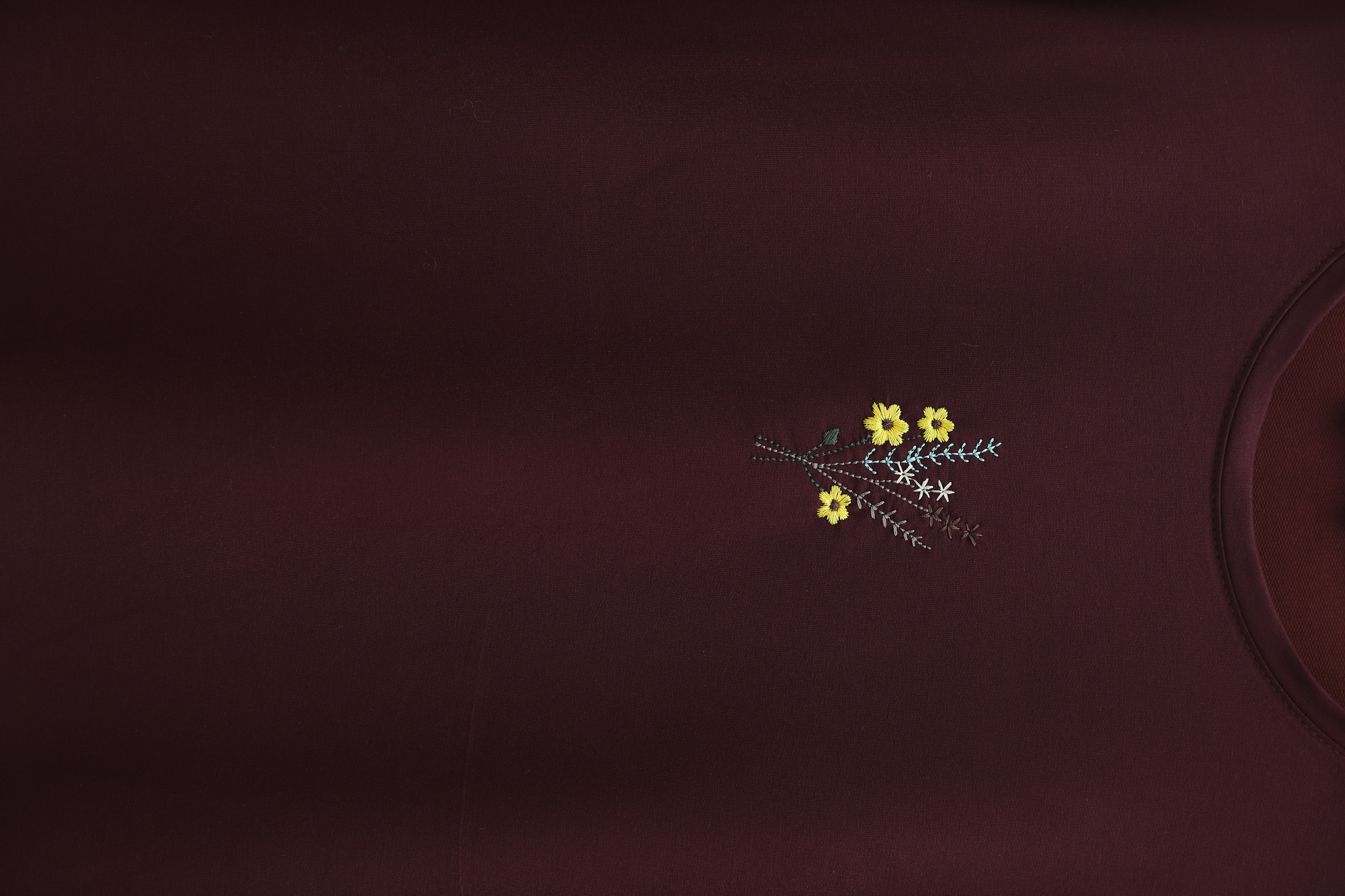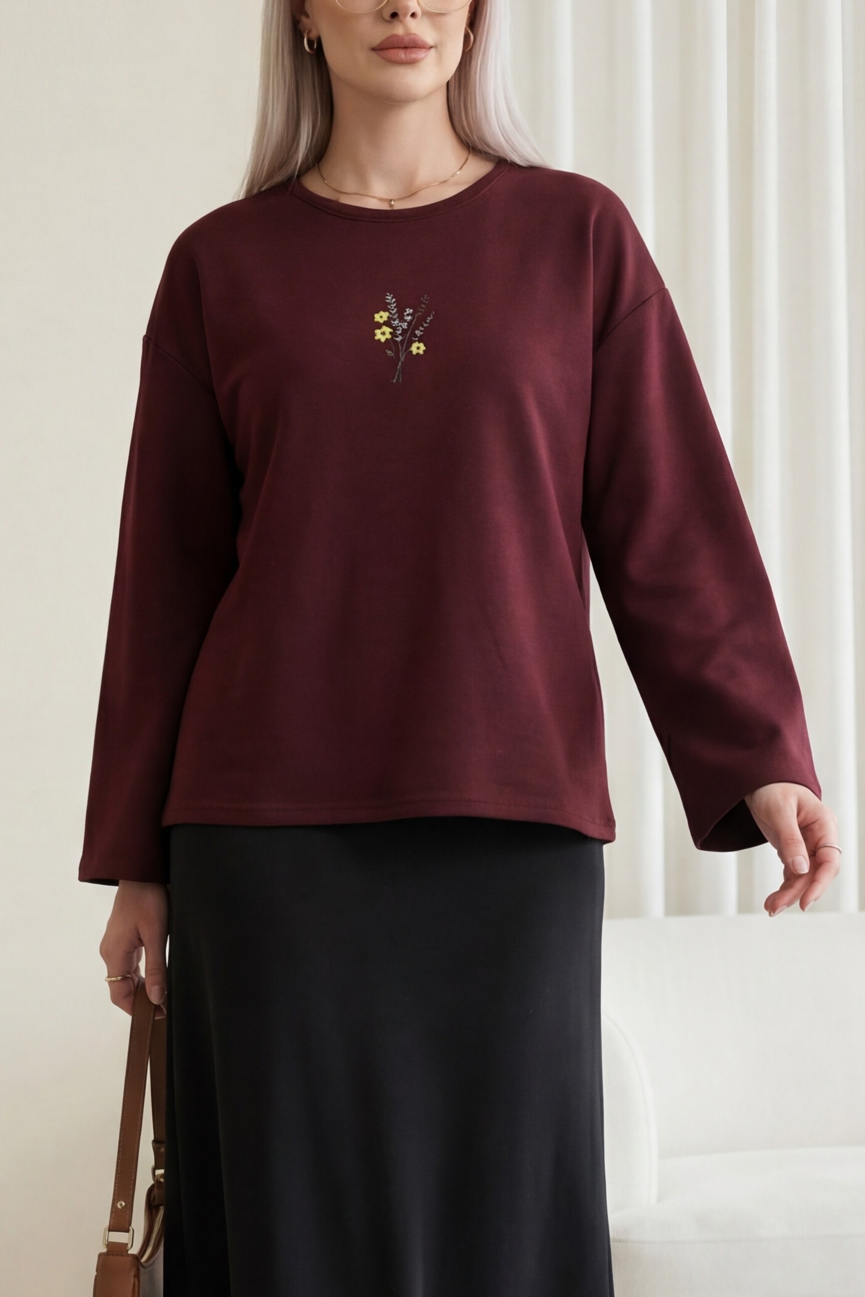 Round Neck Loose Fit Jersey Blouse with Floral Embroidery on the Front -Maroon