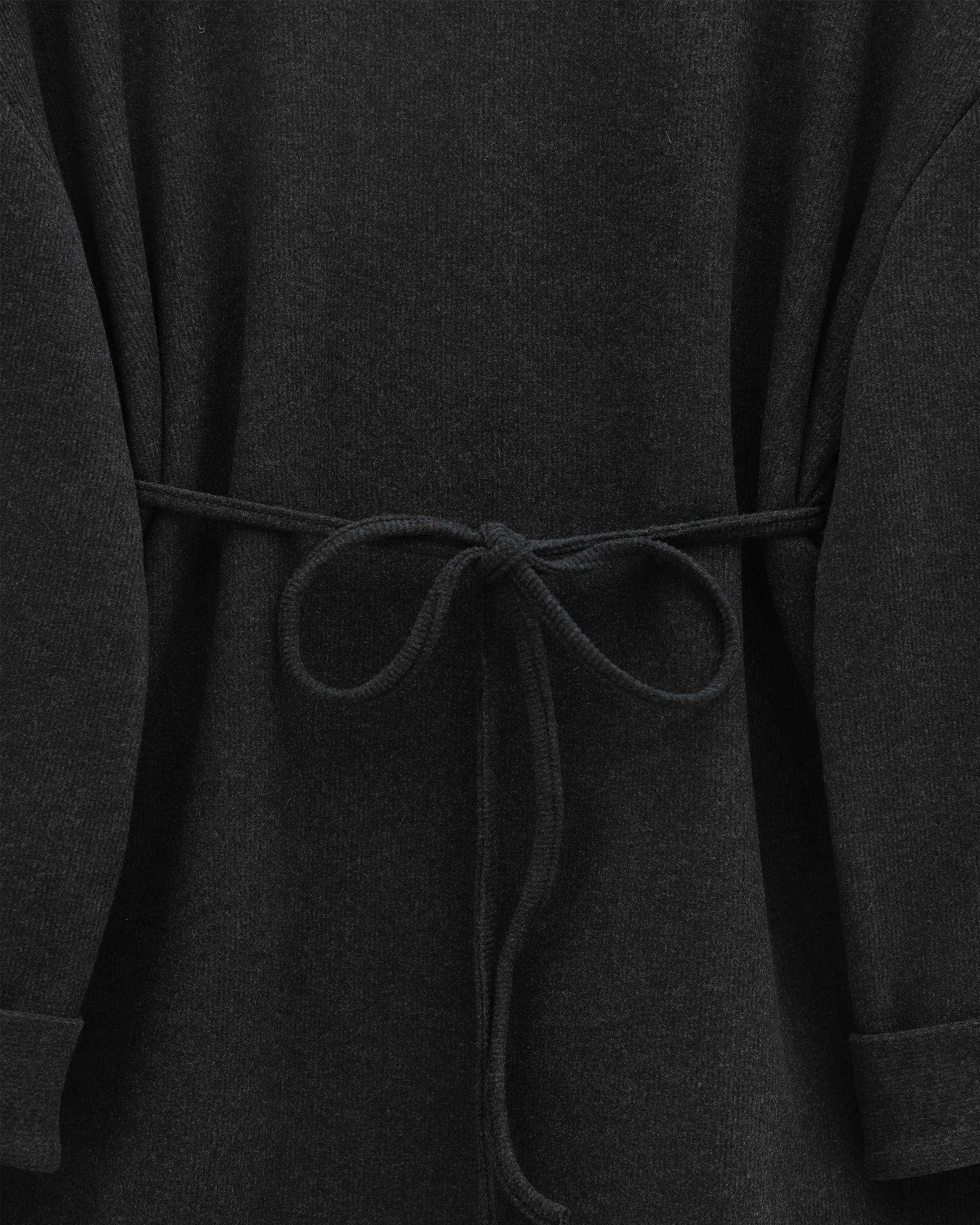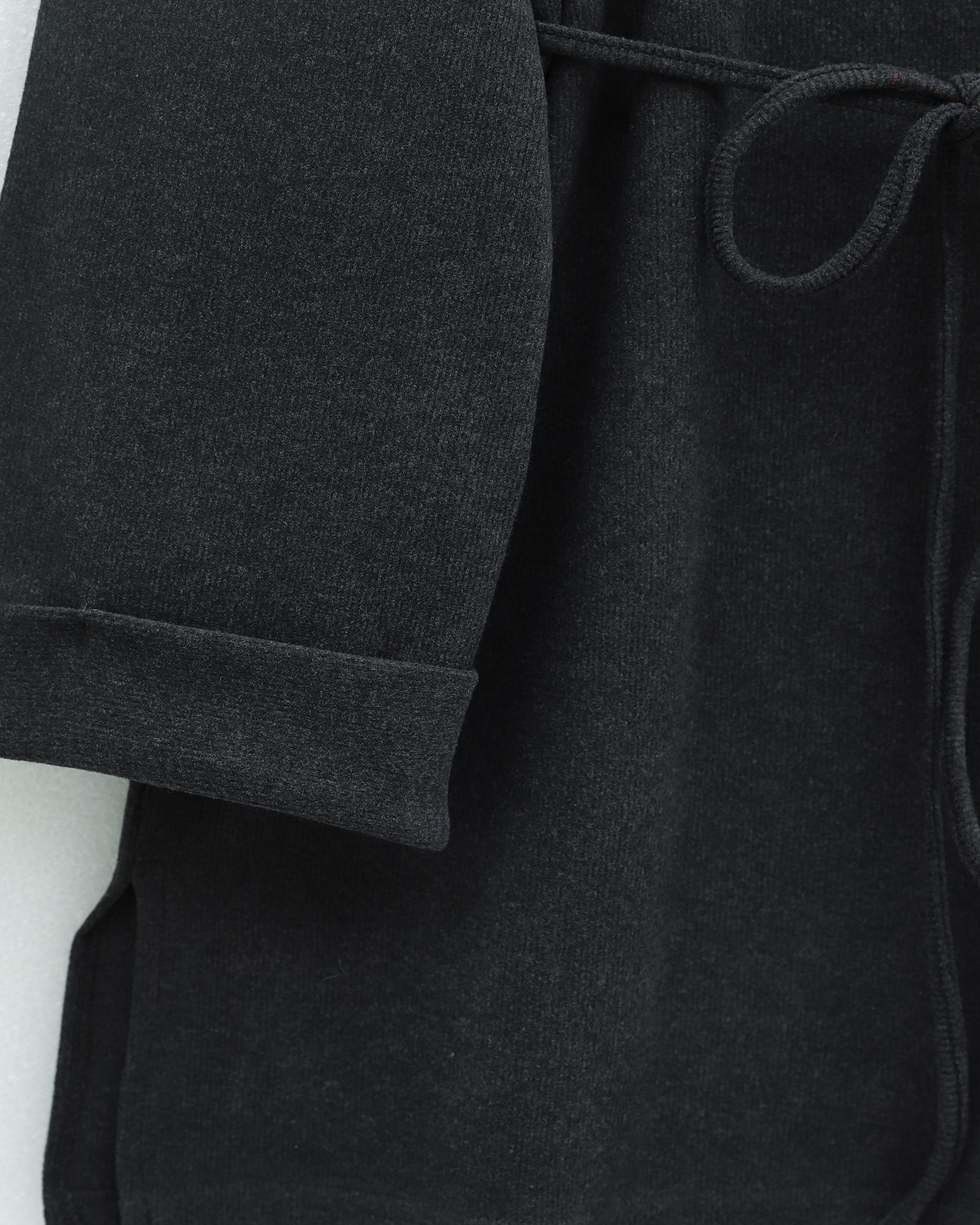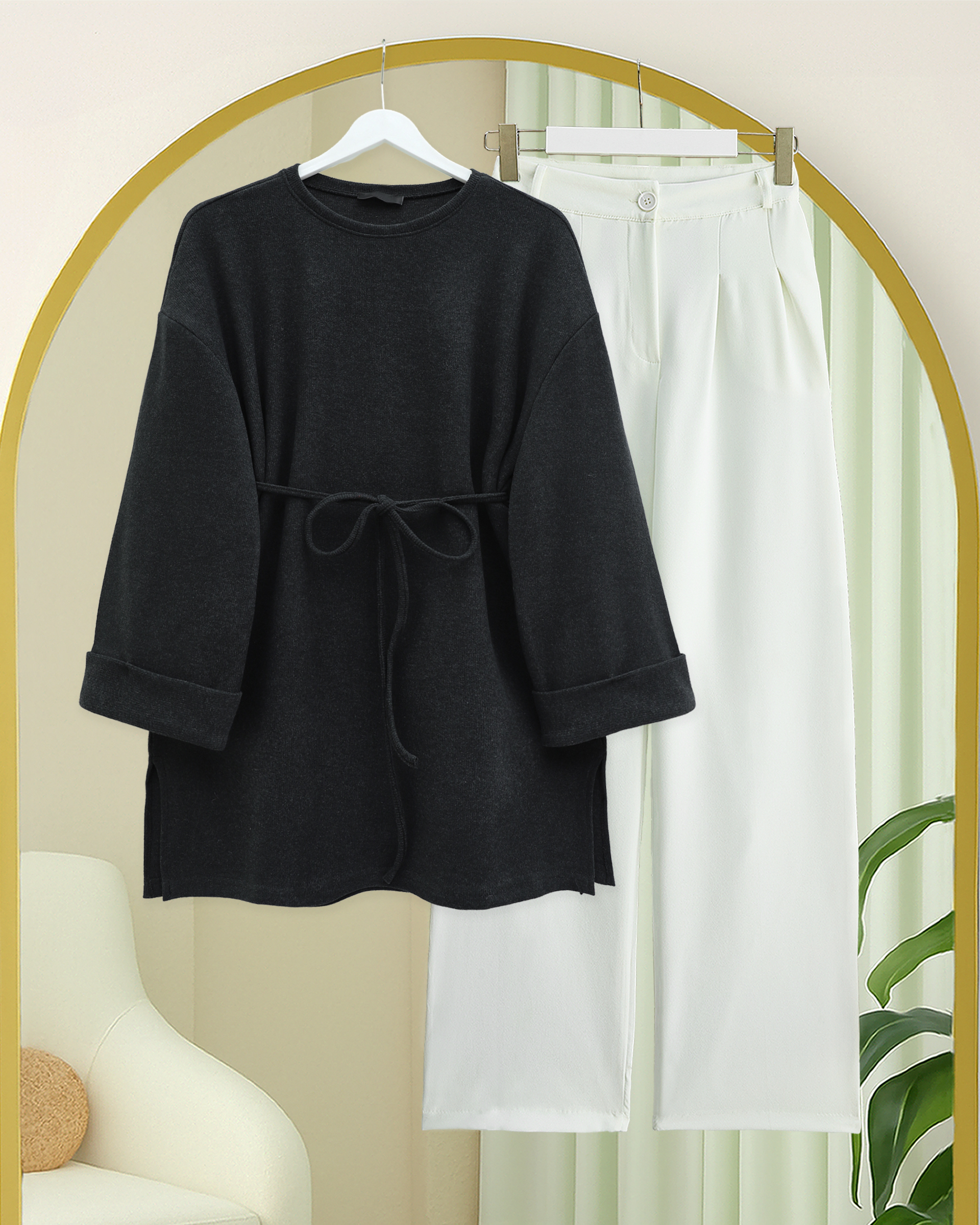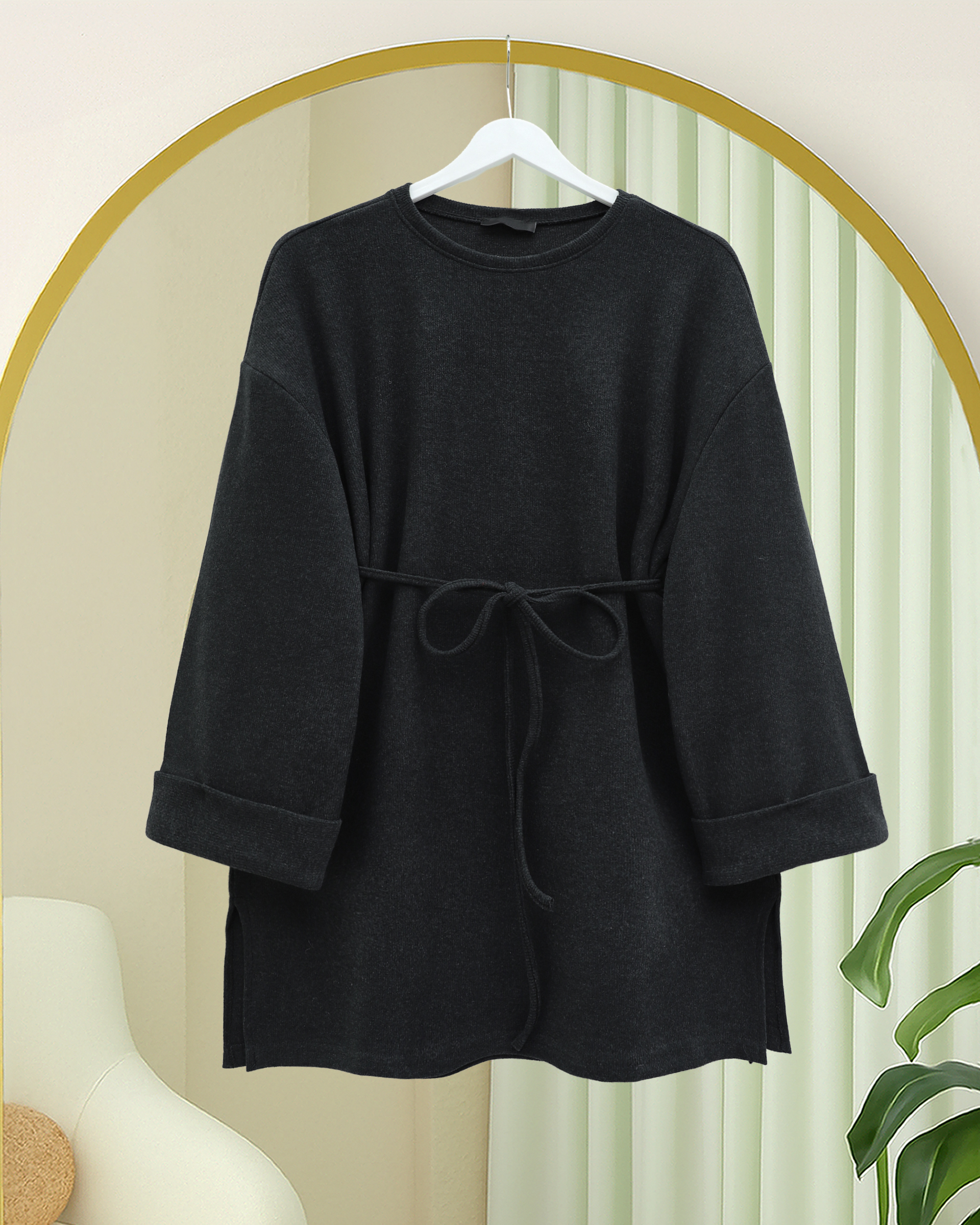 Selanik Tunic with Folded Sleeves and Tied Waist and Slit-Anthracite -