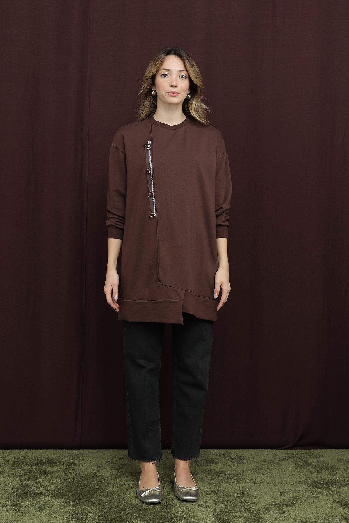 This tunic offers a feminine look with its embroidered details and a modern zipper design. It's an ideal choice for those seeking elegance and comfort in their everyday outfits.