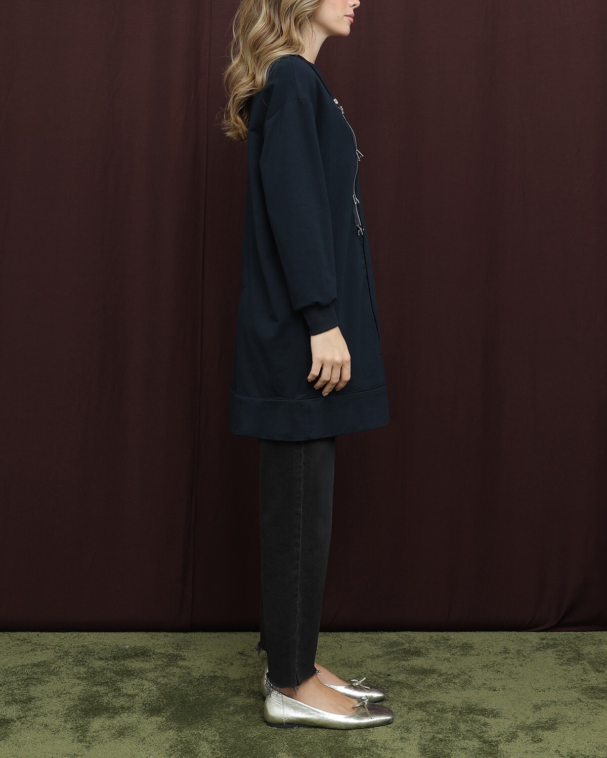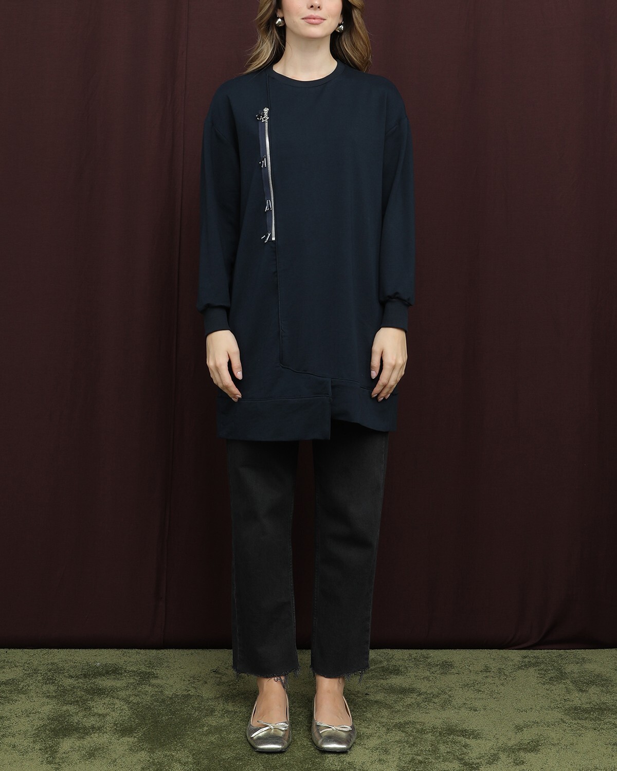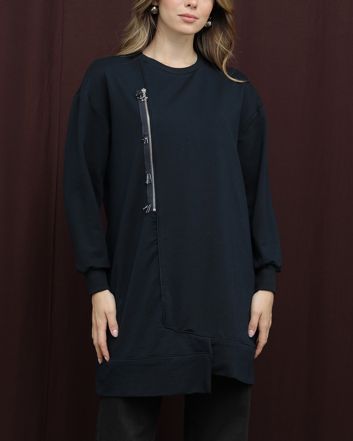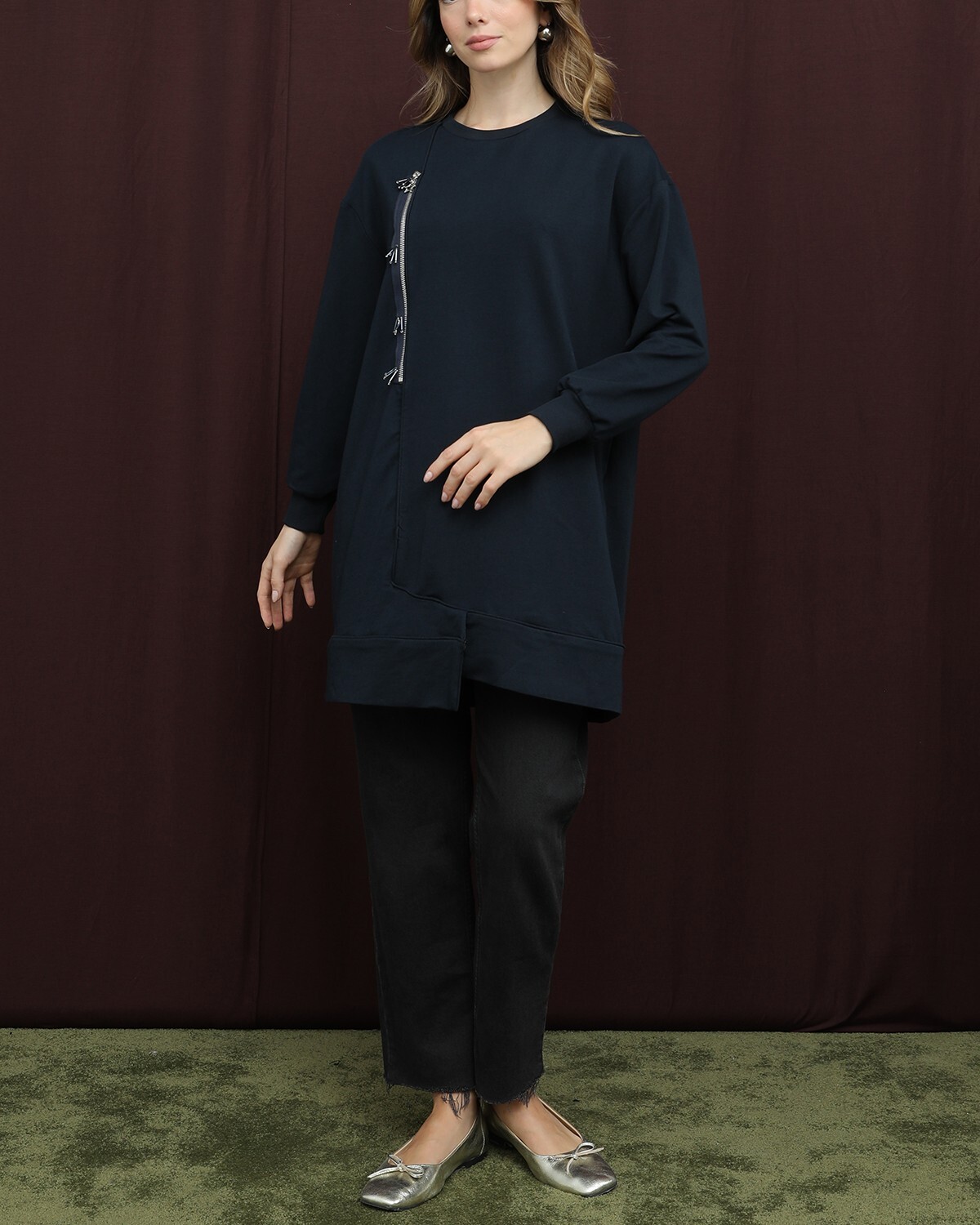 This tunic offers a feminine look with its embroidered details and a modern zipper design. It's an ideal choice for those seeking elegance and comfort in their everyday outfits.